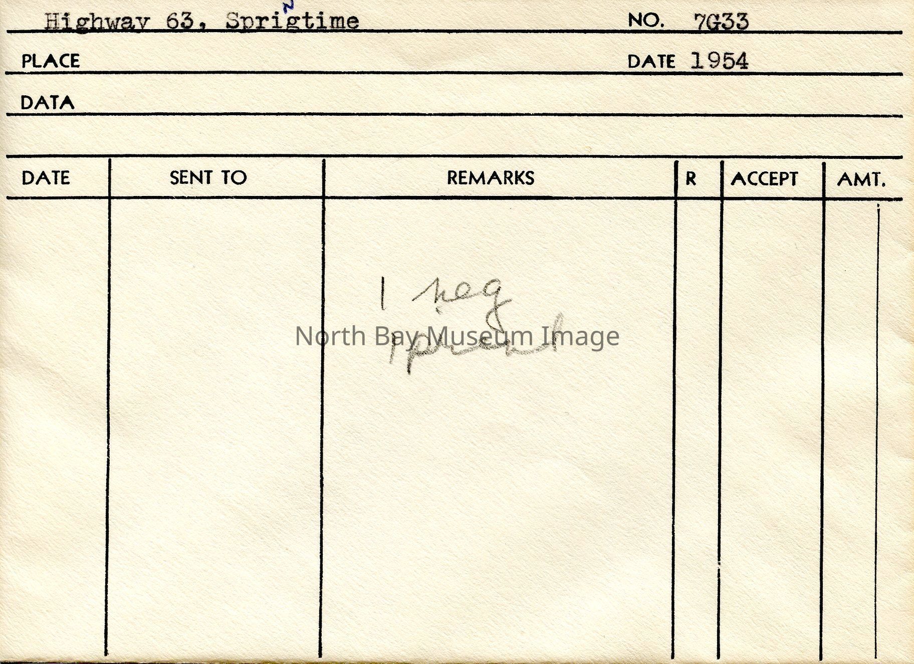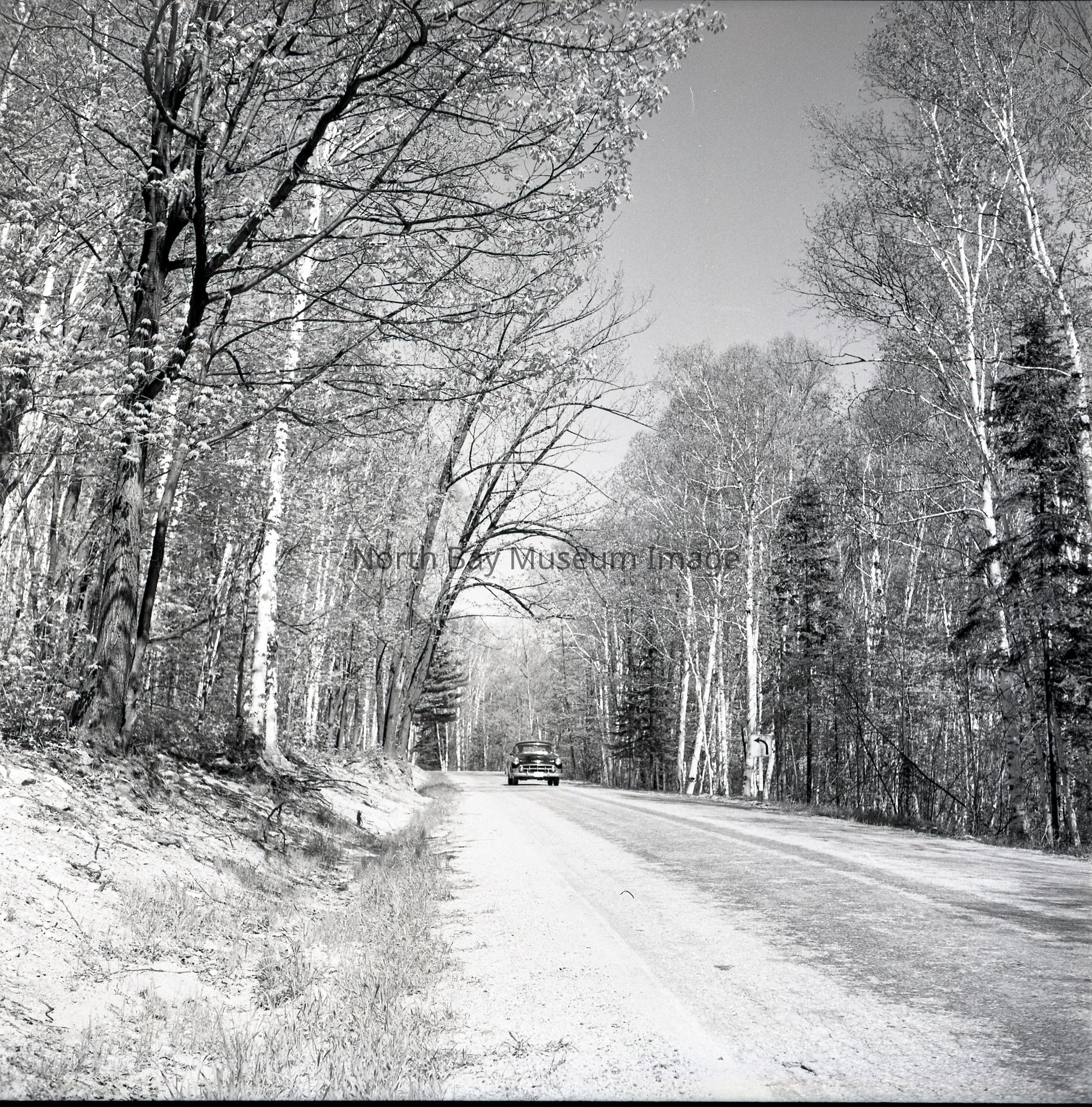 Envelope (a) contains the photographs and negatives (b-c) of a Highway 63 in the Springtime. The image is taken from the side of the highway watching a car approach on the highway. A part of the Forder Collection. The photographers original accession number is 7G33. All the publications of the images are written on the envelope.Creator