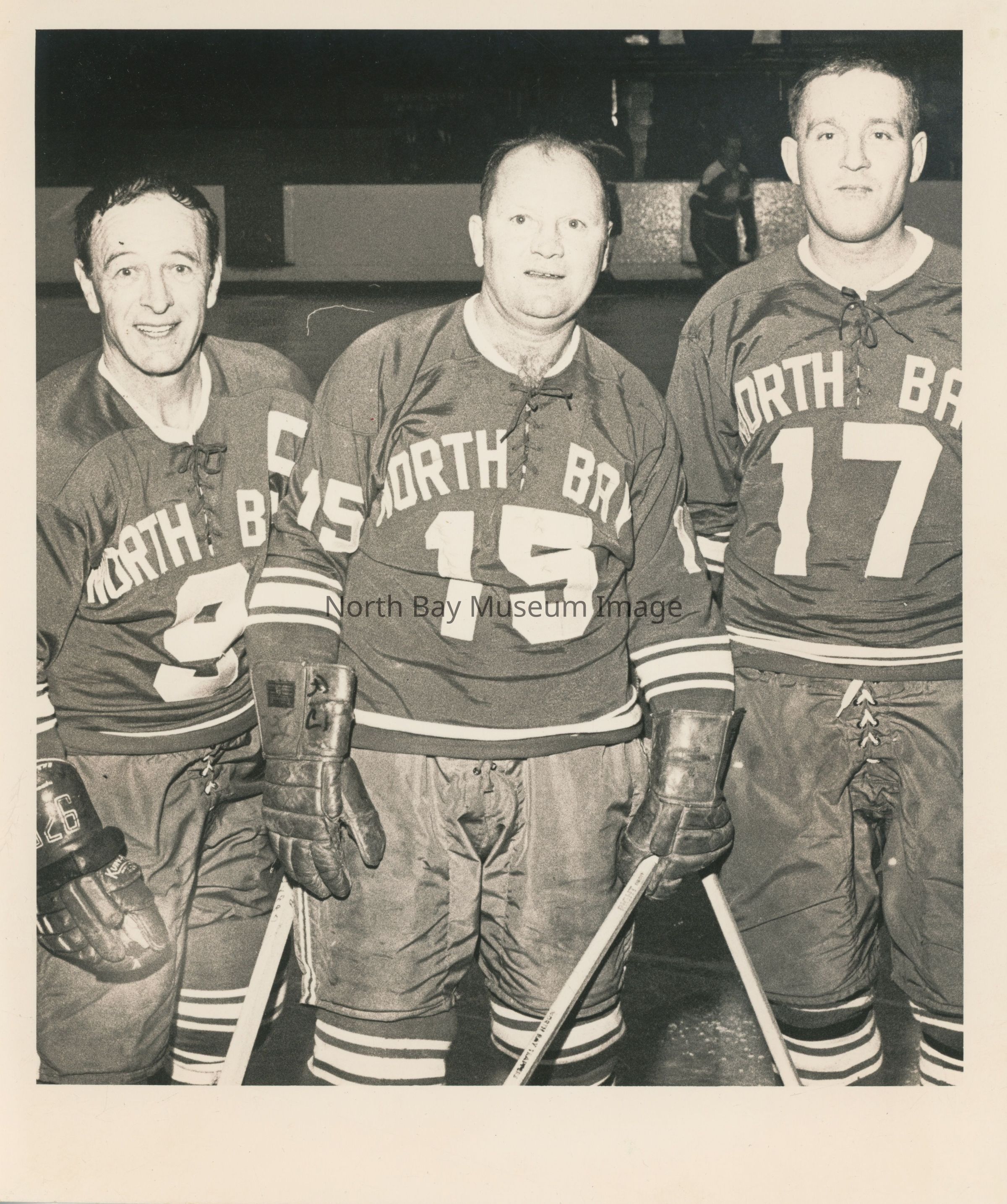Photo of North Bay Black Hawks. See Nugget article: "Old Timers nip Black Hawks in crowd-pleasing exhibition". Left to right: Willie Meloche, Chick Cecchini and Ken McNally.