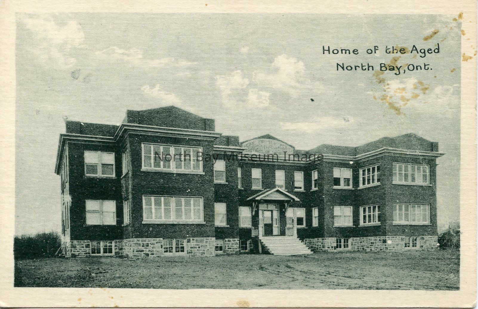 This is a black and white postcard entitled "Home of the Aged-North Bay." The building is 3 storeys. The foundation is a bricked foundation that is a different colour then the rest of the building. The entrance is a grand double door with white steps leading up to the front. There are big windows on all sides of the building. There is grass or dirt in front of the building.