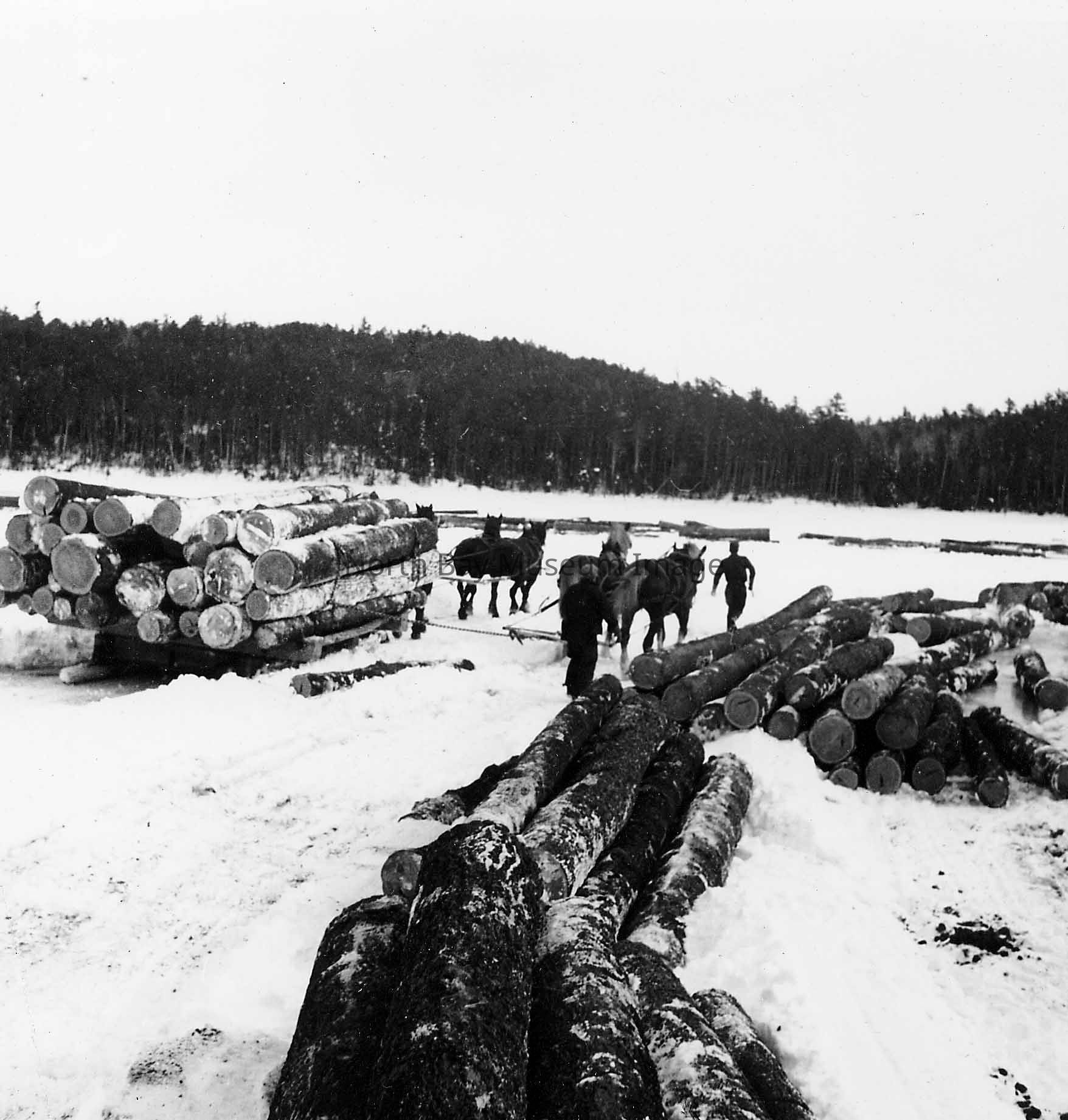 Black and white photographic print from John B. Smith & Sons Ltd. showing men preparing the logs for spring run. Teams of horses being used to haul logs onto frozen lake. Small white border frames the image.