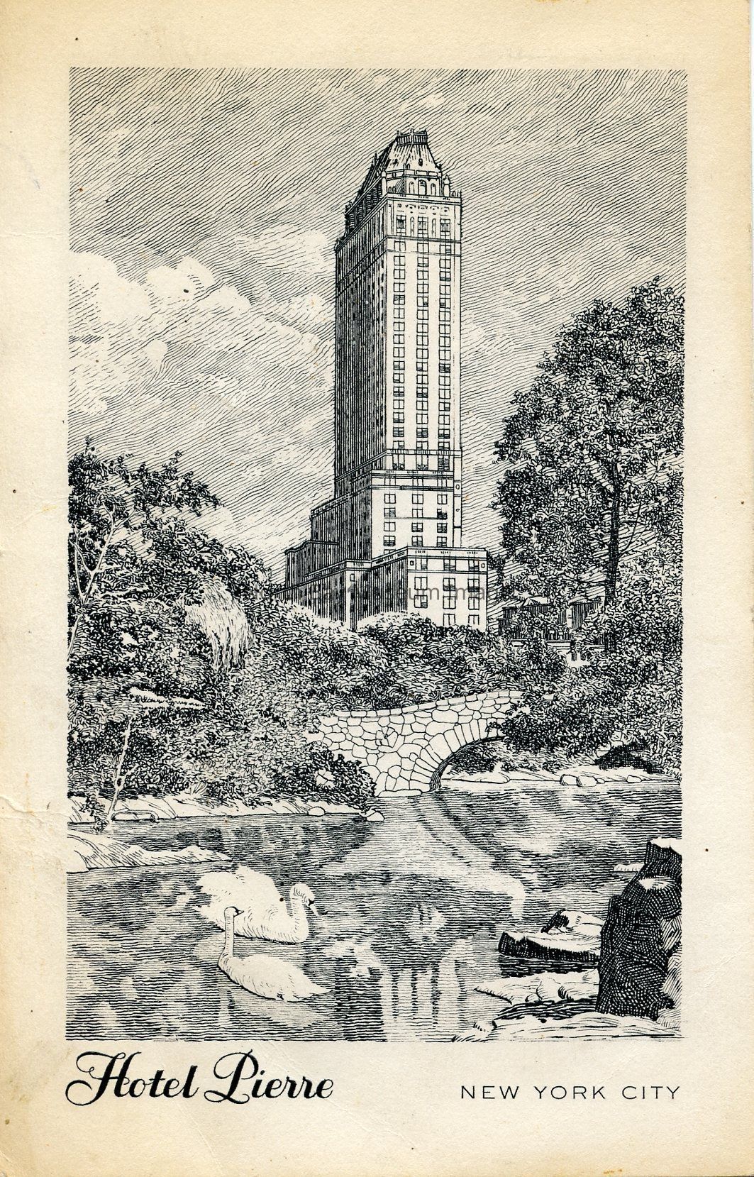 This is a black and white ink postcard from the Hotel Pierre in New York City. The picture is of a grand hotel and garden in front of the building. The photo is taken looking up at the hotel.