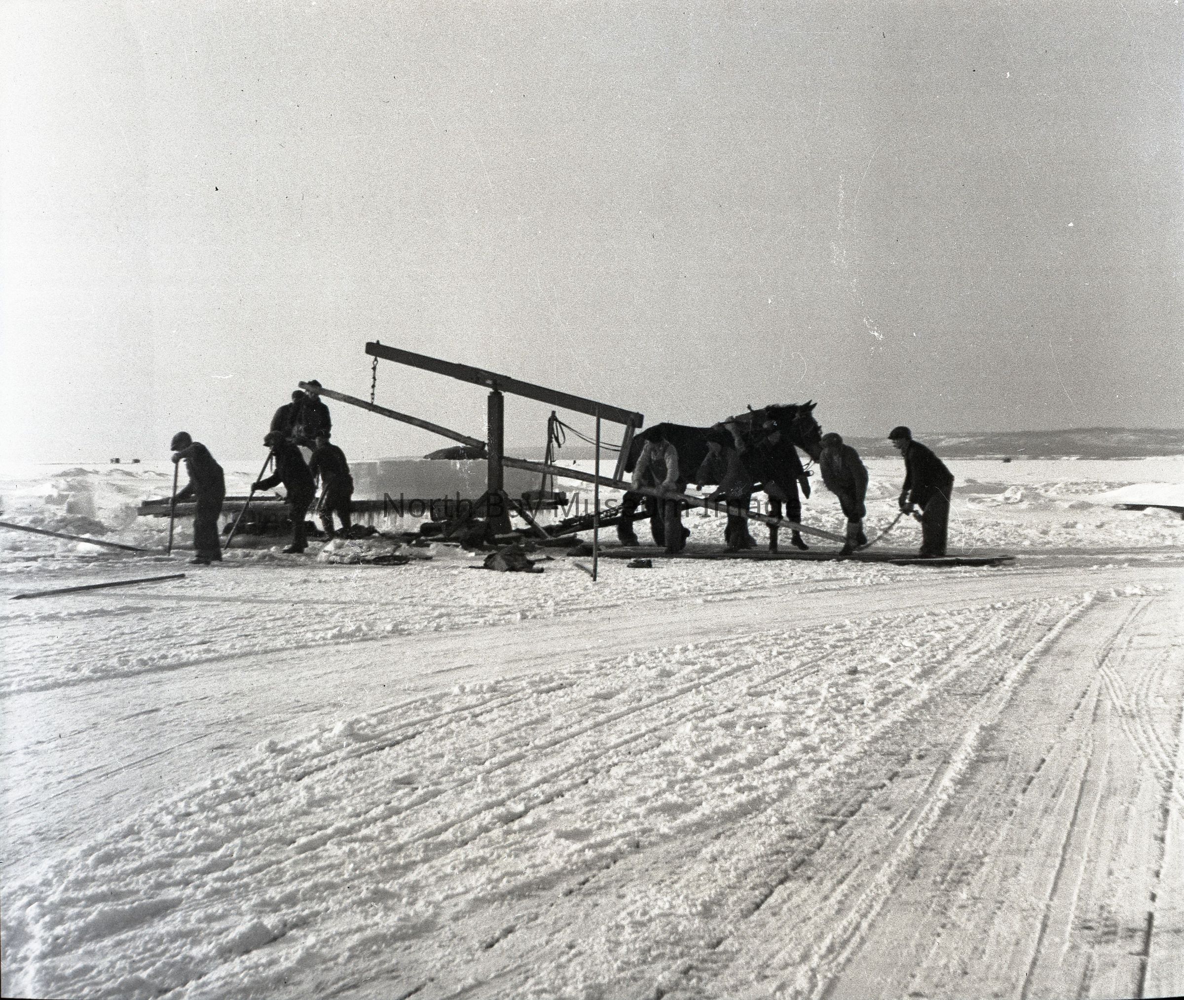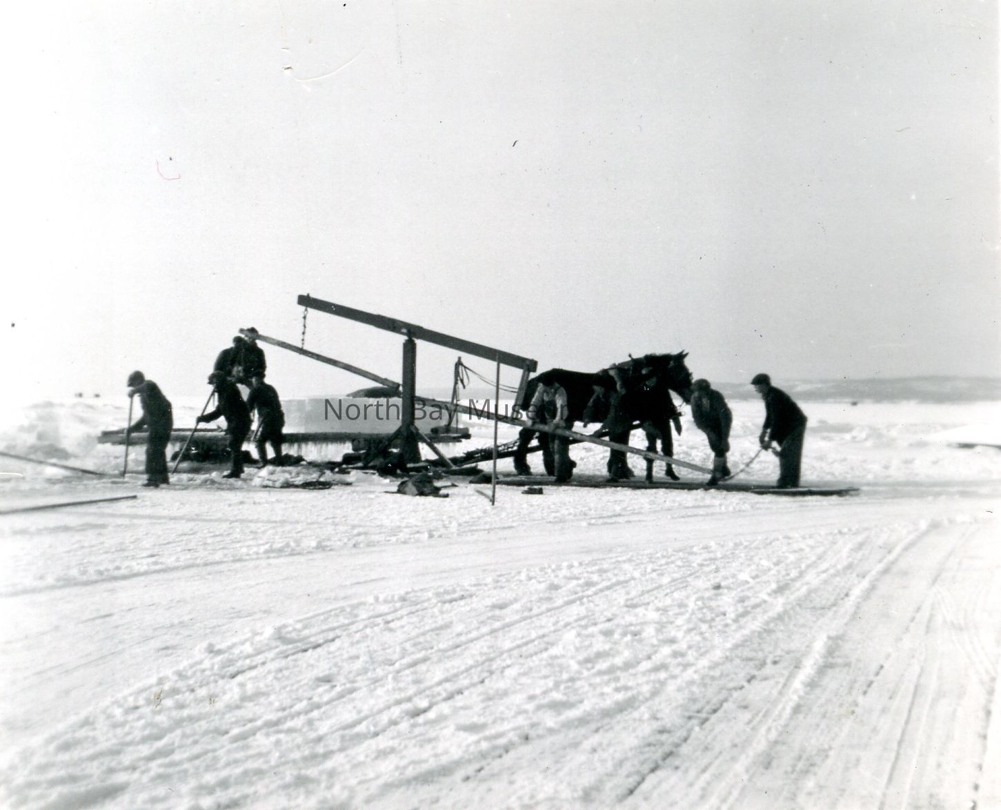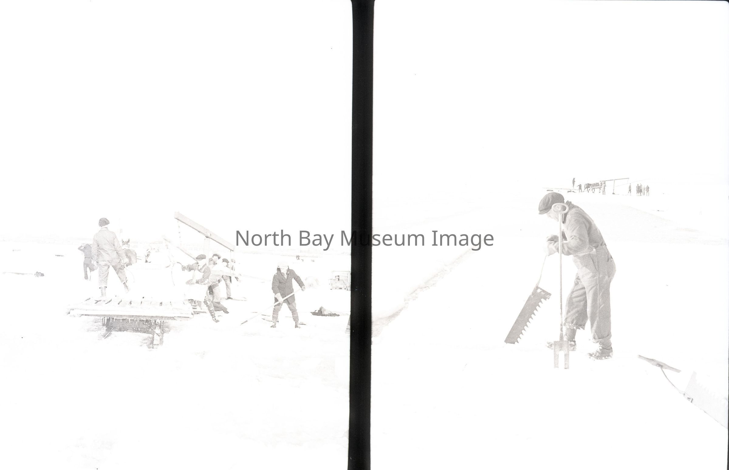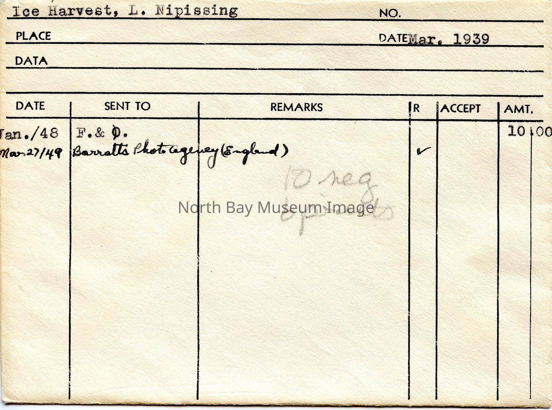 Envelope (a) containing photos and negatives (b-q) of Ice Harvest on Lake Nipissing. Photos include men removing ice, horses transporting ice, and related machinery. Photographer William Forder's original number was 85 A-G. Places published are printed on the front of the envelope.Creator
