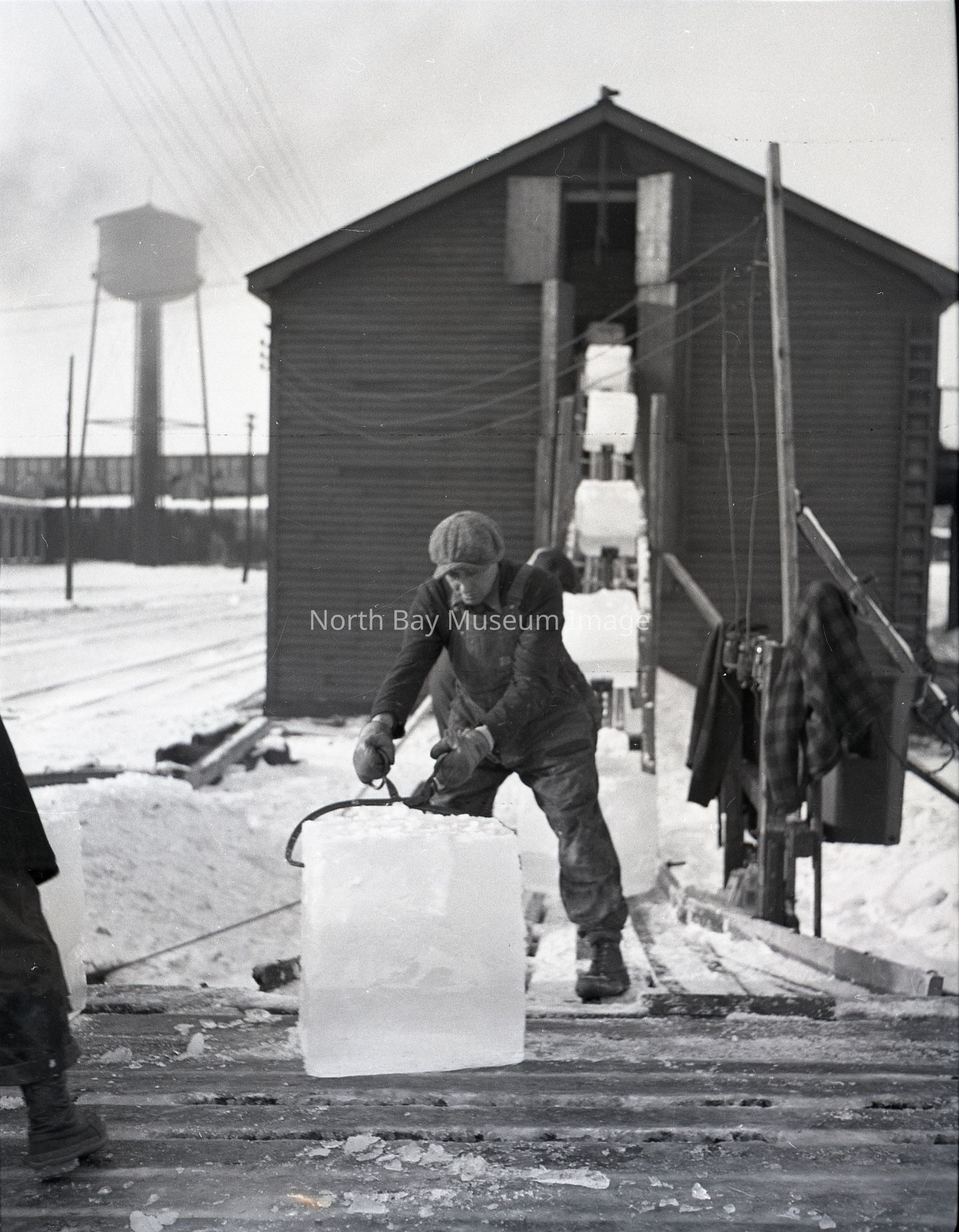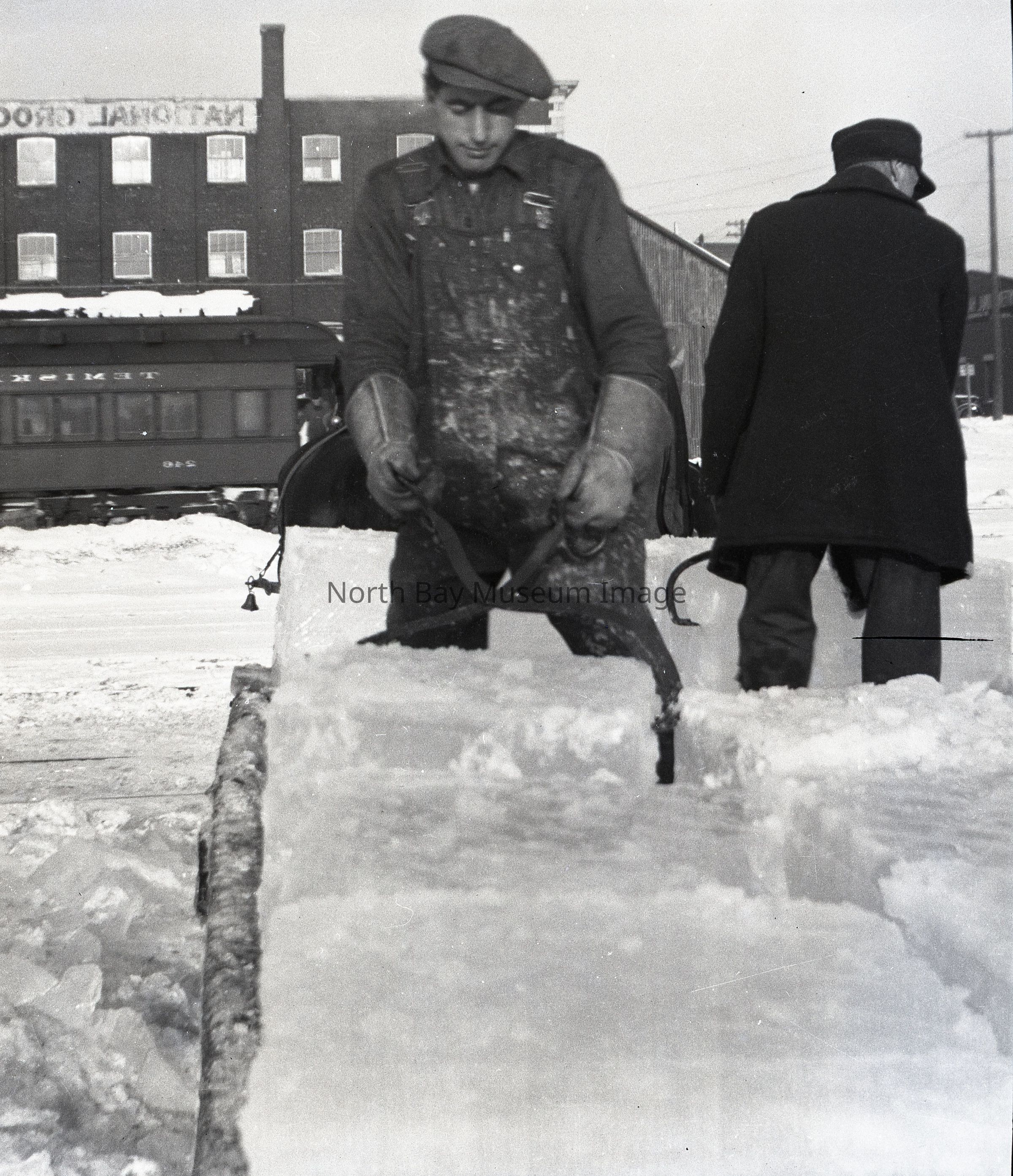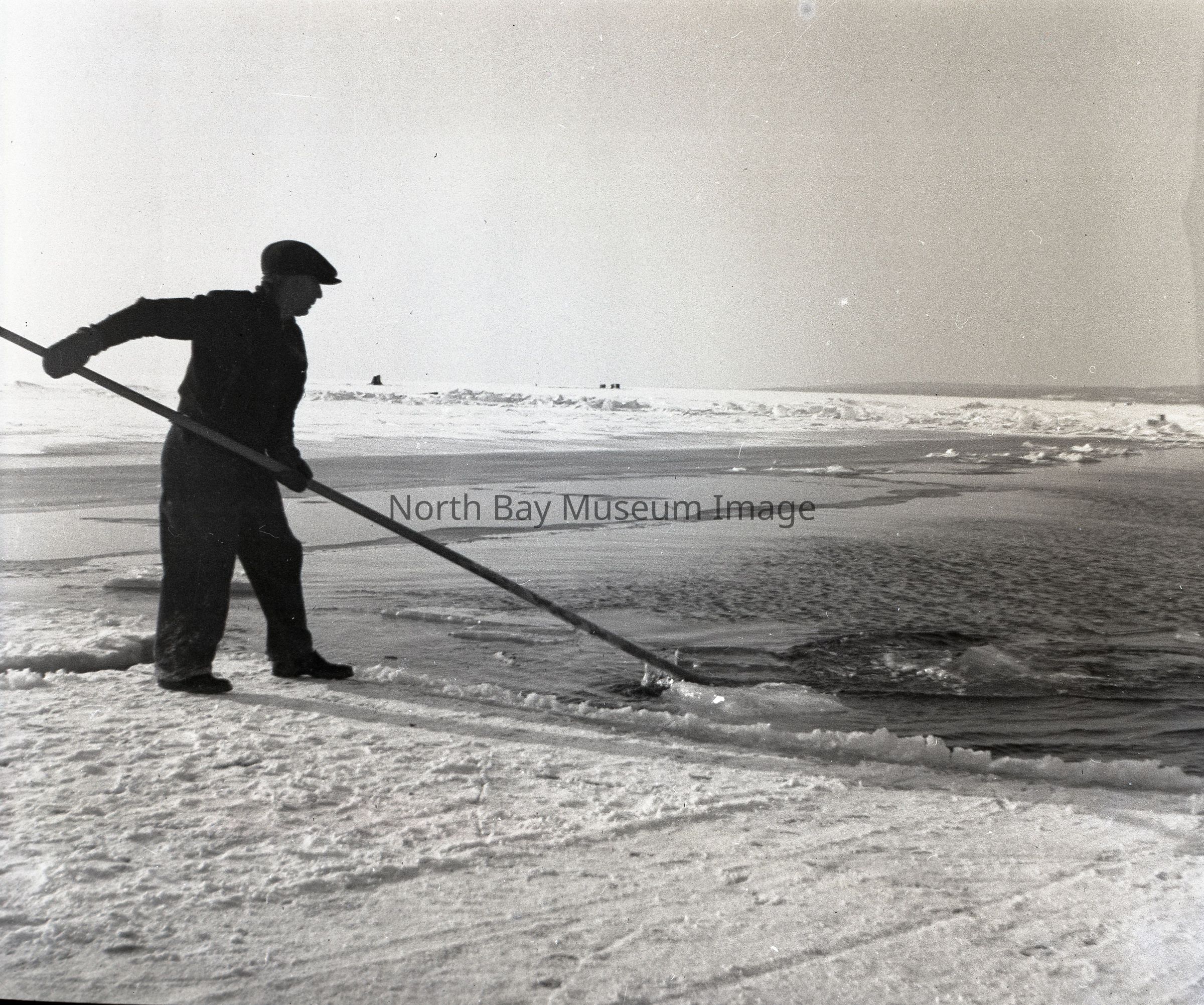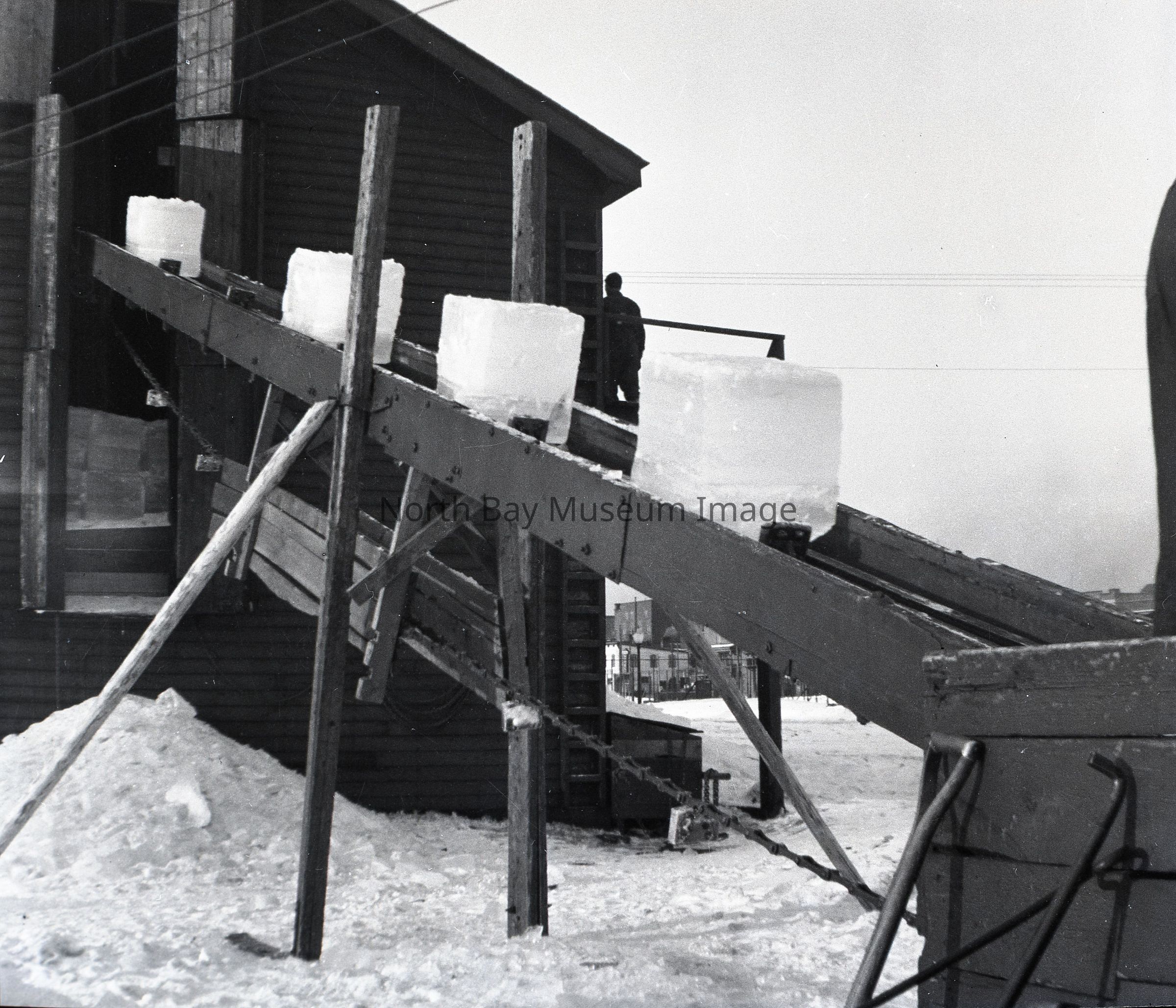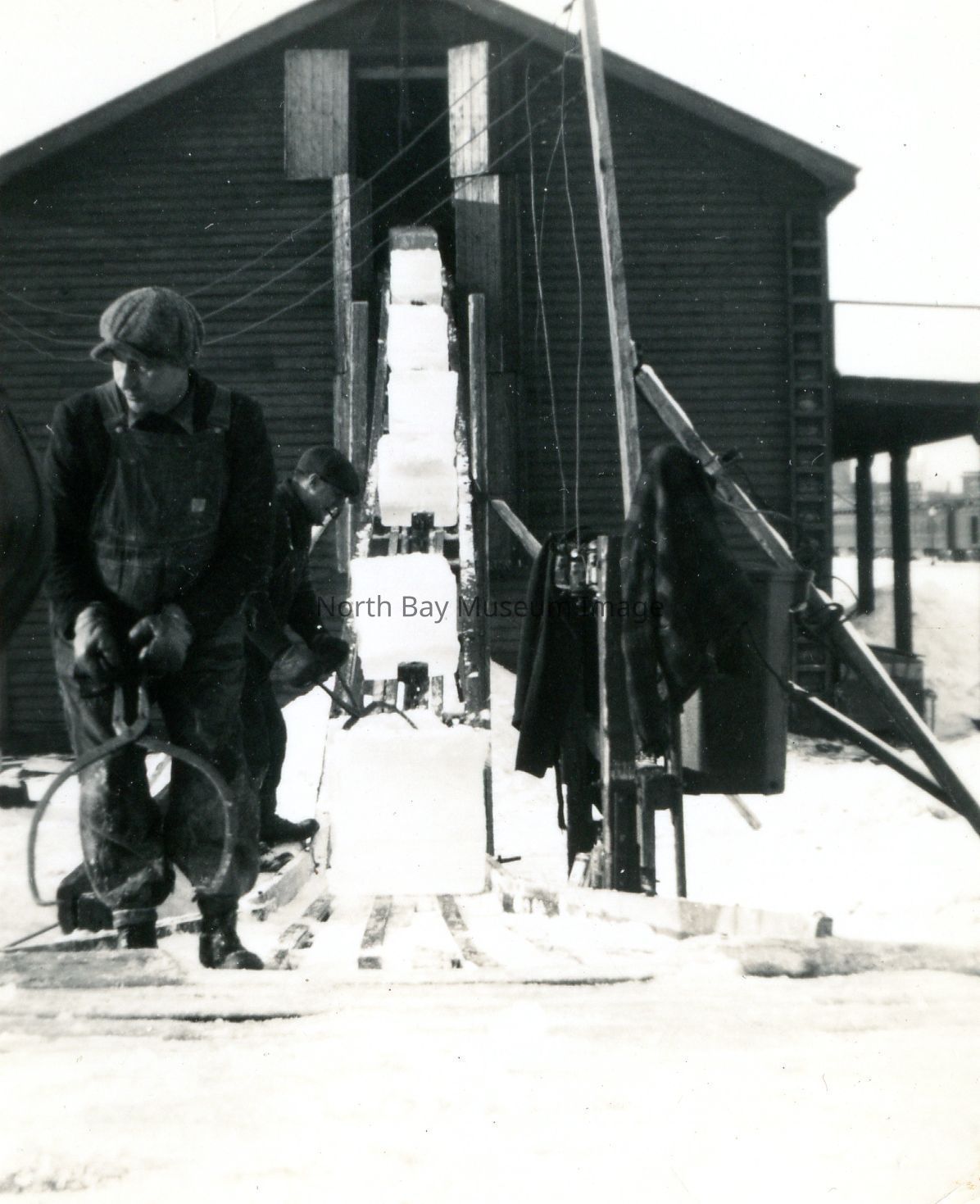 Envelope (a) containing photos and negatives (b-q) of Ice Harvest on Lake Nipissing. Photos include men removing ice, horses transporting ice, and related machinery. Photographer William Forder's original number was 85 A-G. Places published are printed on the front of the envelope.Creator