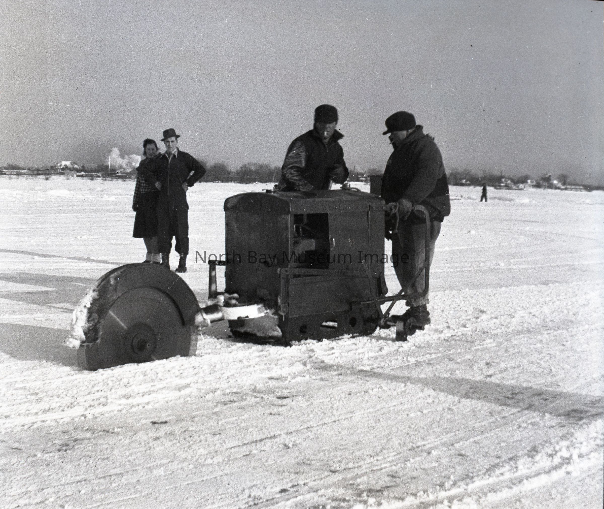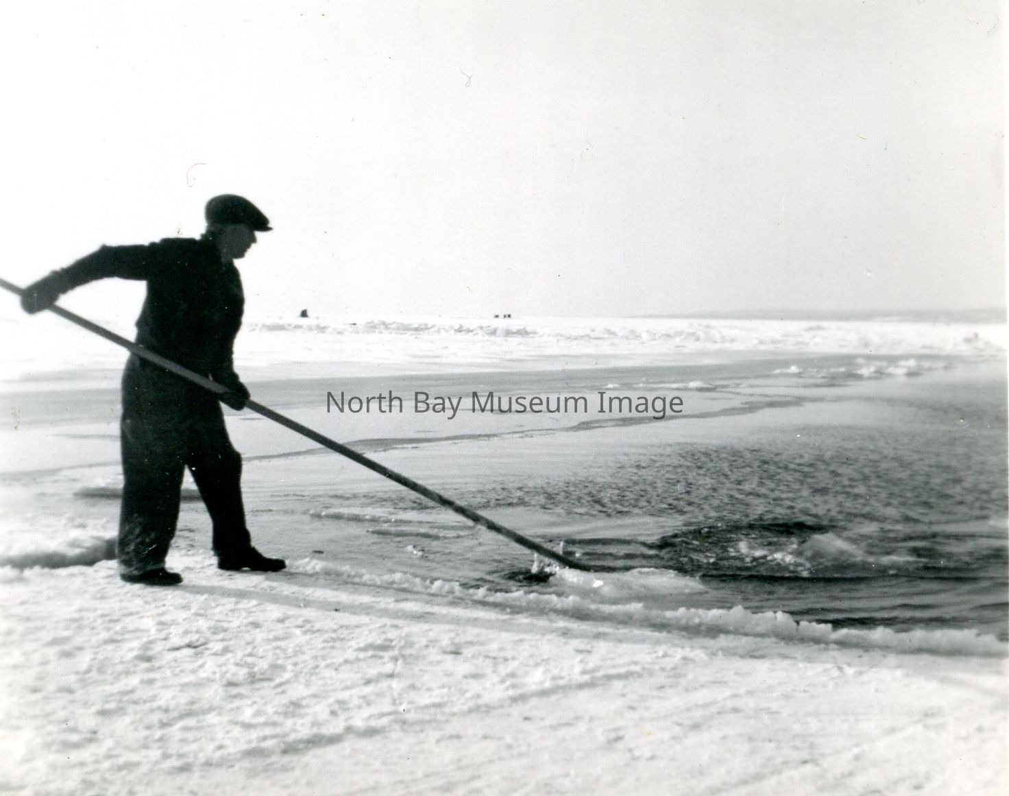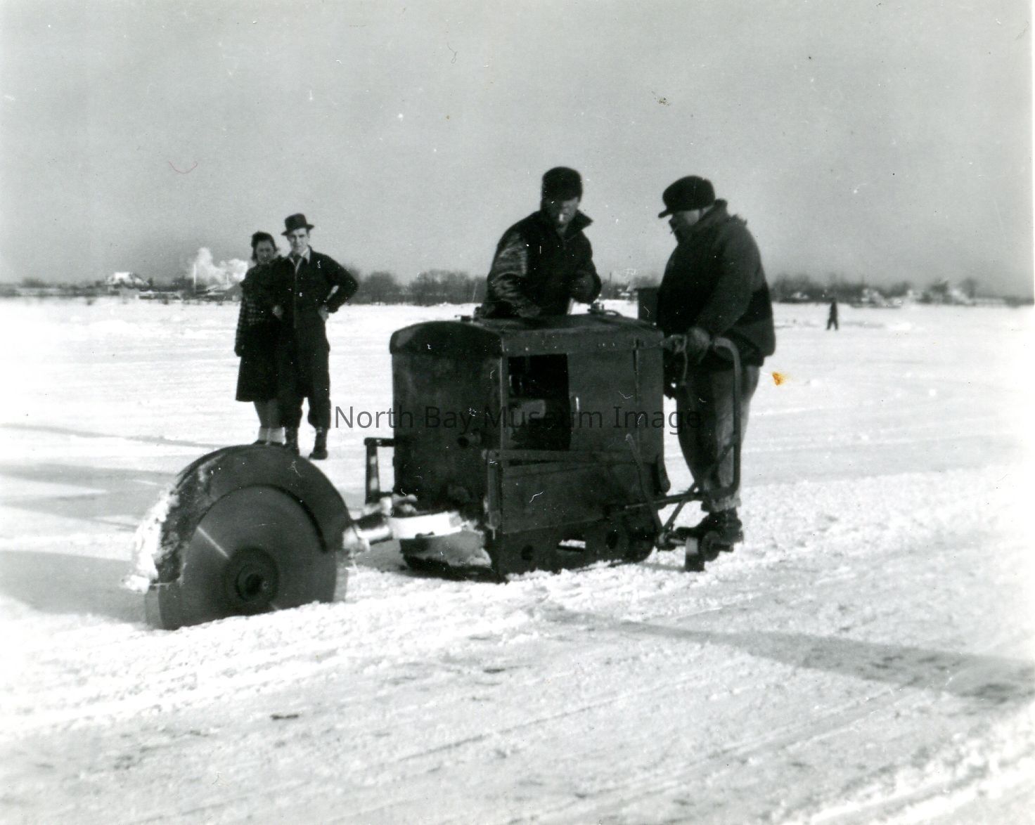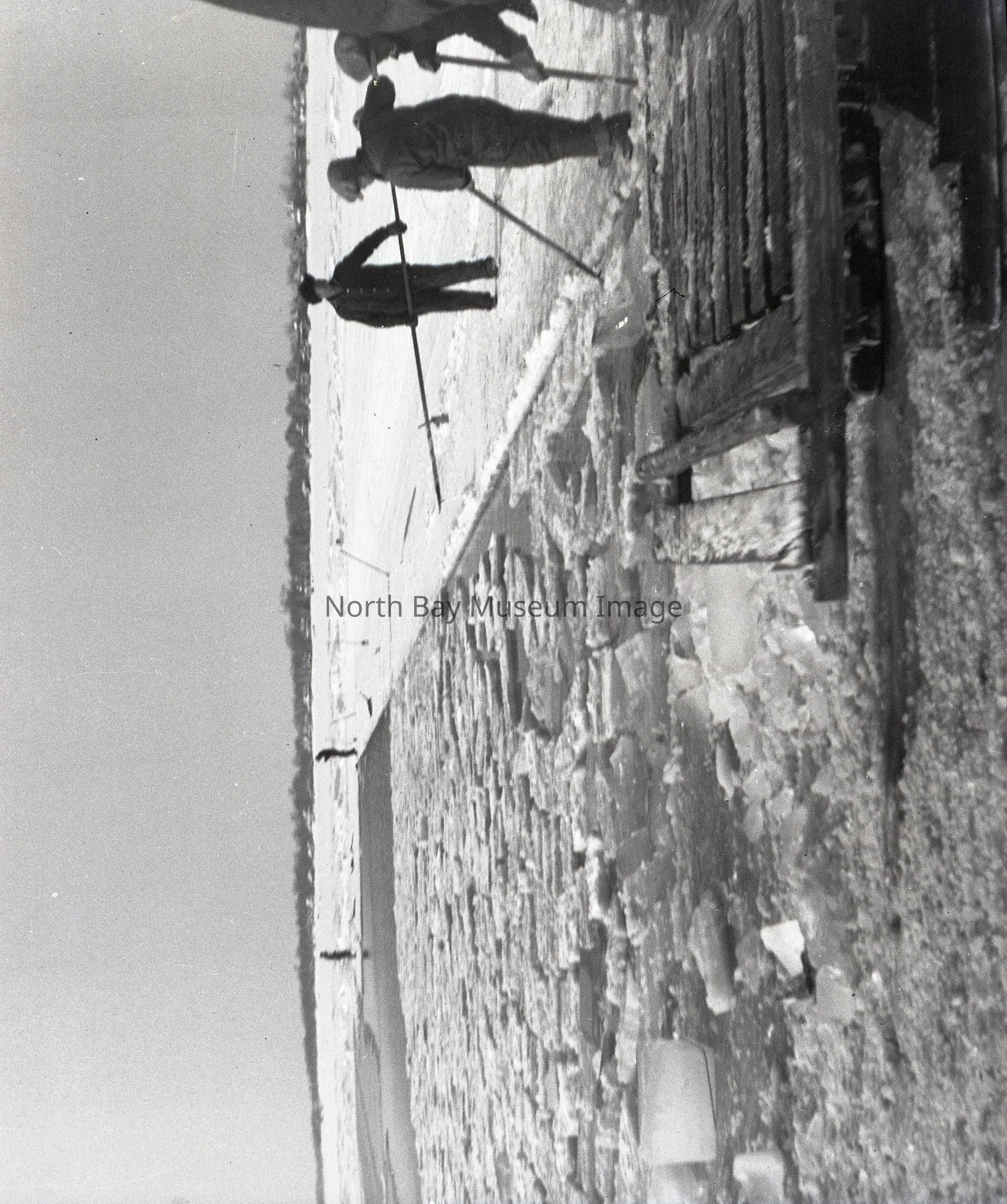 Envelope (a) containing photos and negatives (b-q) of Ice Harvest on Lake Nipissing. Photos include men removing ice, horses transporting ice, and related machinery. Photographer William Forder's original number was 85 A-G. Places published are printed on the front of the envelope.Creator