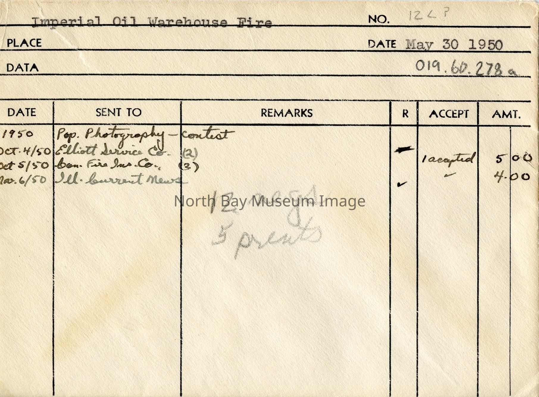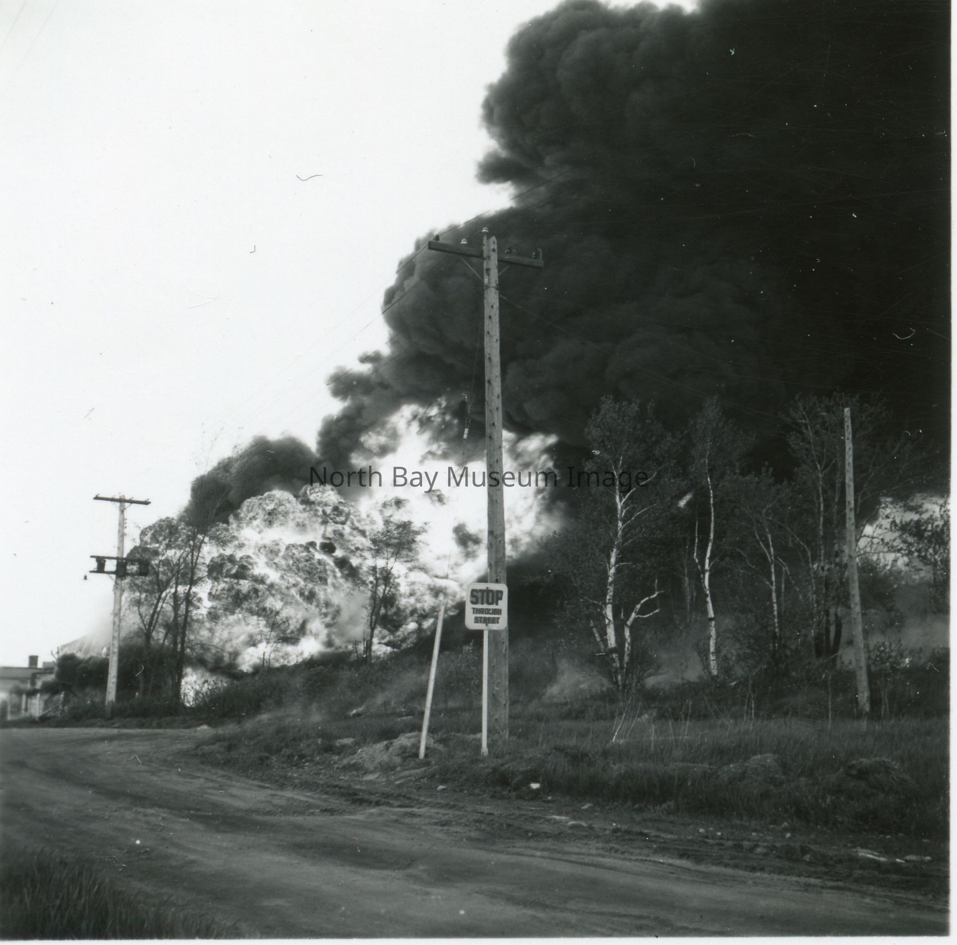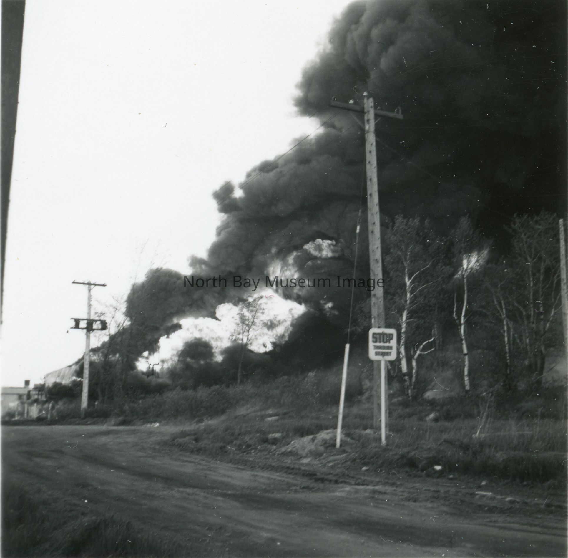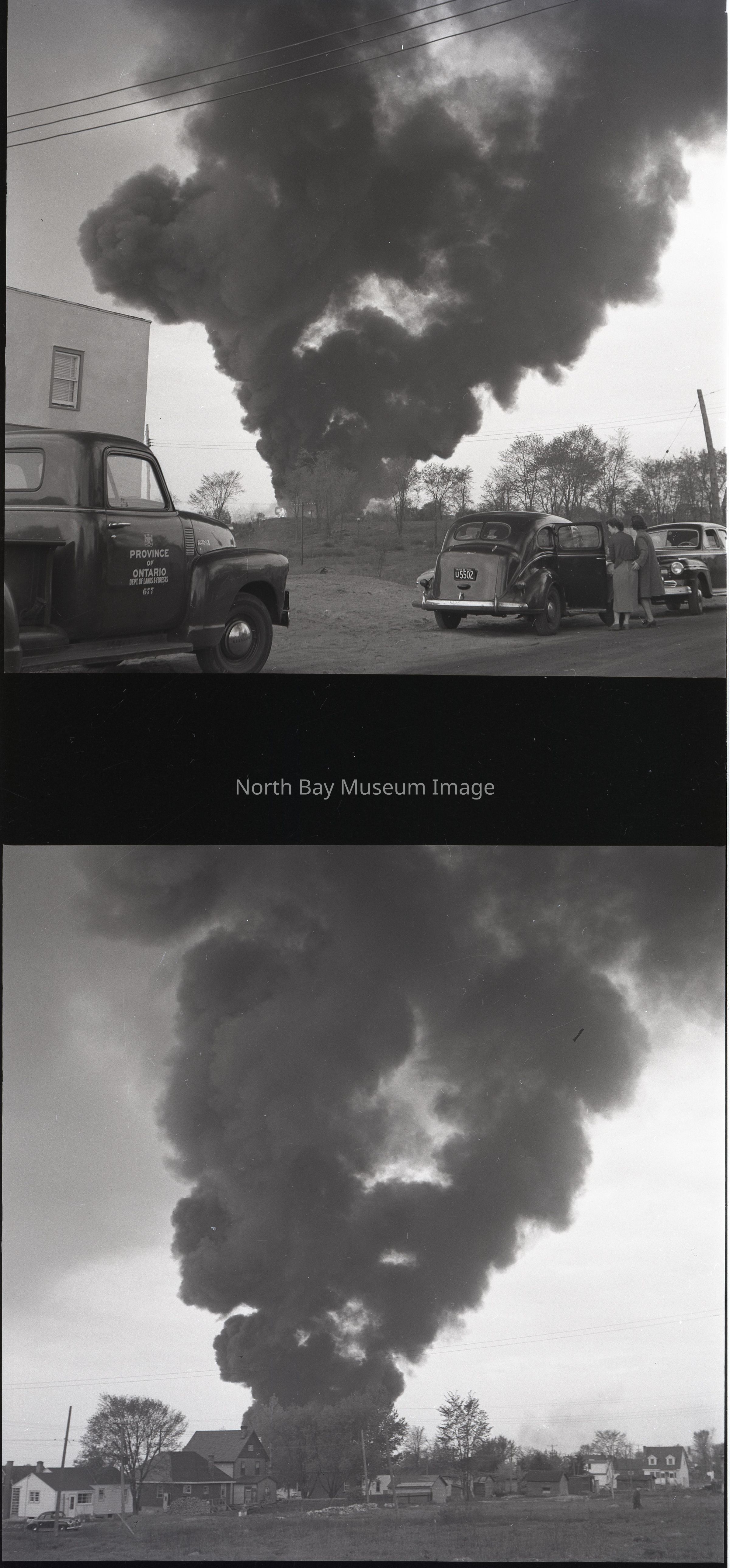 Envelope (a) contains pictures and negatives (b-r) of the Imperial Oil Warehouse Fire in North Bay on May 30, 1950.