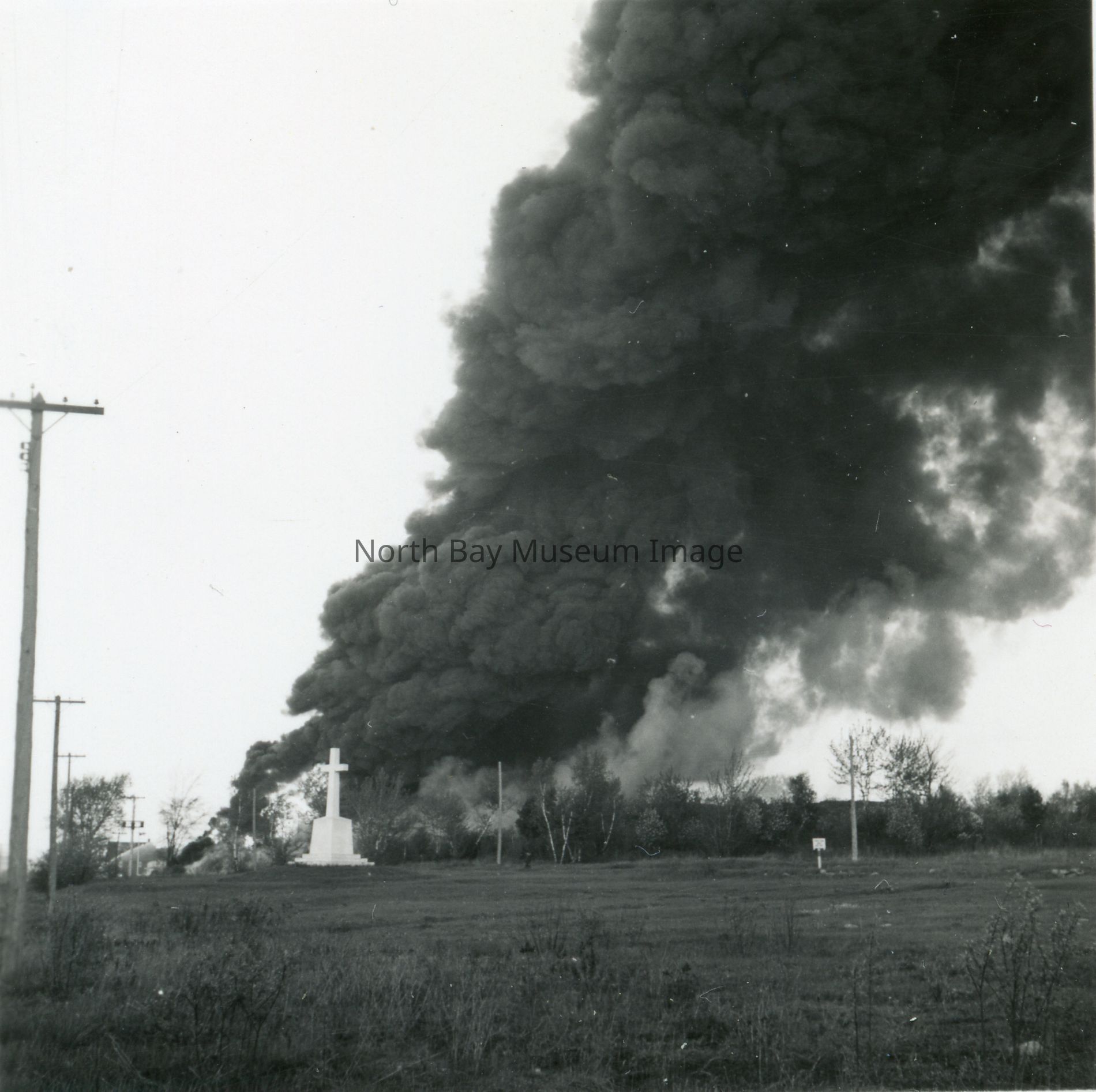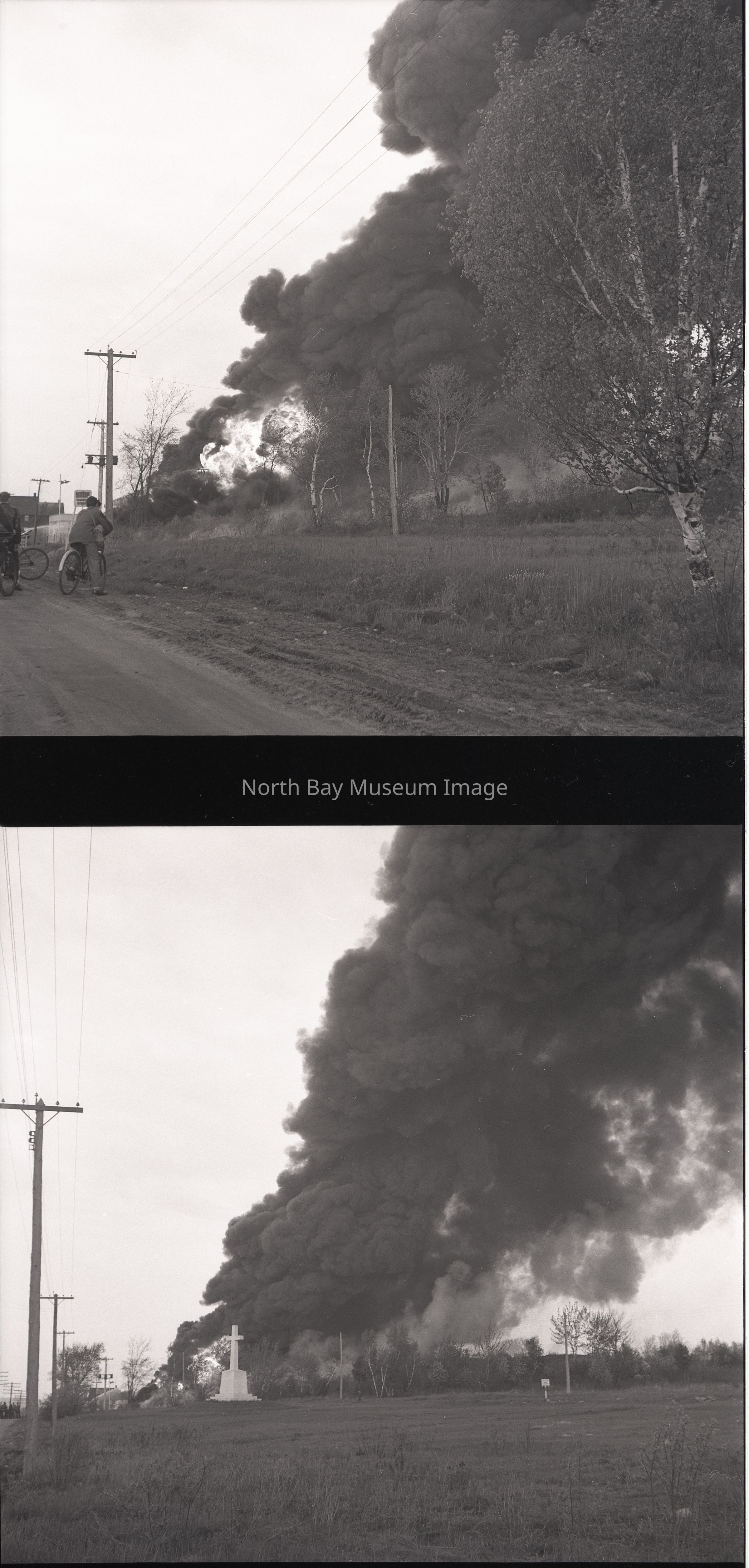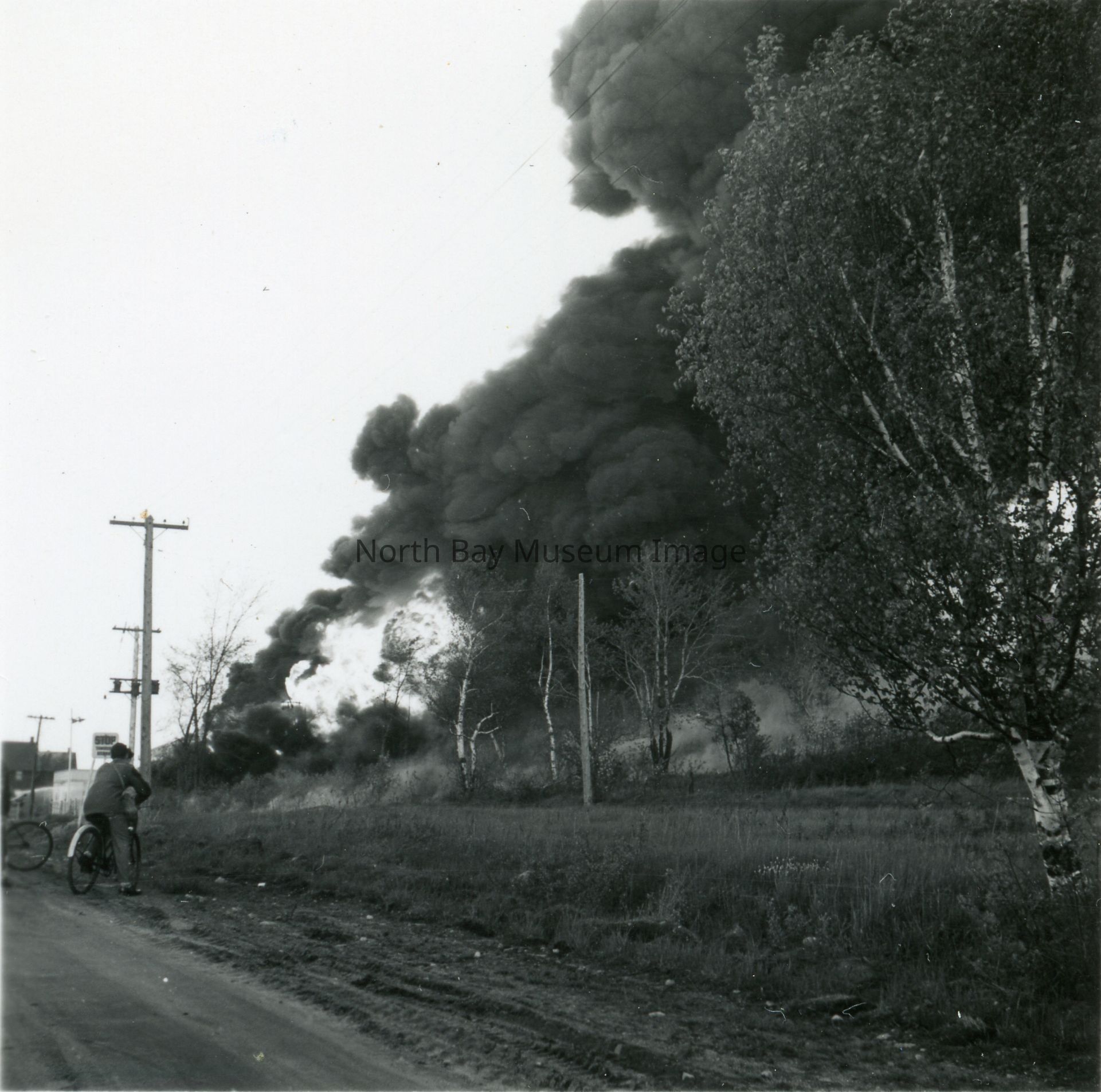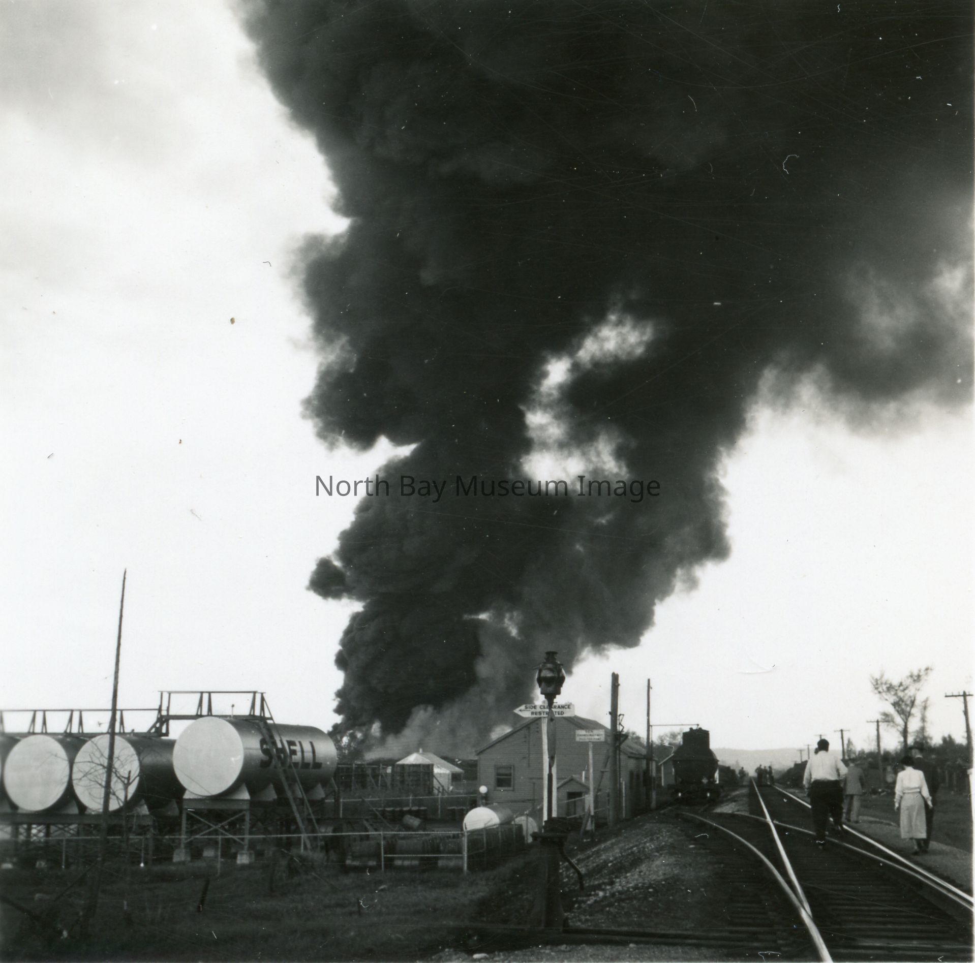 (b/c) Contains two negatives, photo taken from the road, both showing large amounts of smoke bellowing from the warehouse. Seen through trees. (d/e) Contains two negatives as well, both showing the smoke from the fire, pictures taken from different angles. (f/g) Contains two negatives, pictures taken from the train tracks next to warehouse. Negatives show smoke form fire, as well as large Shell gasoline containers outsde. (h/i) Contains two negatives, which seem to be taken from a field next to the fire Once more the negatives show large amounts of smoke from the fire. (j/k) Contains two negatives, taken from close up to the fire. You can see lots of smoke, as well as people standing in front of the camera looking at the fire, with a fireman spraying water at the fire. (l/m) Contains two negatives of the smoke from the fire. (l) shows a line up of fire dept. vehicle. Picture (n) is the print of (b). Picture (o) is print of (g). Picture (p) is print of (c). Picture (q) is print of (d). Picture (r) is print from (e). A part of the Forder Collection. All the publications of the images are written on the envelope.Creator