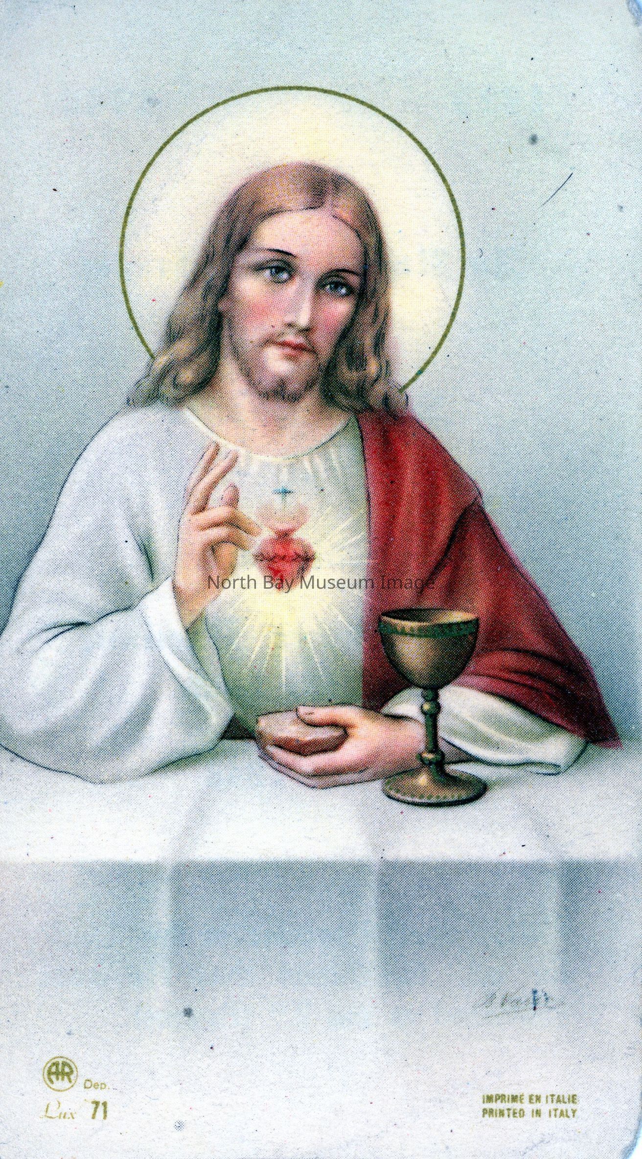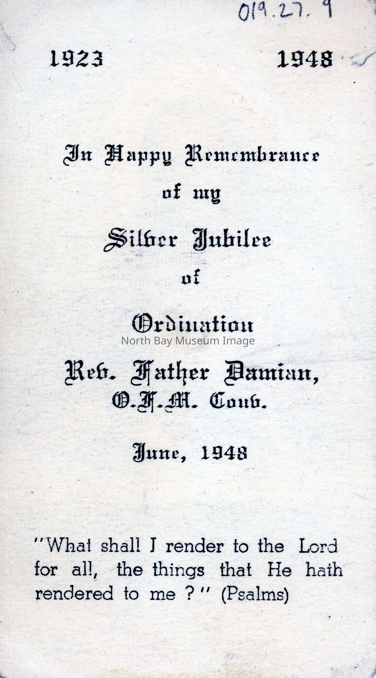 Souvenir card from the silver jubilee of ordination of Rev Father Damian. Date 1923 is printed in the top left corner and 1948 on the top right corner. Bible verse printed below and image of Jesus on reverse.