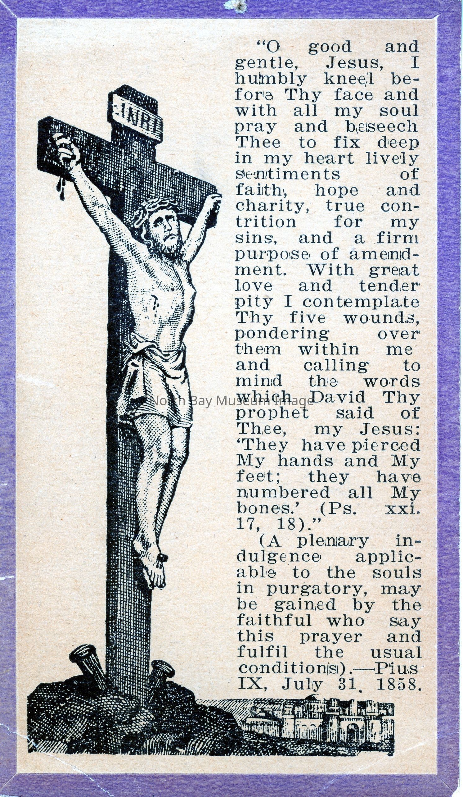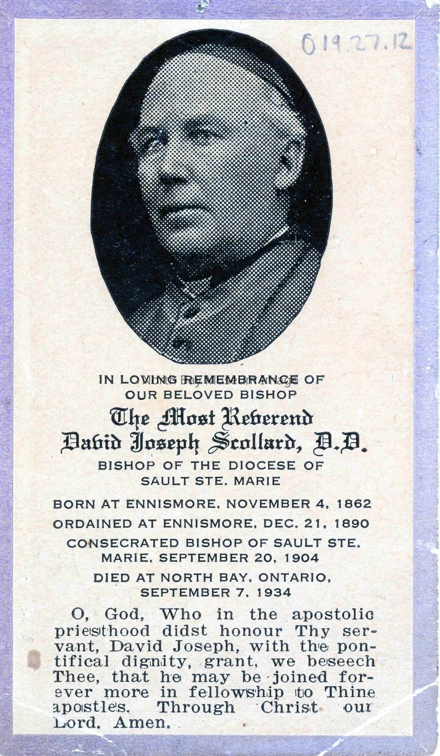 Card in remembrance of David Joseph Scollard (possibly from funeral). Image of Bishop Scollard at top with biographical details and prayer at bottom. Born at Ennismore 1862, Ordained at Ennismore, 1890. Consecrated Bishop of Sault Ste. Marie 1904. Died in North Bay September 7, 1934