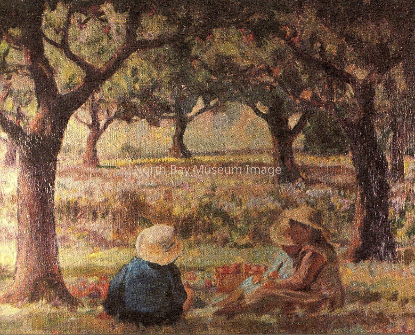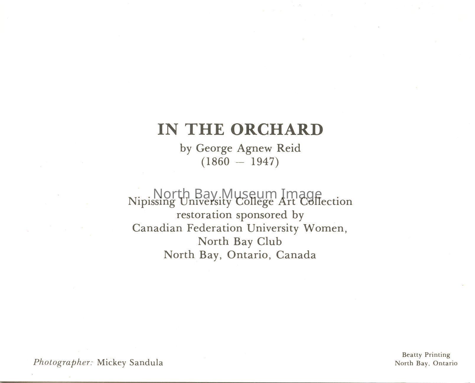 This is a postcard with picture on front. The Picture is called "In The Orchard." The illusrated watercolour image is of a orchard full of trees. There are two people sitting in the orchard. The Picture is done by George Agnew Reid (1860-1947). This postcard is printed by Beatty Printing.Creator