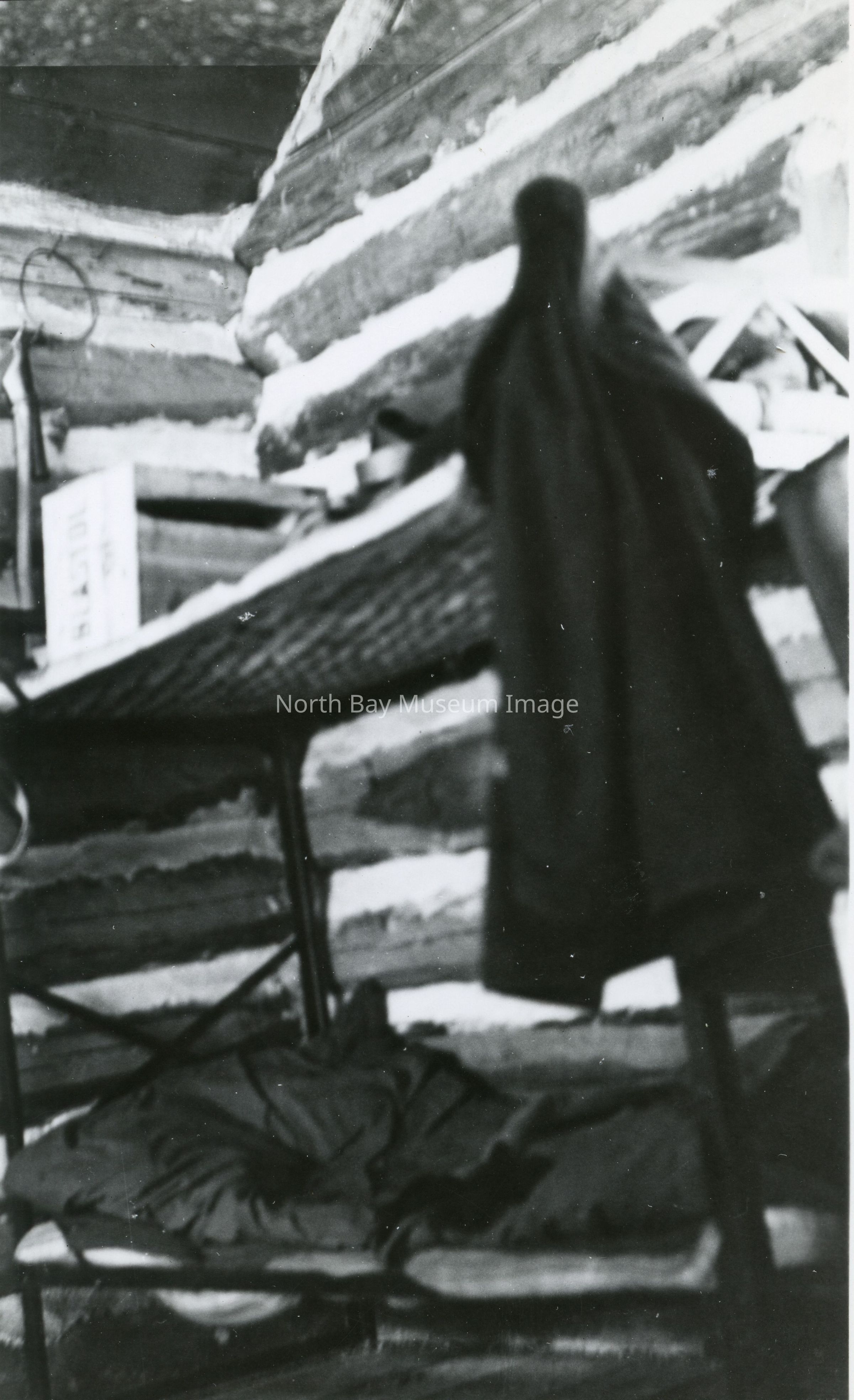 Black and white photograph, out of focus picture of interior of wooden cabin that shows a metal bed with various personal articles on it. A part of Gordon Collection.