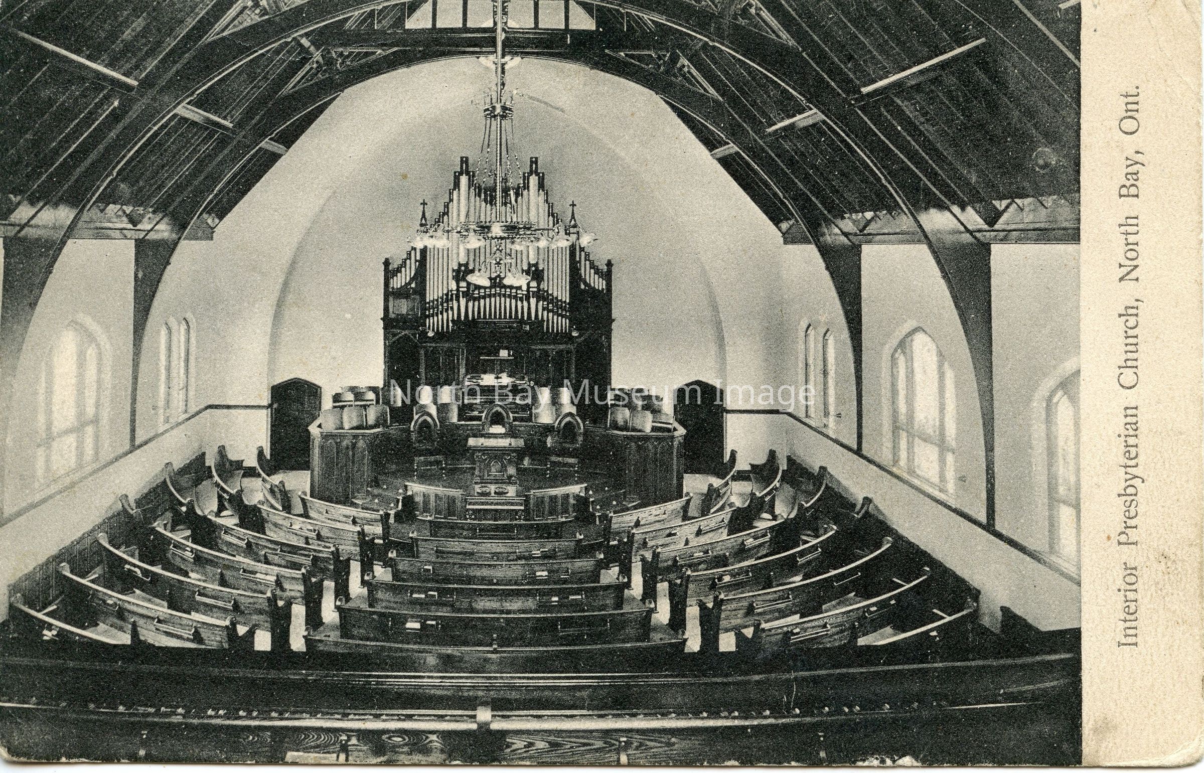 B&W photo of interior St. Andrew's Presbyterian Church, located at 399 Cassells St. at Algonquin (now St. Andrew's United Church). Postcard dates from 1907 so this shows the church's interior much as it would have appeared right after construction in 1904-05. Taken from balcony, photo shows curved rows of pews, circular wooden arches supporting the roof and organ pipes on far wall.