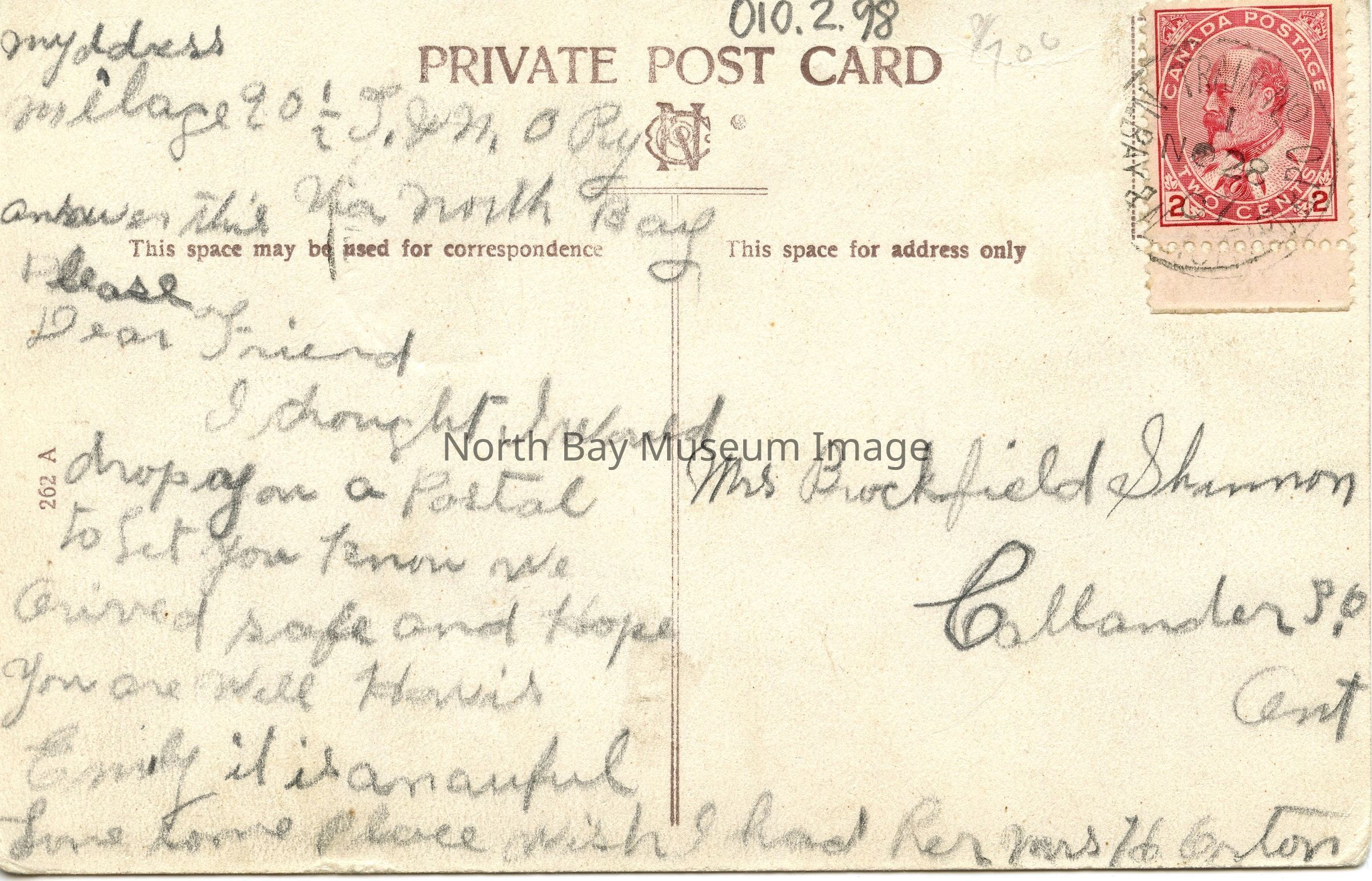 Addressee: Mrs. Brockfield Shannon, Callander 30, Ont