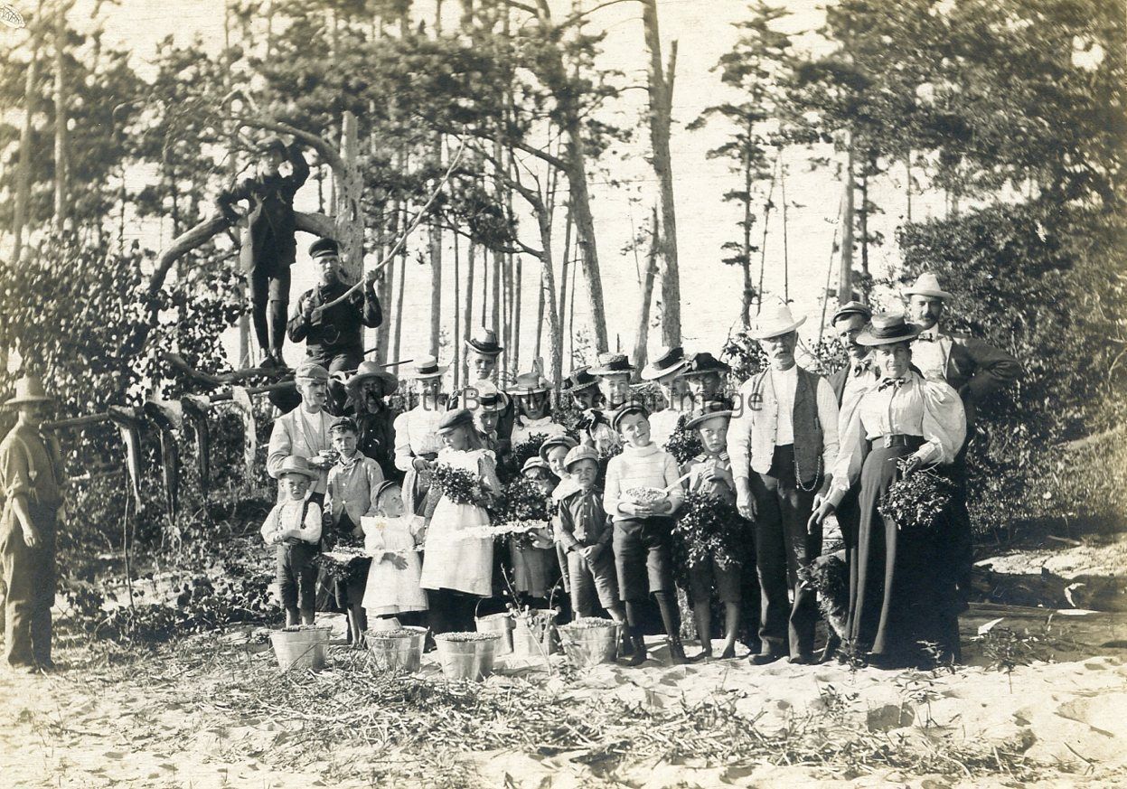 Image shows a large group at Frank's Bay with a number of fish are hanging on a rack off to the left of the group.