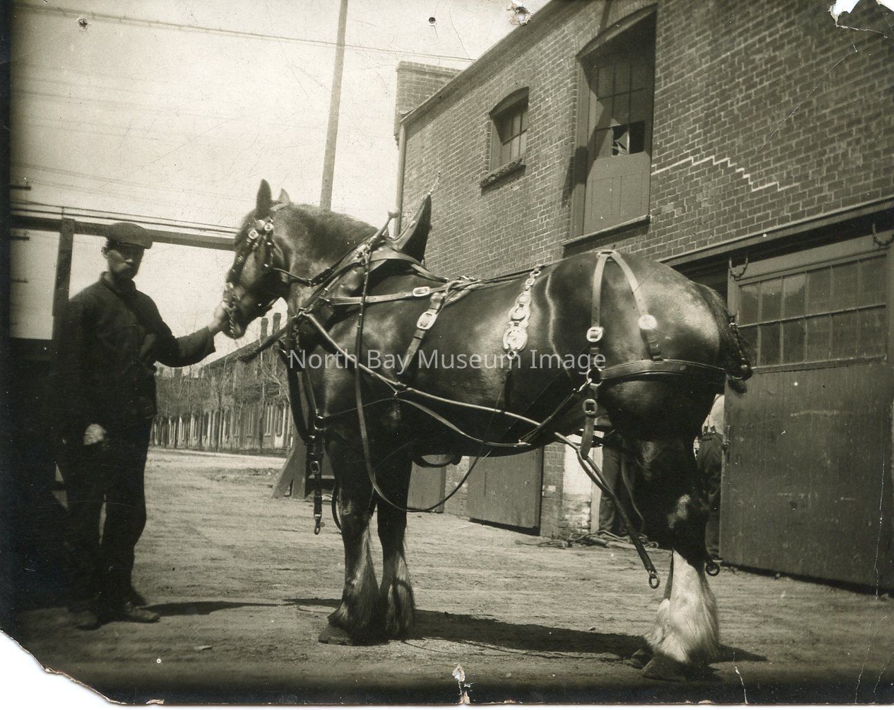 Black and white photographic print of John B. Smith & Sons Ltd properties. Photo is of man with a work horse at the Toronto properties on Strachan Avenue