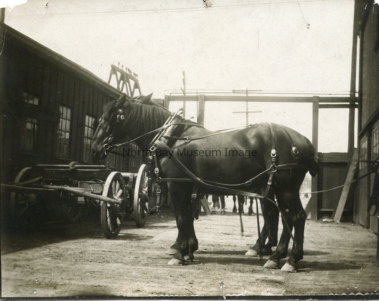 Black and white photographic print of John B. Smith & Sons Ltd. work horse at the Toronto properties on Strachan Avenue