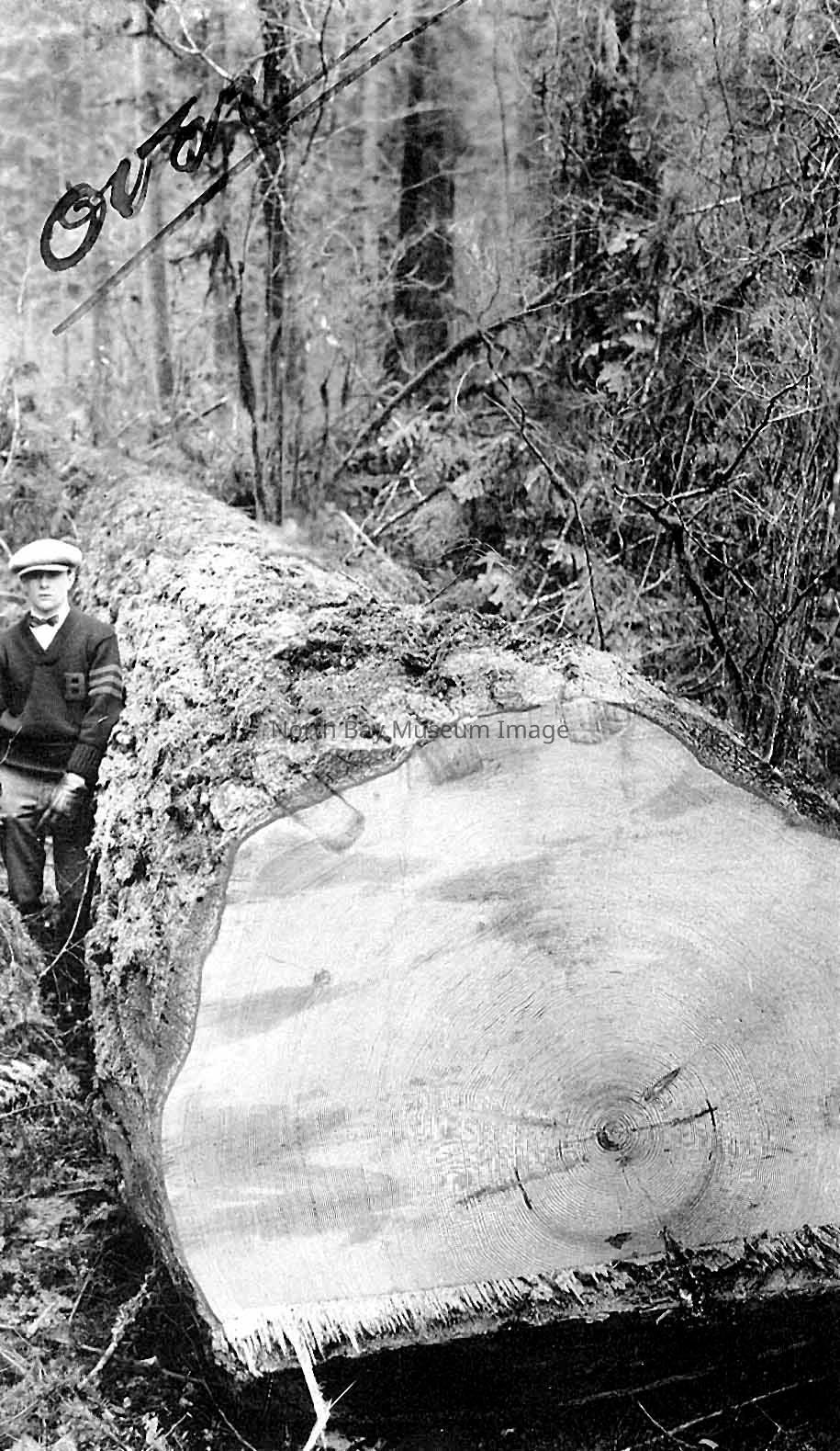 Black and white photographic print from John B. Smith & Sons lumber company with man standing beside a large hewn log. The words "This was cut for a 38 X 38 - 55" written black ink on the back of the print