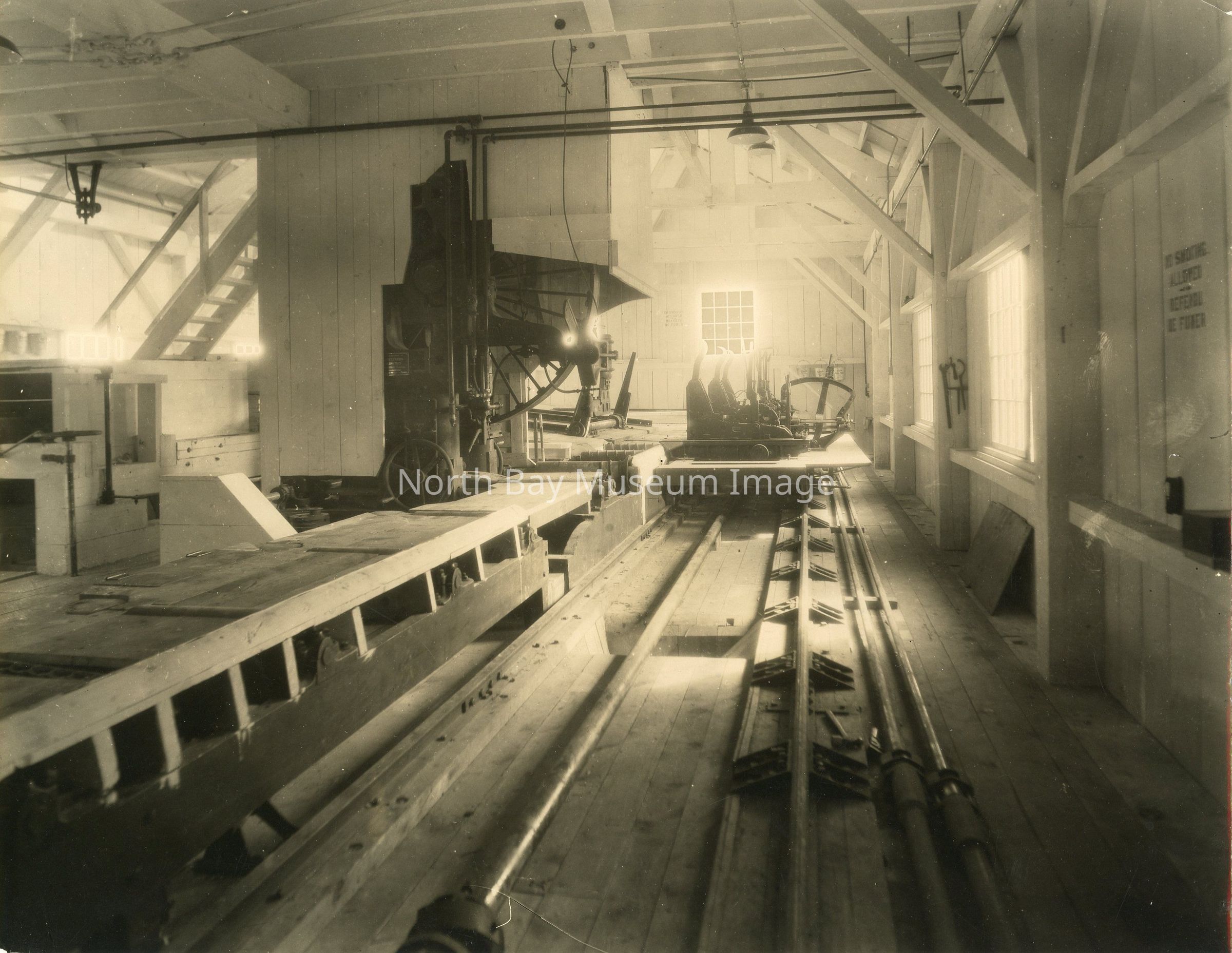 Black and white photographic print with interior view of the John B. Smith & Sons Ltd. mill in Callander The name "Noel's Studio 31 Main St. East North Bay, Ont." stamped in black ink in the lower right corner on the back of the print