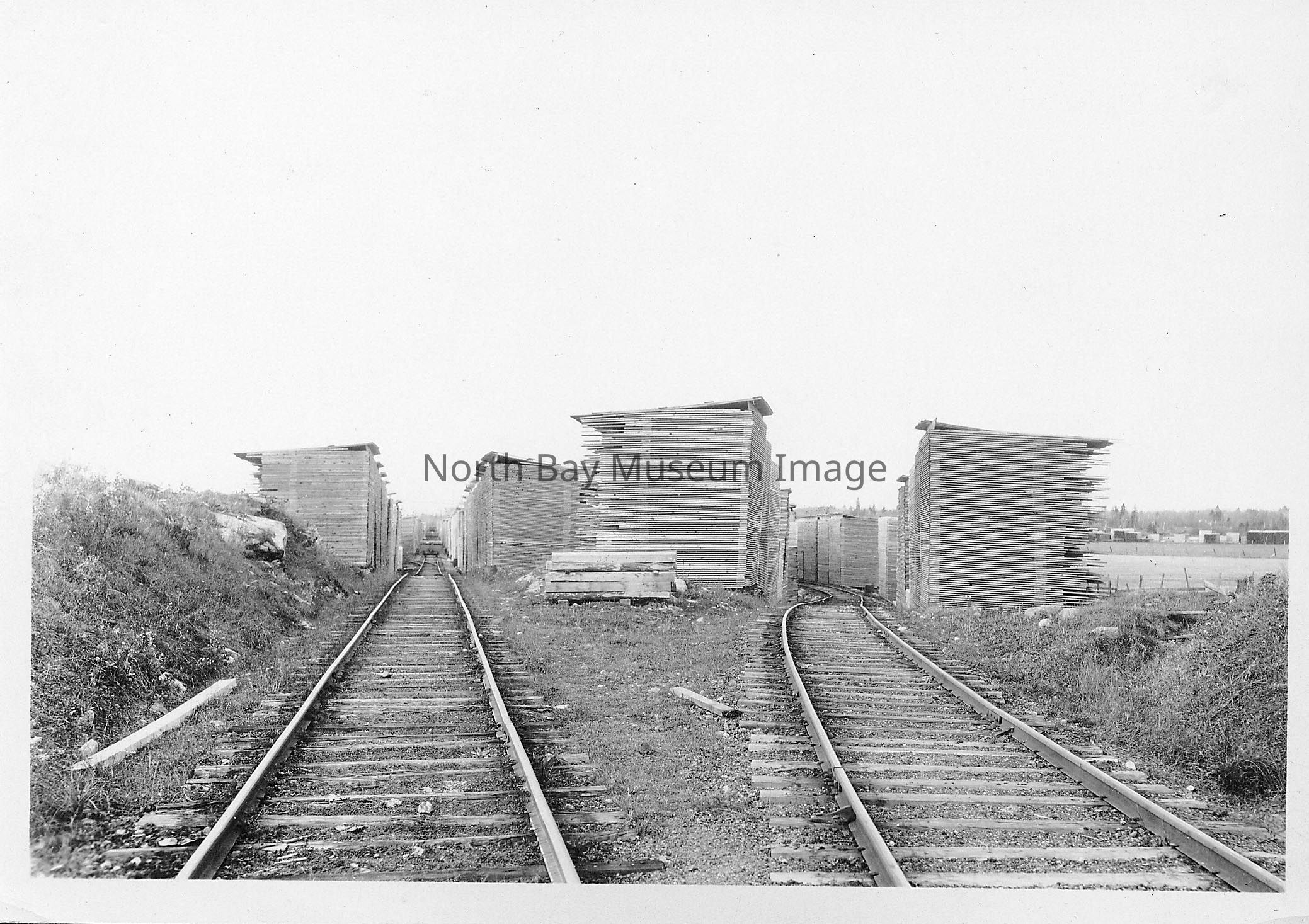 Black and white photographic print of John B. Smith & Sons Ltd. train tracks running between the piles of lumber in the lumber yards There is a small white border surrounds the image