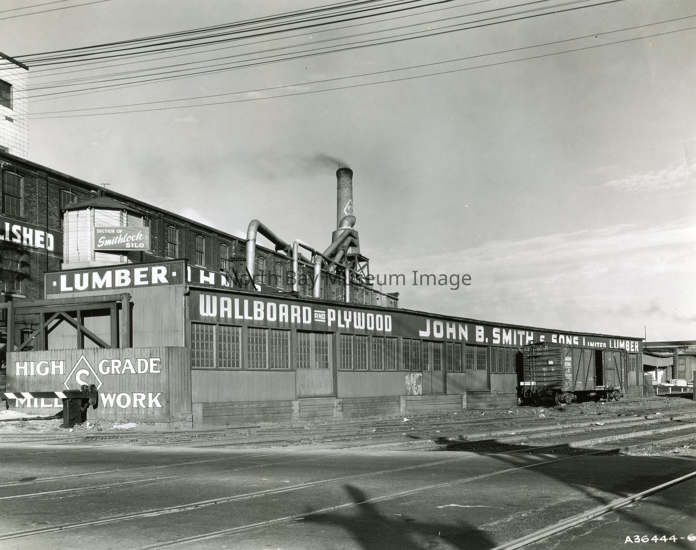 -the words "High Grade Mill Work", "Section of Smithlock Silo", "Wallboard and Plywood", "John B. Smith & Sons Limited Lumber" are written in various locations on the buildings in the photograph