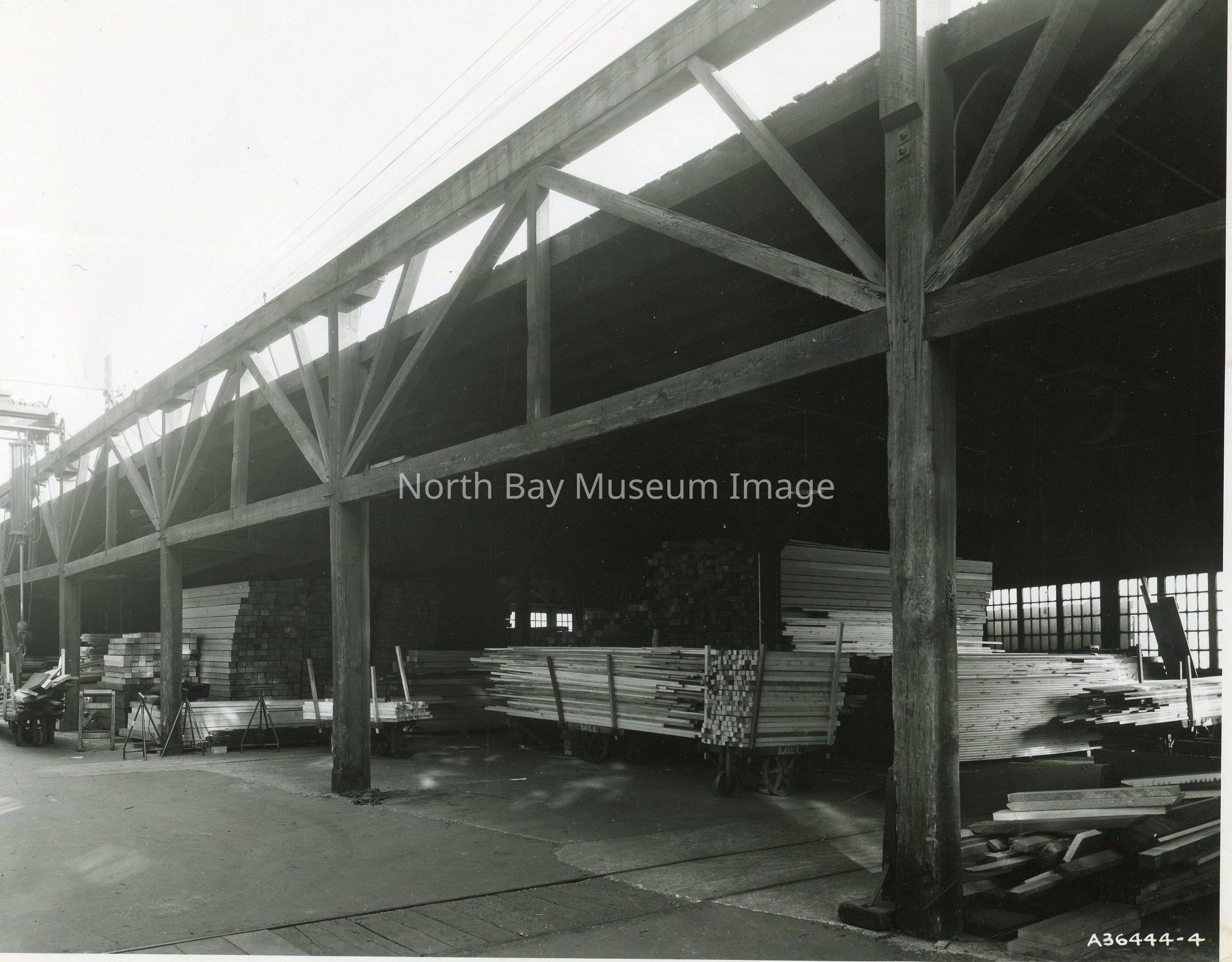 Black and white photographic print of John B. Smith & Sons Ltd. drying sheds for lumber at the Toronto properties on Strachan Avenue.