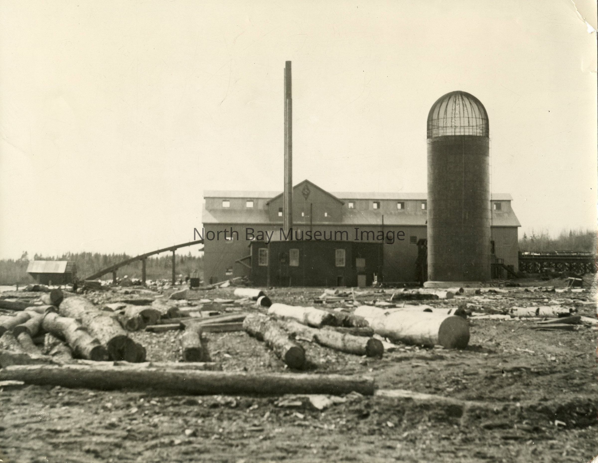 Black and white photographic print of John B. Smith & Sons Ltd. with exterior view of the Smith's mill in Callander