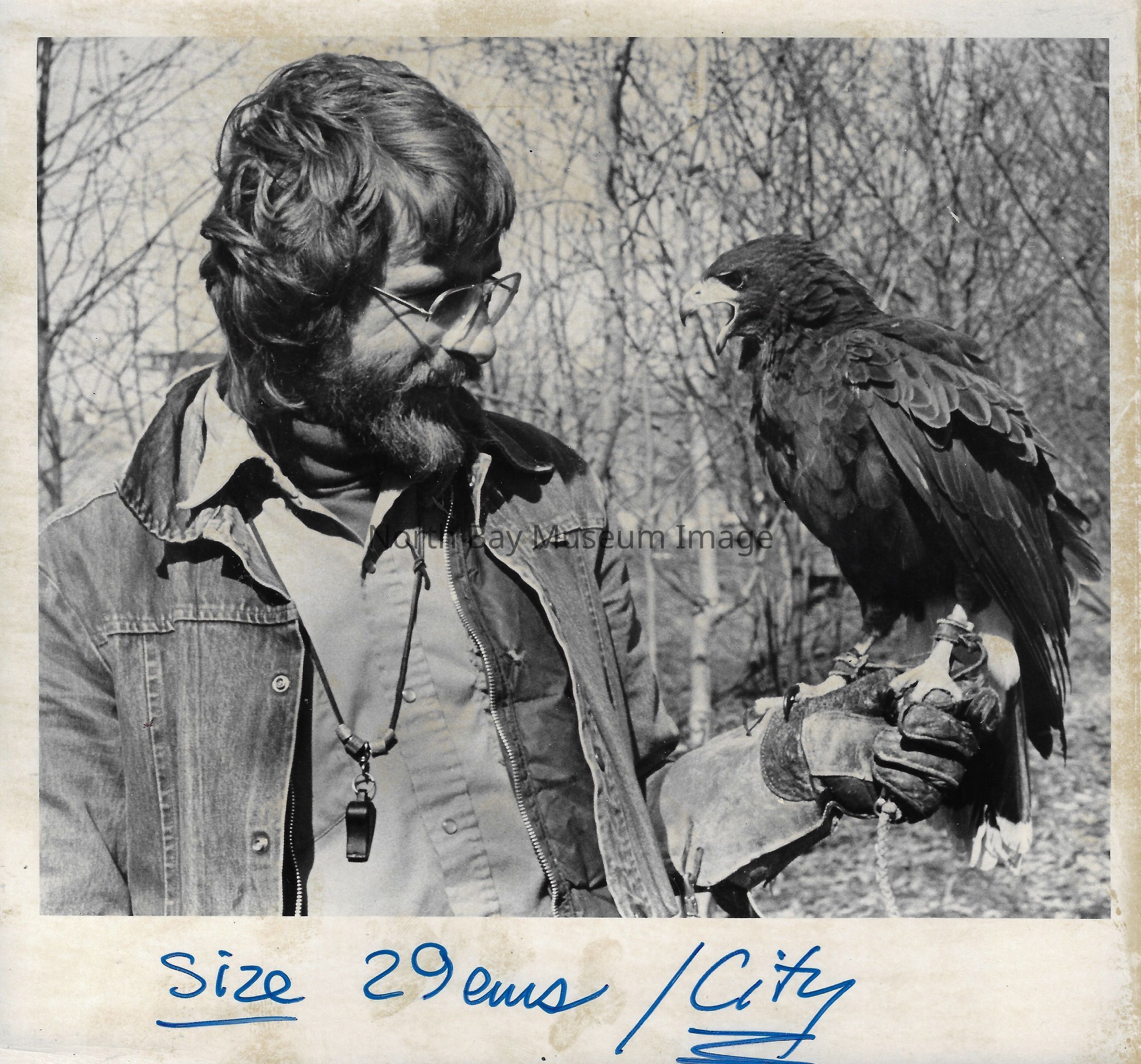 Various photos related to Jack Garland airport. Several photos copyrighted by Railton photography. 022.01.51d: Rick Jerema, bird control officer at the Jack Garland Airport, holding a raptor.