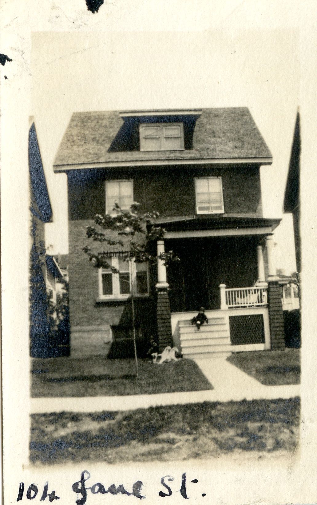 Black and white photograph of a house at 104 Jane Street with a boy on steps. Written on reverse of photo "J.R. Childerhose's residence, 104 Jane Street, North Bay, Ontario."