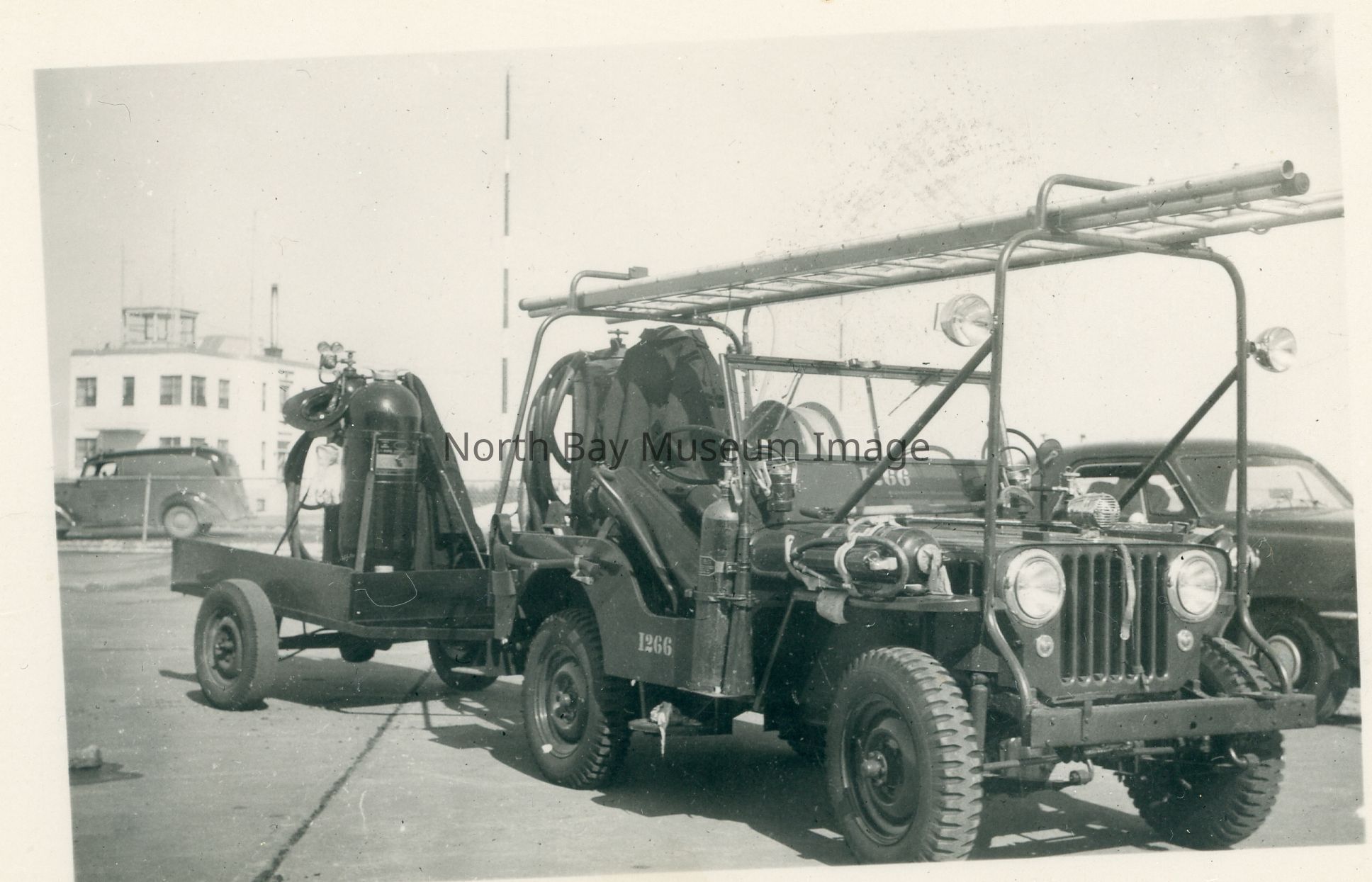 Black and white photograph of a dark coloured Jeep at North Bay airport. The jeep is pulling a trailer with a tall tank on it with ladders overhead and "1266" stamped on side & under front window. Airport terminal is in background left.