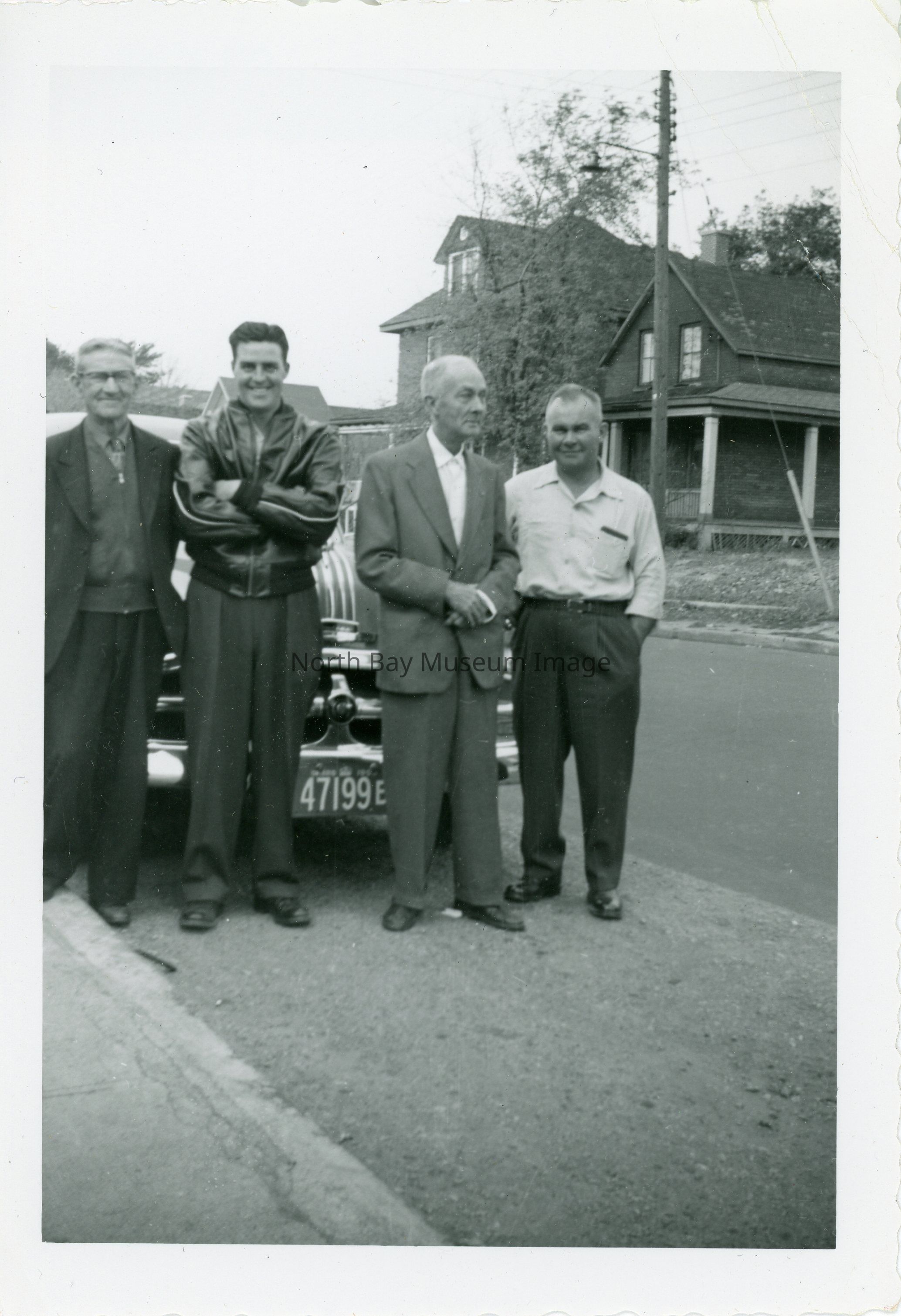 Photo of unidentified man, Jerry Cardinal, Frank Elston and Ralph Elston. Group is standing in front of car with houses in the background.