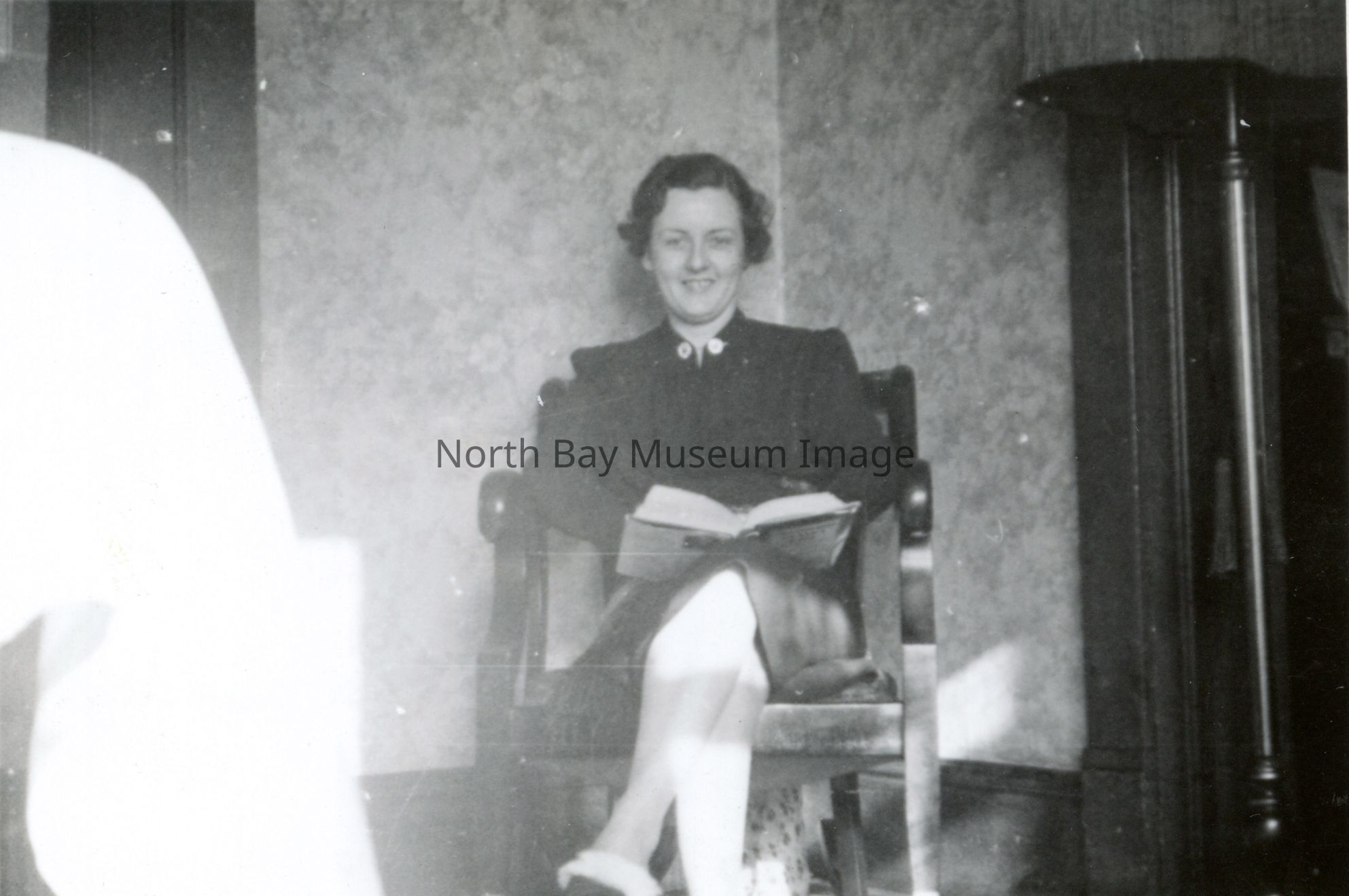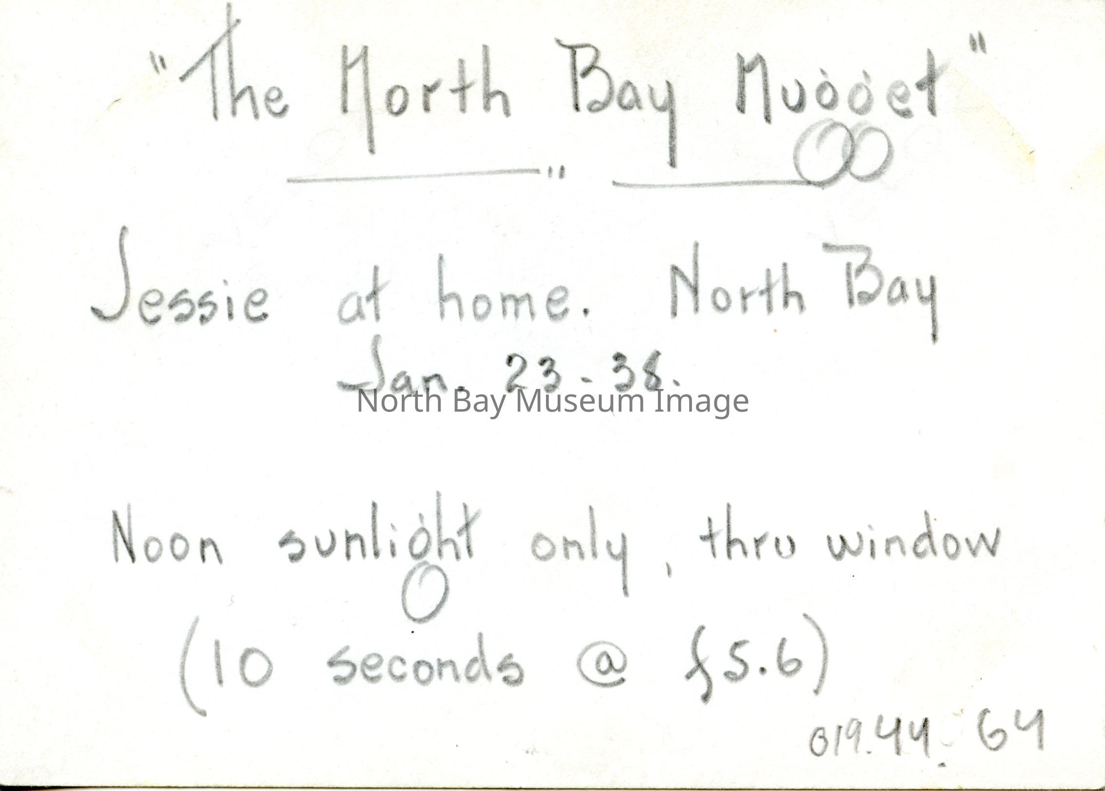 Photo of woman sitting in rocking chair with caption on back is written "The North Bay Nugget Jessie at home. North Bay Jan 23-38. Noon sunlight only, thru window (10 seconds a f5.6)"