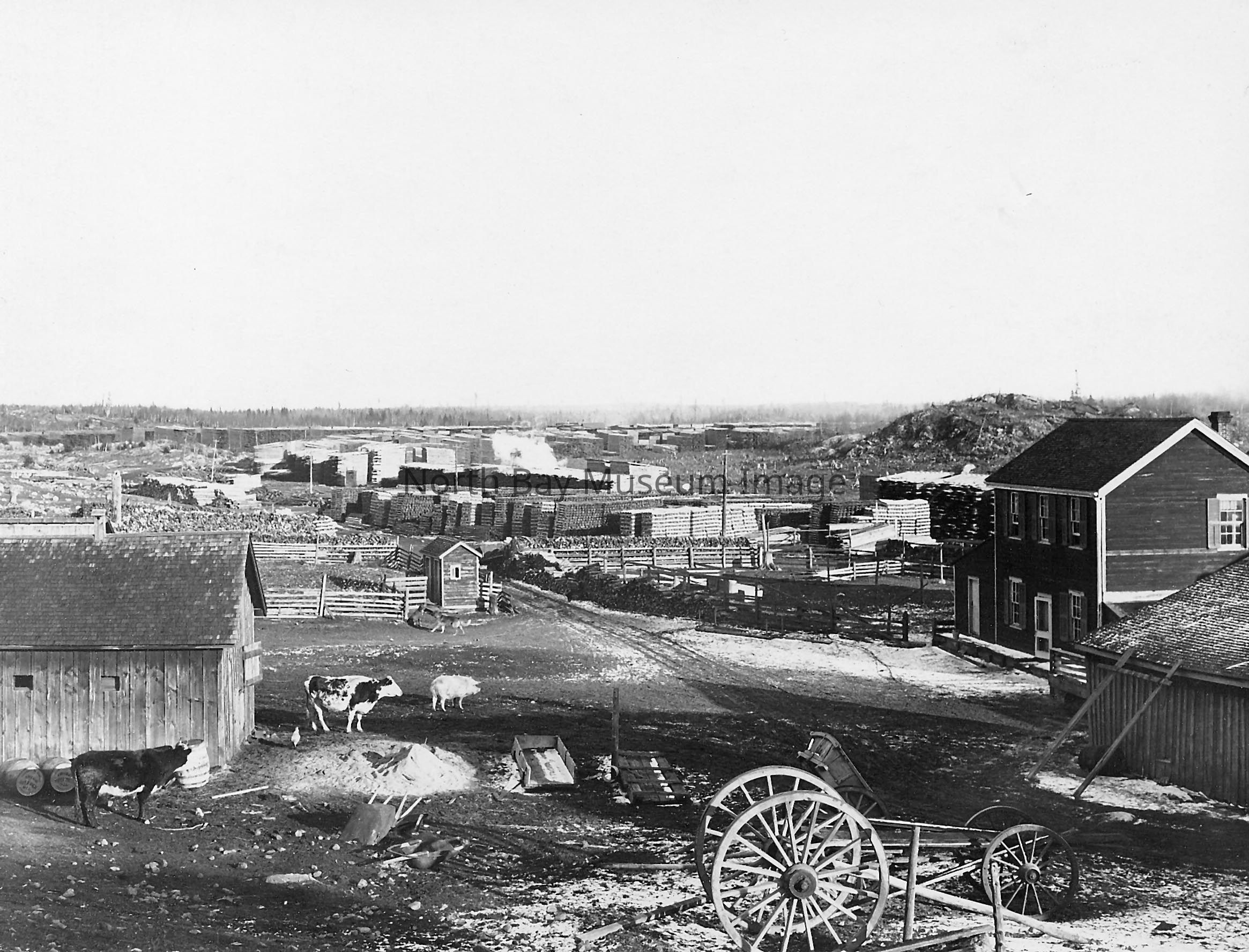 Black and white photographic print of John B. Smith & Sons Ltd. Callander properties. Wagons, livestock, piles of lumber and buildings visible in the picture.