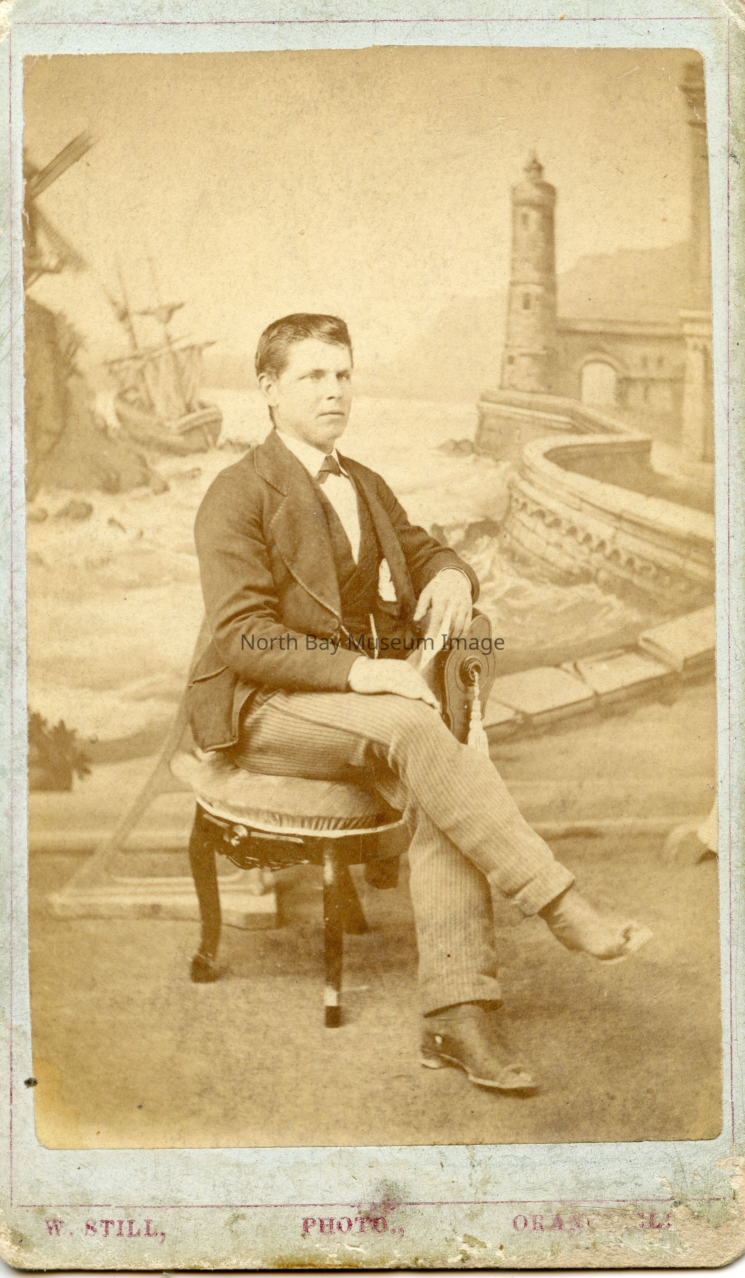 The photograph is not dated, but his age suggests the photo was taken in the 1880s. In front of scenery of a castle and ship in the background. W. Still and Orangeville written in small letters across the bottom.
