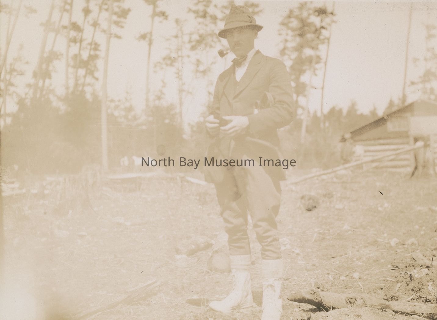 Faded black and white photo of John Taylor smoking pipe, outdoors, log cabin in background. Part of the Gordon collection.