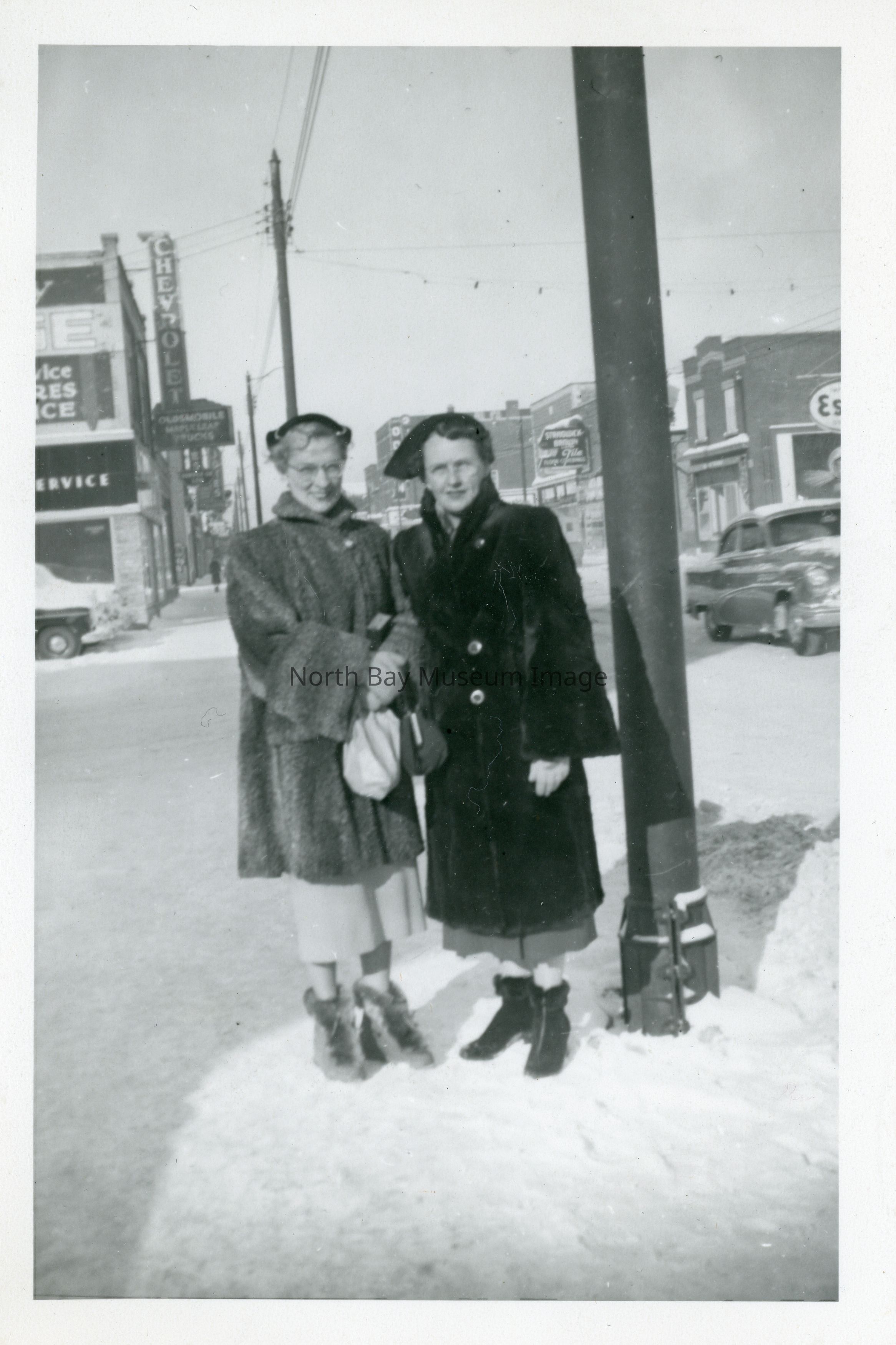 Photograph of Kae and Phylis Elston Standing by Sherbrooke and Main Street. Esso Station and Chevrolet dealer and Sherbooke Tile shop are visible in the background.