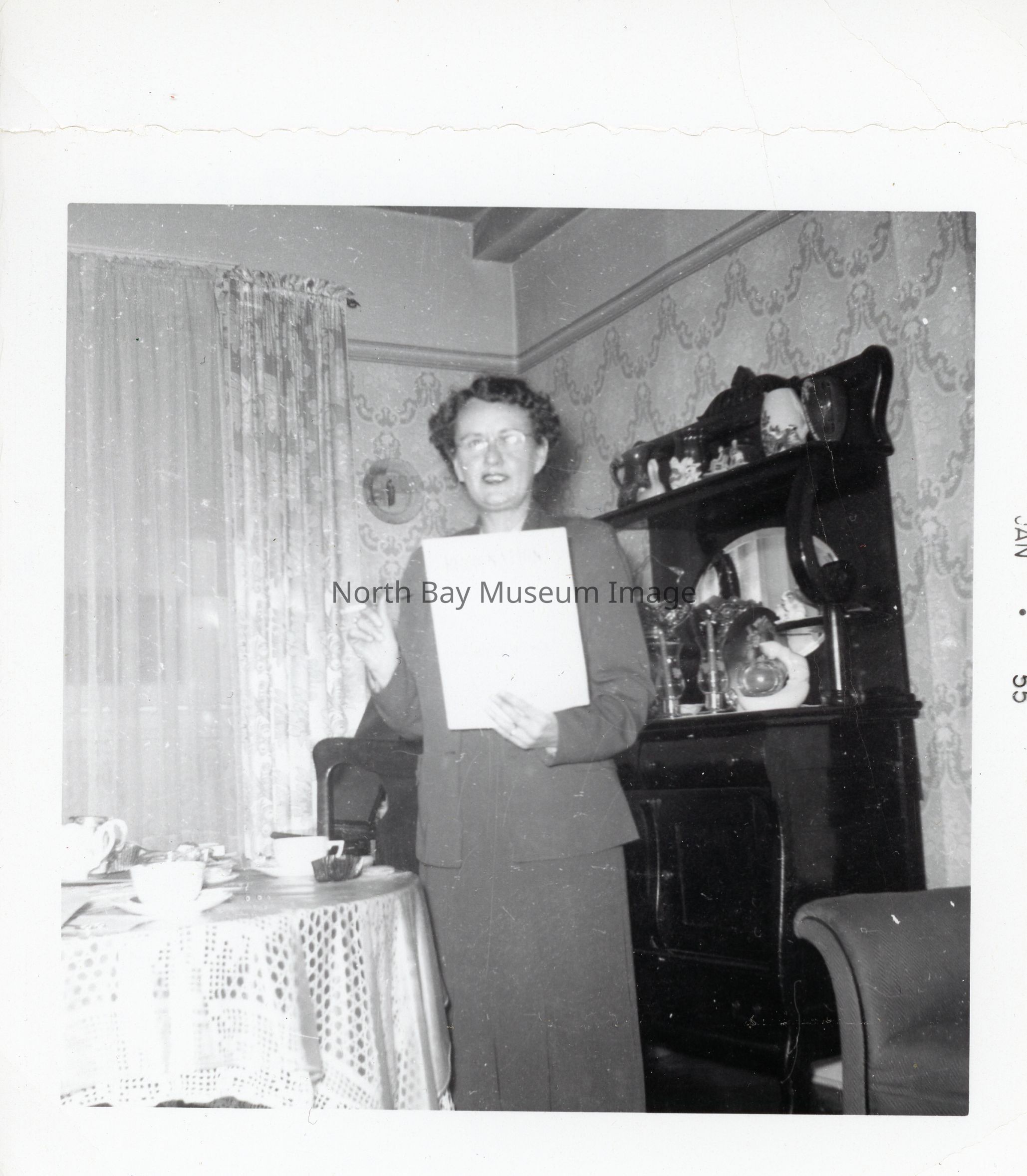 Photo of Kae Elston holding up piece of paper in living room of home.