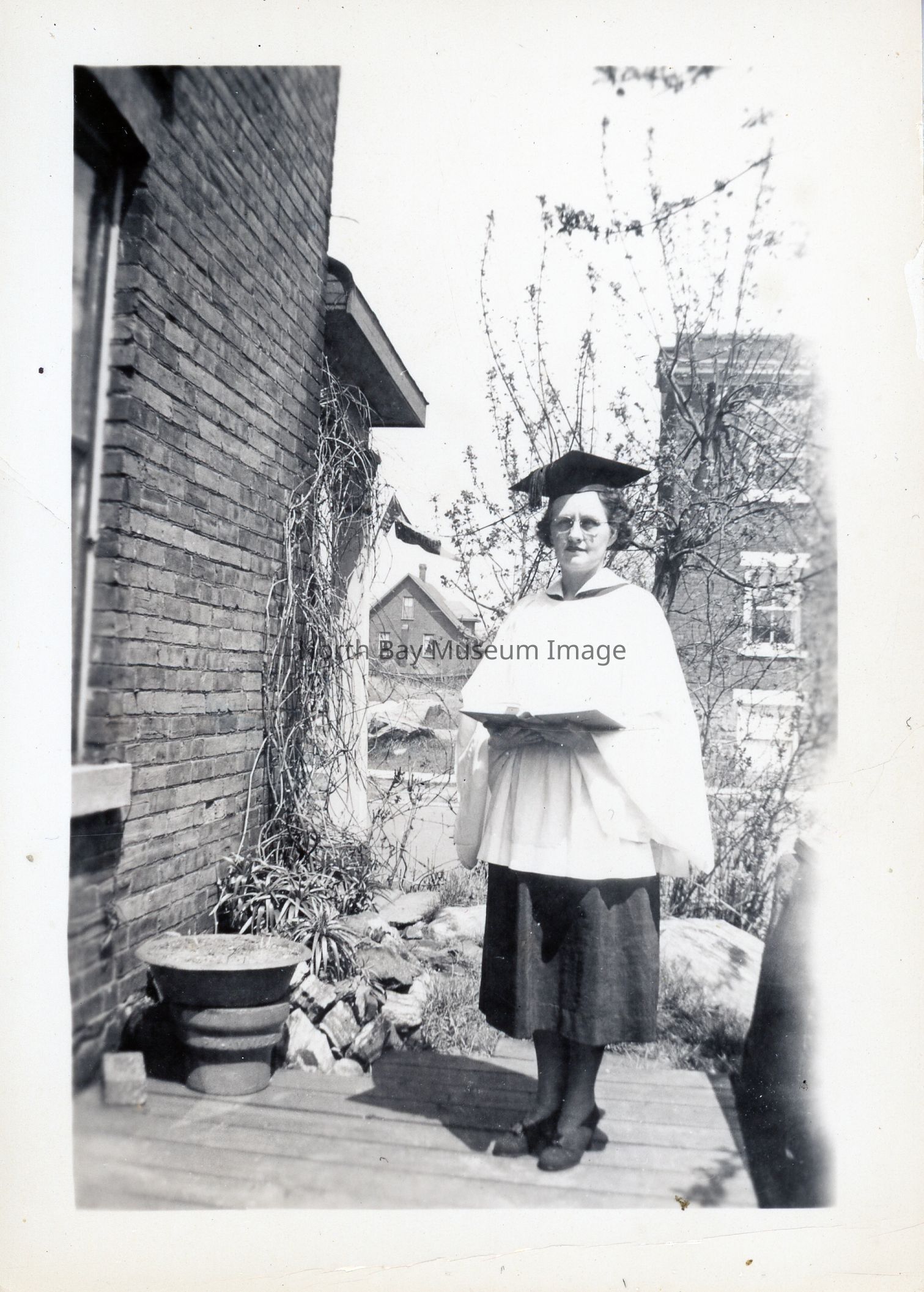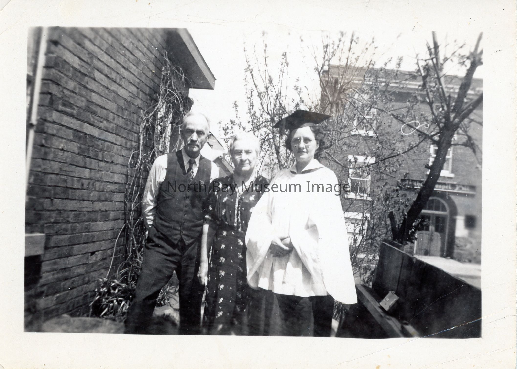 Kae Elston outside McIntyre Street home in choir uniform. Image A is of Kae alone, image B is Kae with Frank and Laura Elston.