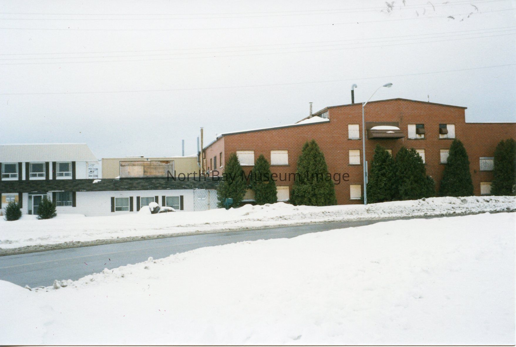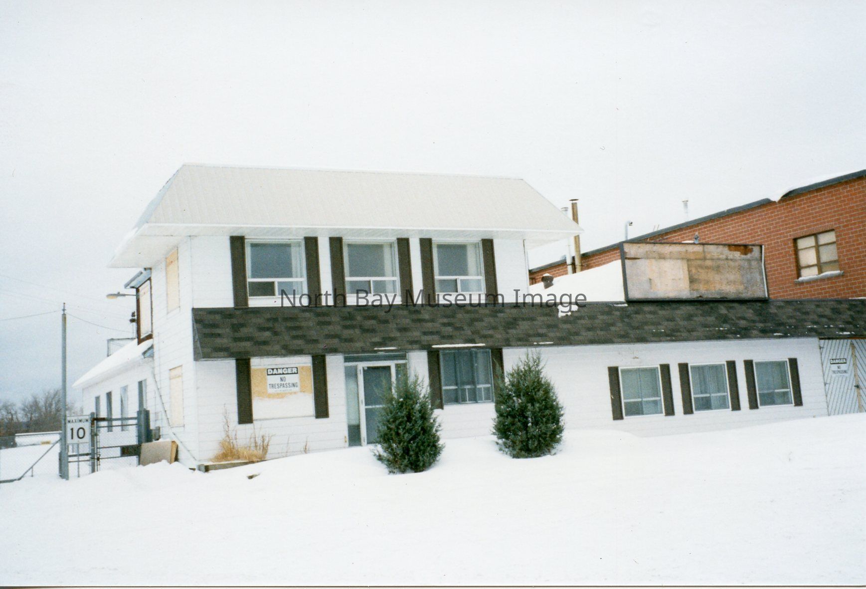 - B- is office building. White exterior vinyl siding with black shutters around 9 windows - snow on ground & 2 small cedar trees in front of building