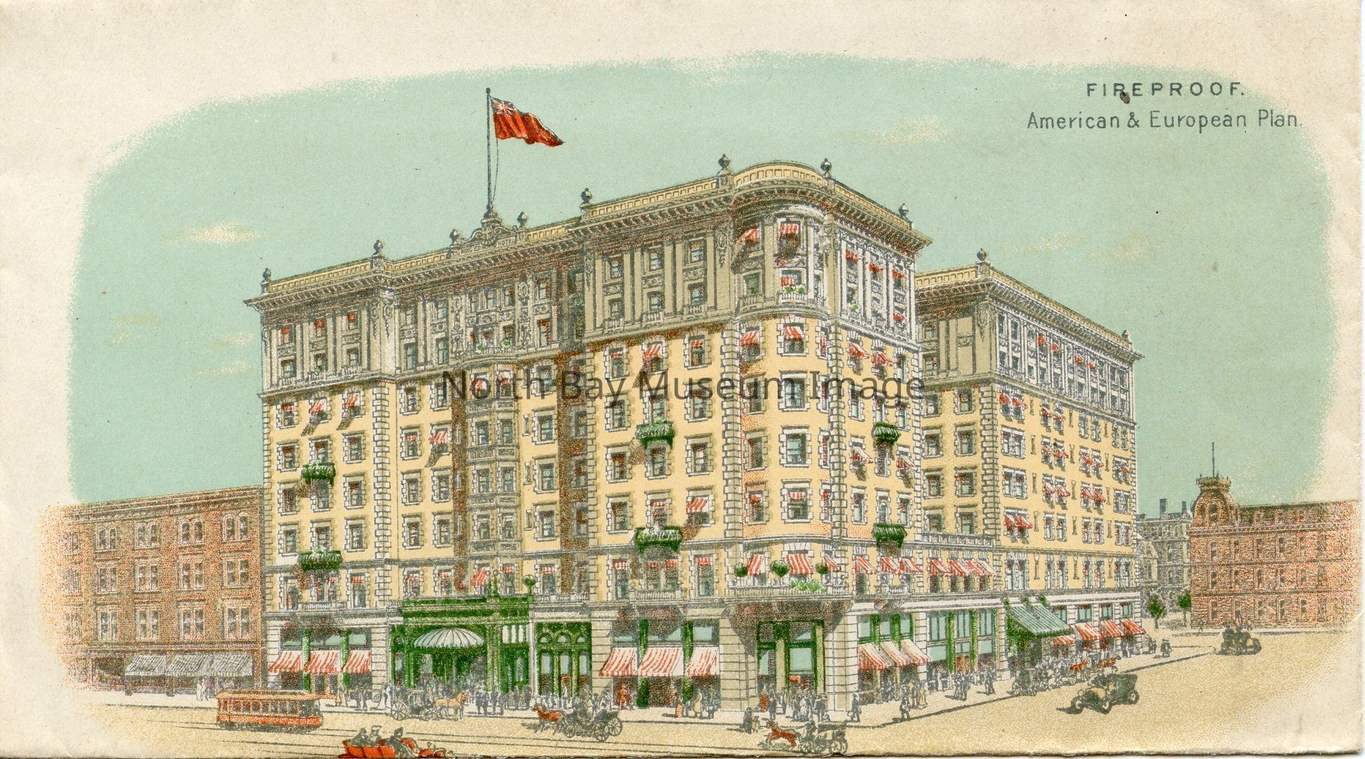 This is a coloured postcard of the King Edward Hotel. The postcard has a beige boarder. The illustration on the front of the postcard is of the hotel which is a 8 storey building. The illustration is also of a streetscape: you can see the road in the foreground, and shops/ other buildings next to the hotel. There are cars driving and parked in the street. The ground floor of the hotel has green windows and doors. There are also red awnings over the entrances. There appears to be two entrances to the hotel. There are a few flower boxes on some of the windows of the upper floors. On top of the roof a flag was flying.