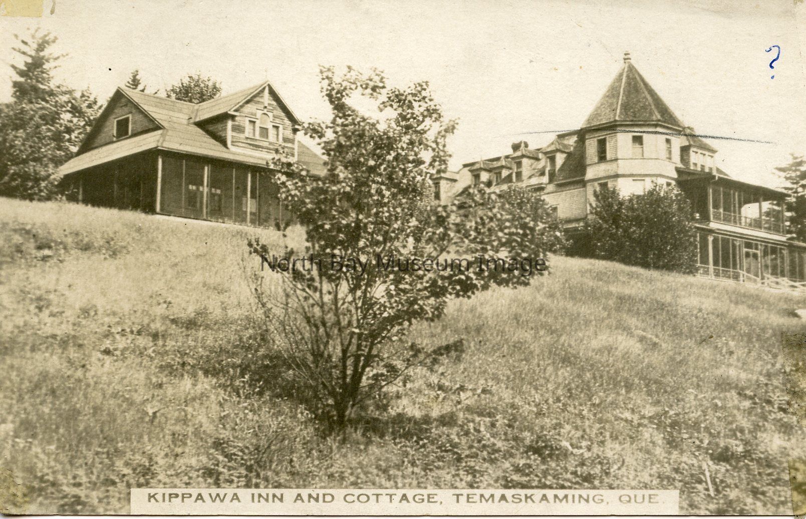 This is a black and white print of Kippawa Inn & Cottage, Temiskaming, Que. it shows the octagonal roof of the Inn, and a screened in Cottage sitting on a hill. There is a small bush type tree in the foreground. Across the bottom of the postcard is printed, "Kippawa Inn & Cottage, Temiskaming, Que." in text. This post card has not been used. Tt is marked for a stamp in top right corner, with initials AZO x4, making a square of the initials, in which to post the stamp. The words, "Post Card, Made In Canada, Correspondence, Address" in various locations on the back as well.Creator