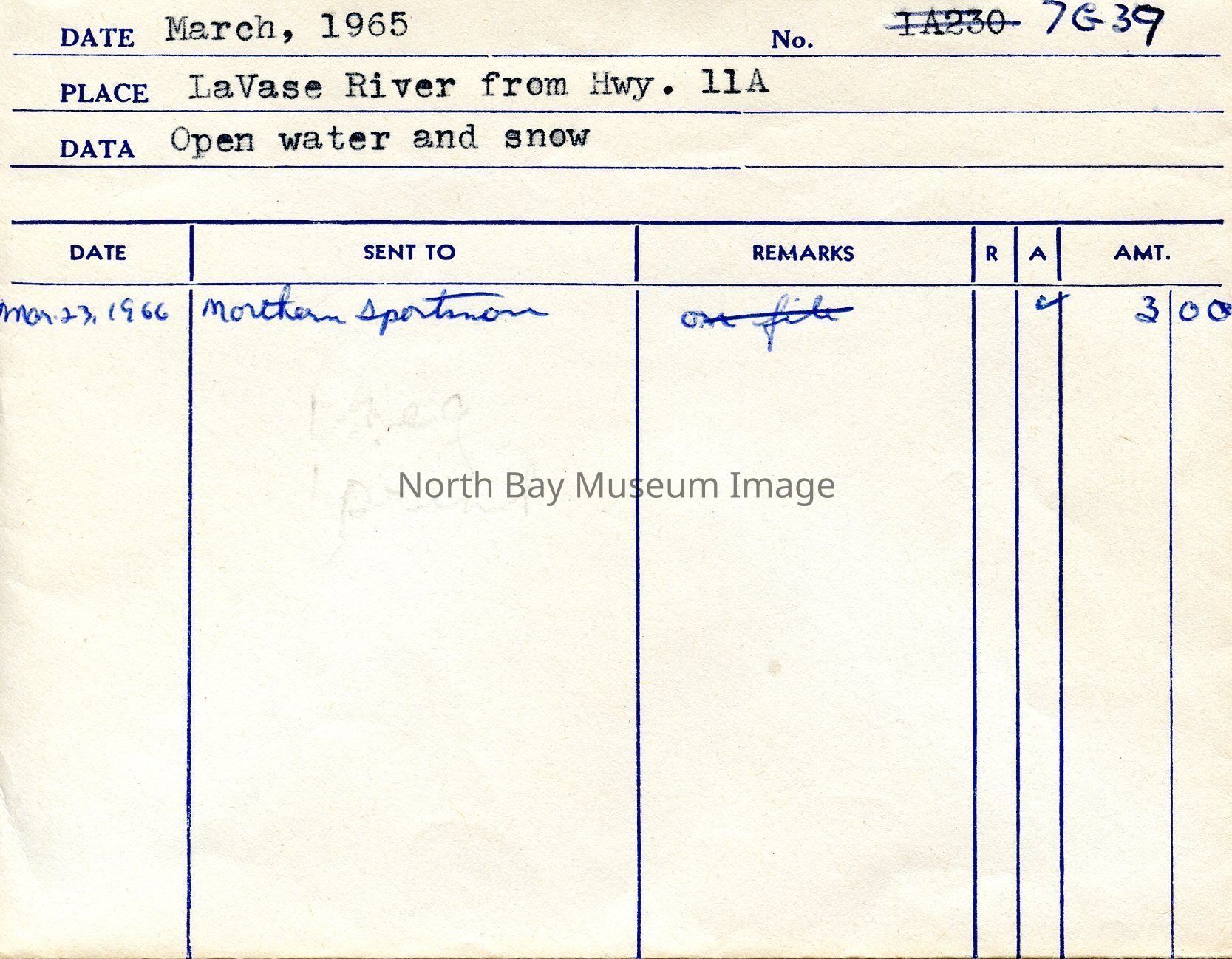 Envelope (a) containing photo (b) and negative (c) of La Vase River open water with snow.