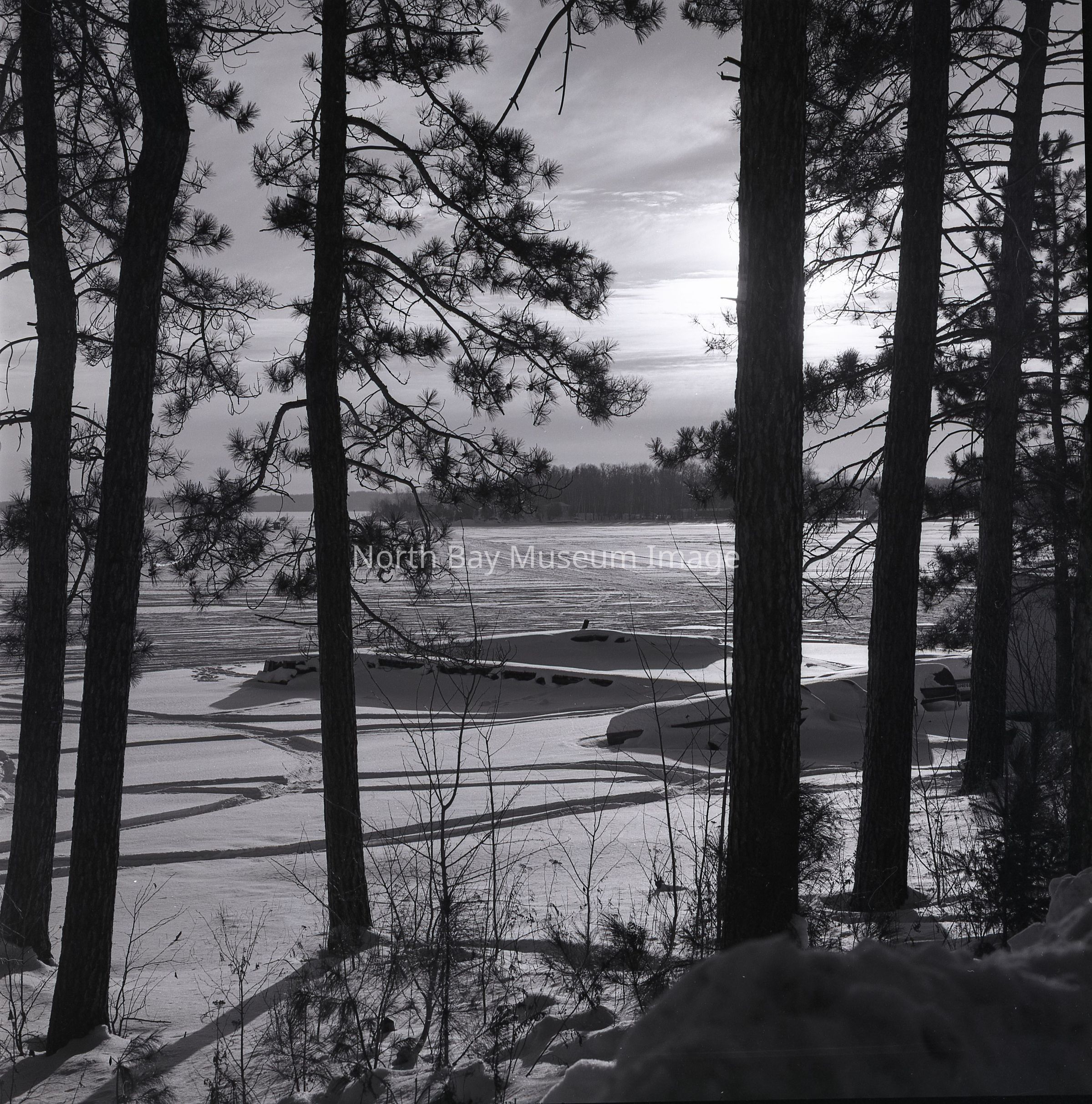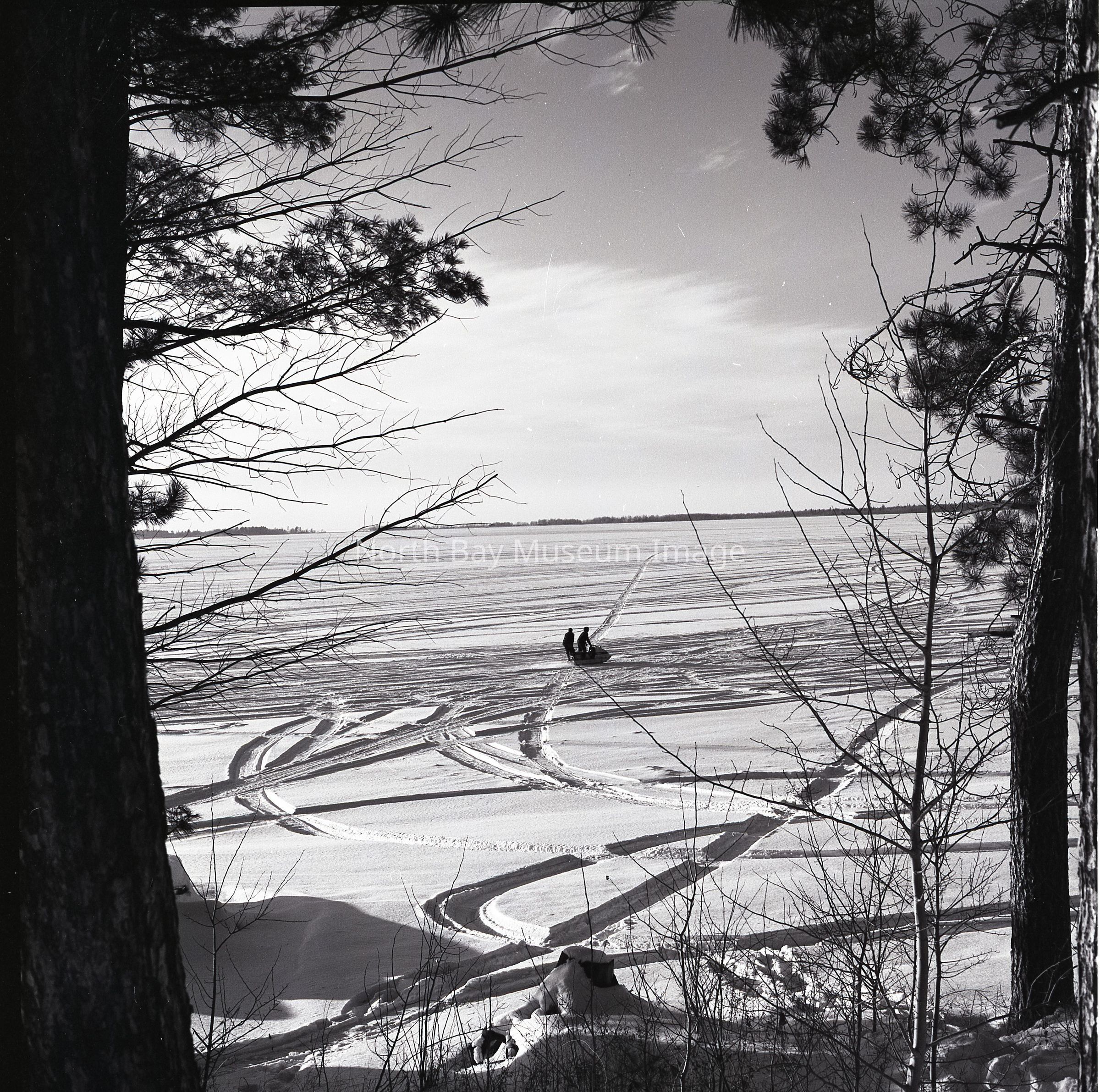 Envelope (a) containing photographs and negative (b-e) of the Lake Nipissing taken in Callander. The negative and photograph capture shots of people snow mobiling as well as all the tracks left on the lake from the snowmobiles from the trees. A part of the Forder Collection. The photographers original number is 2B118a. All of the photographs publications are listed on the the envelope.Creator