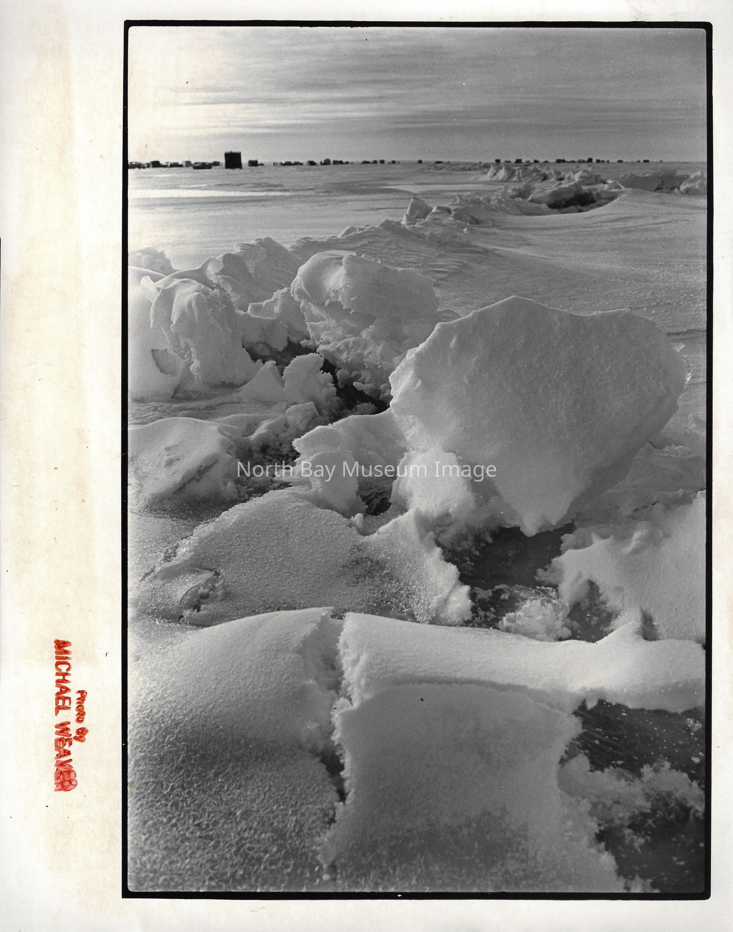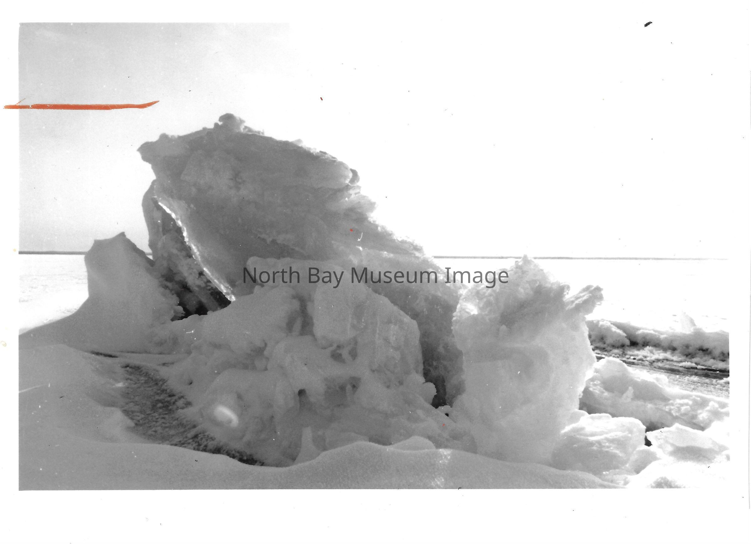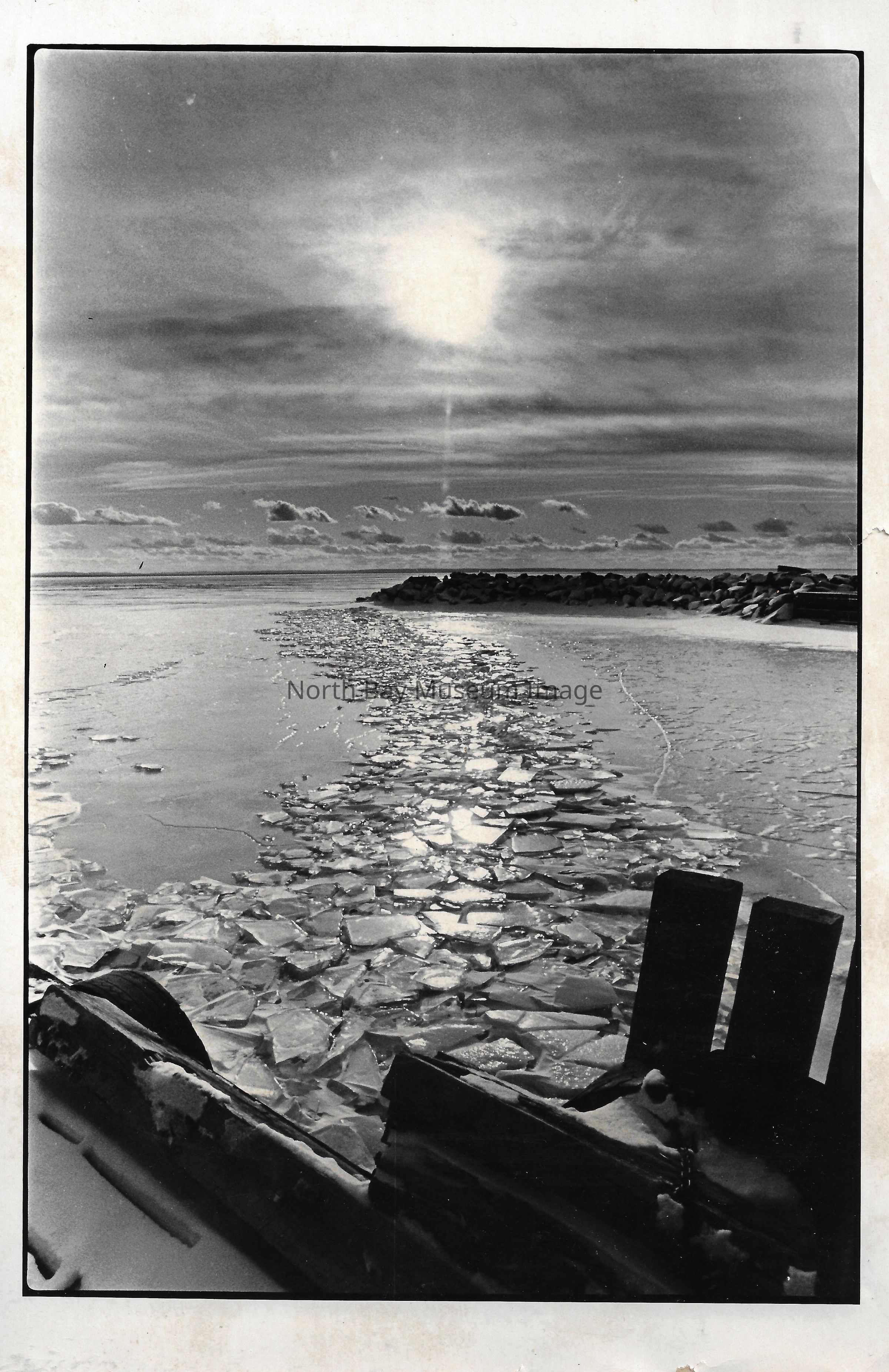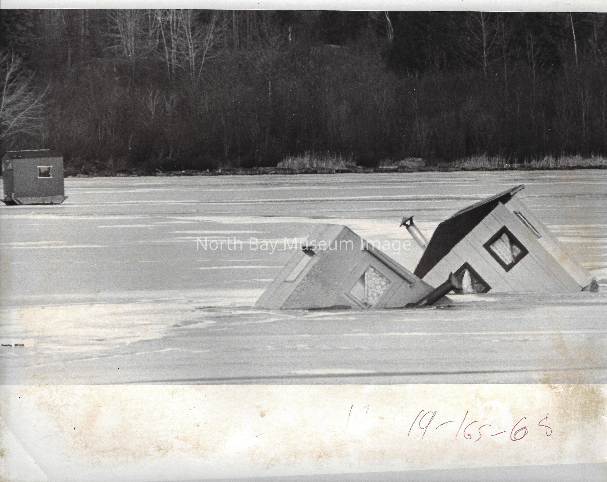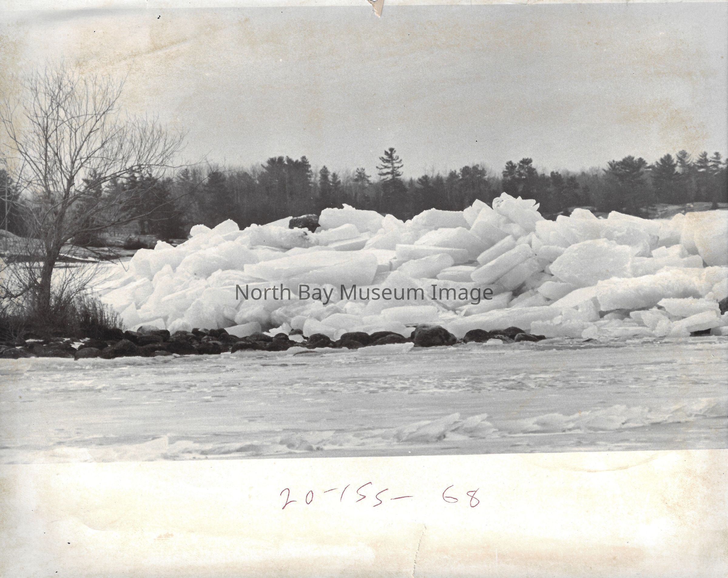 Photos of fishing huts on Lake Nipissing, an ice jam approaching government dock, and a plaque outlining its prehistoric geology.