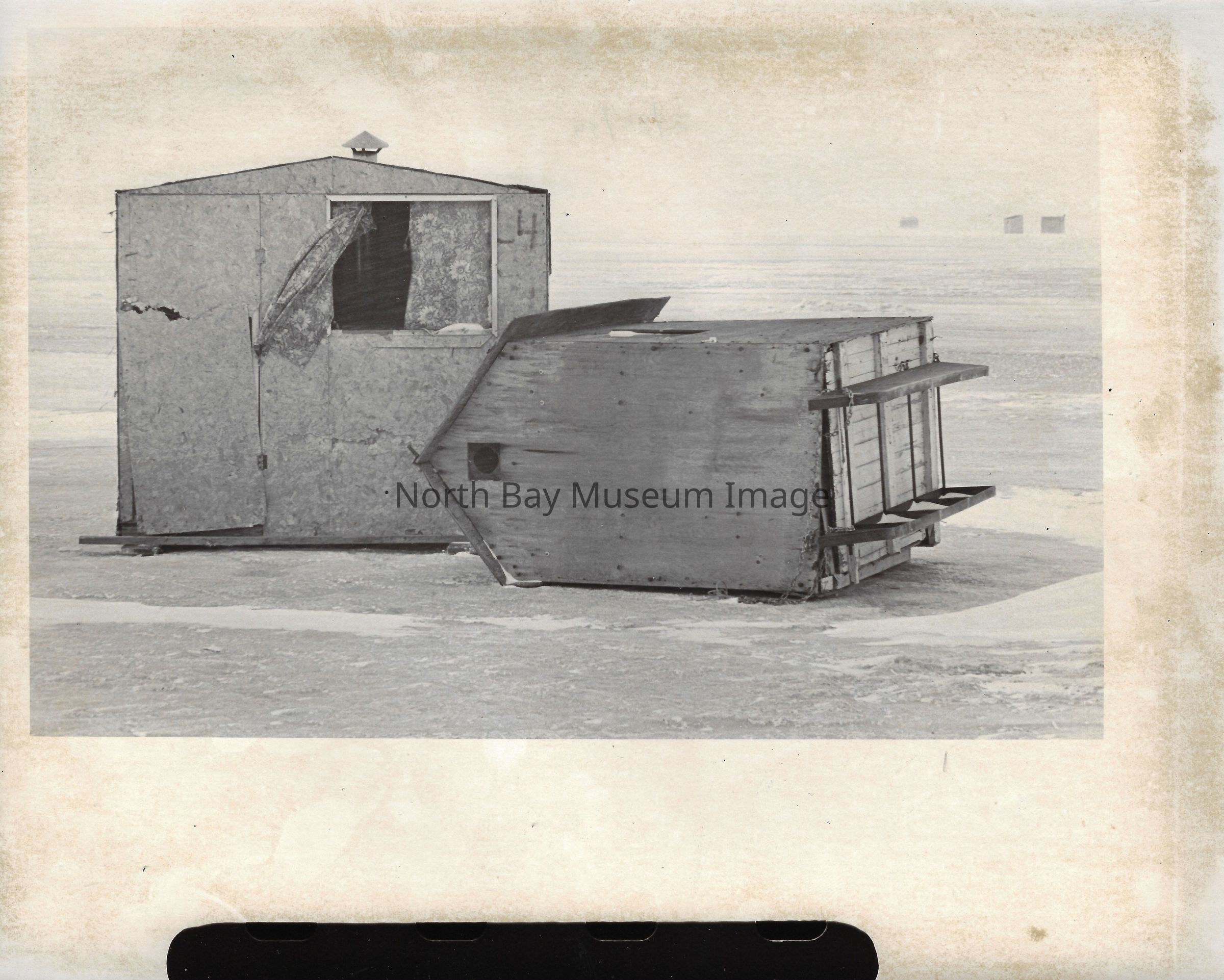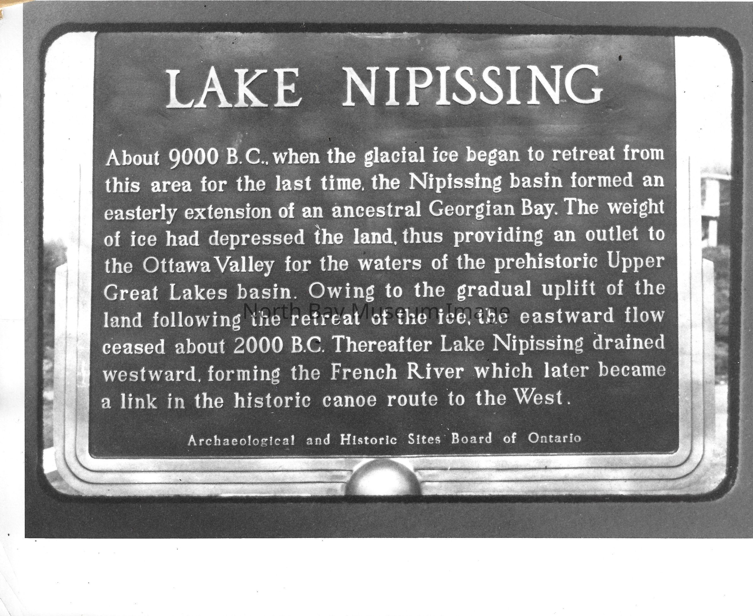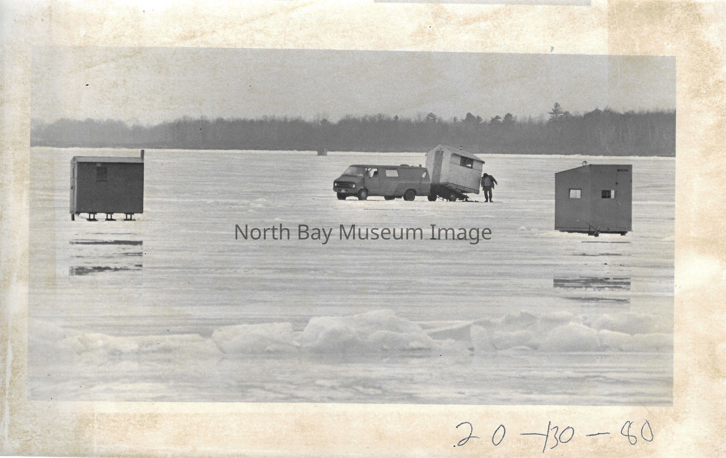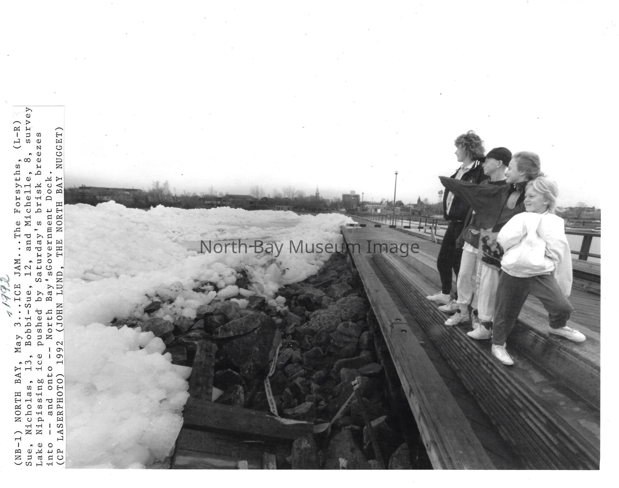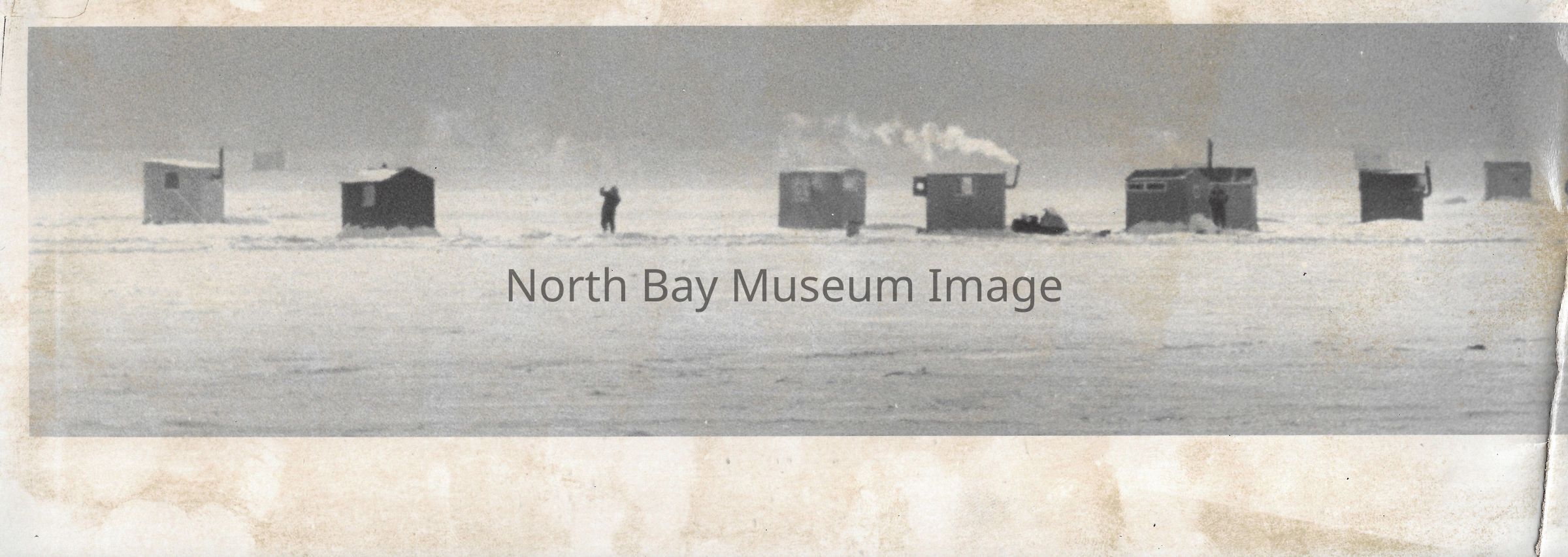 Photos of fishing huts on Lake Nipissing, an ice jam approaching government dock, and a plaque outlining its prehistoric geology.