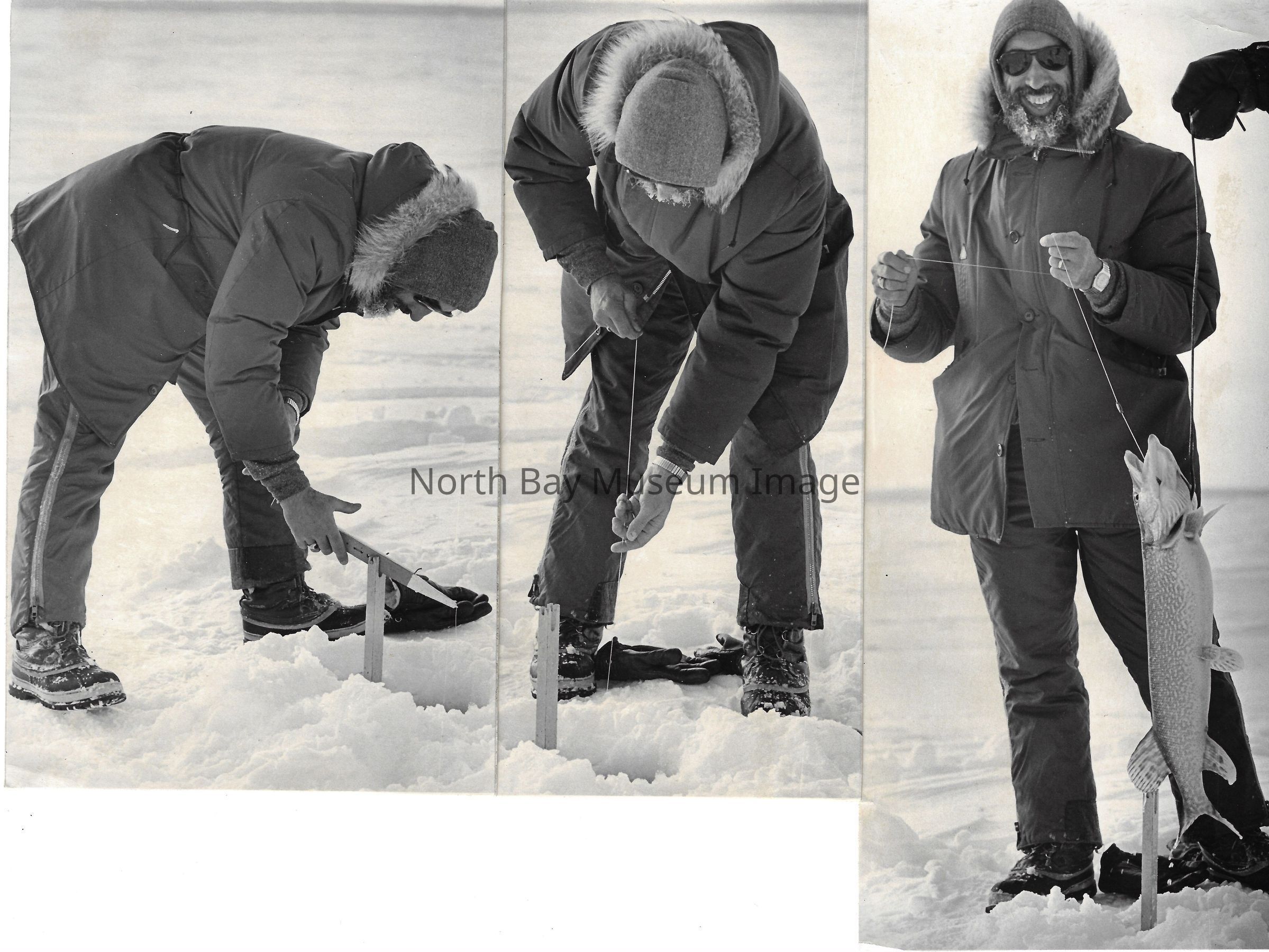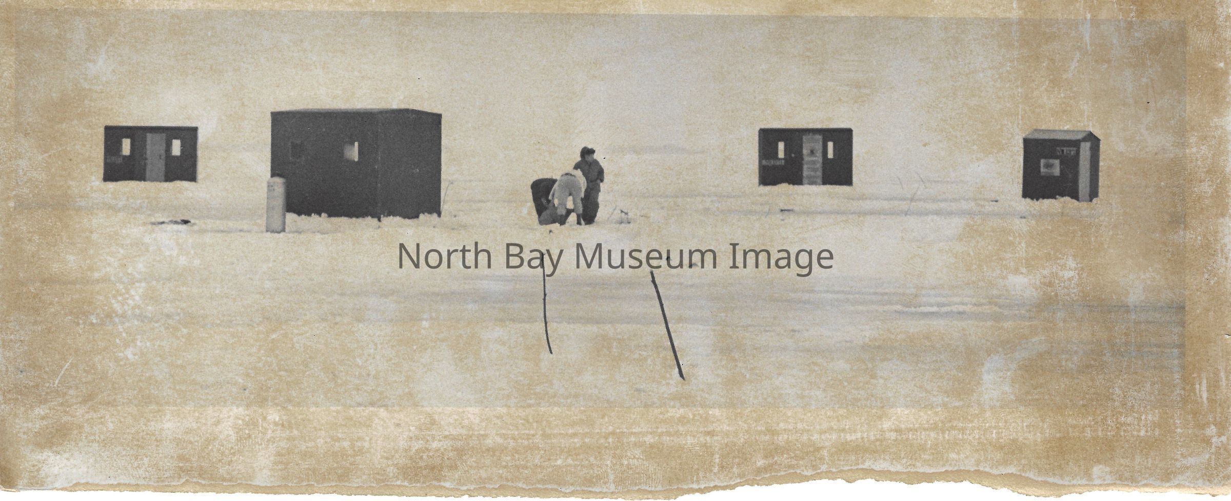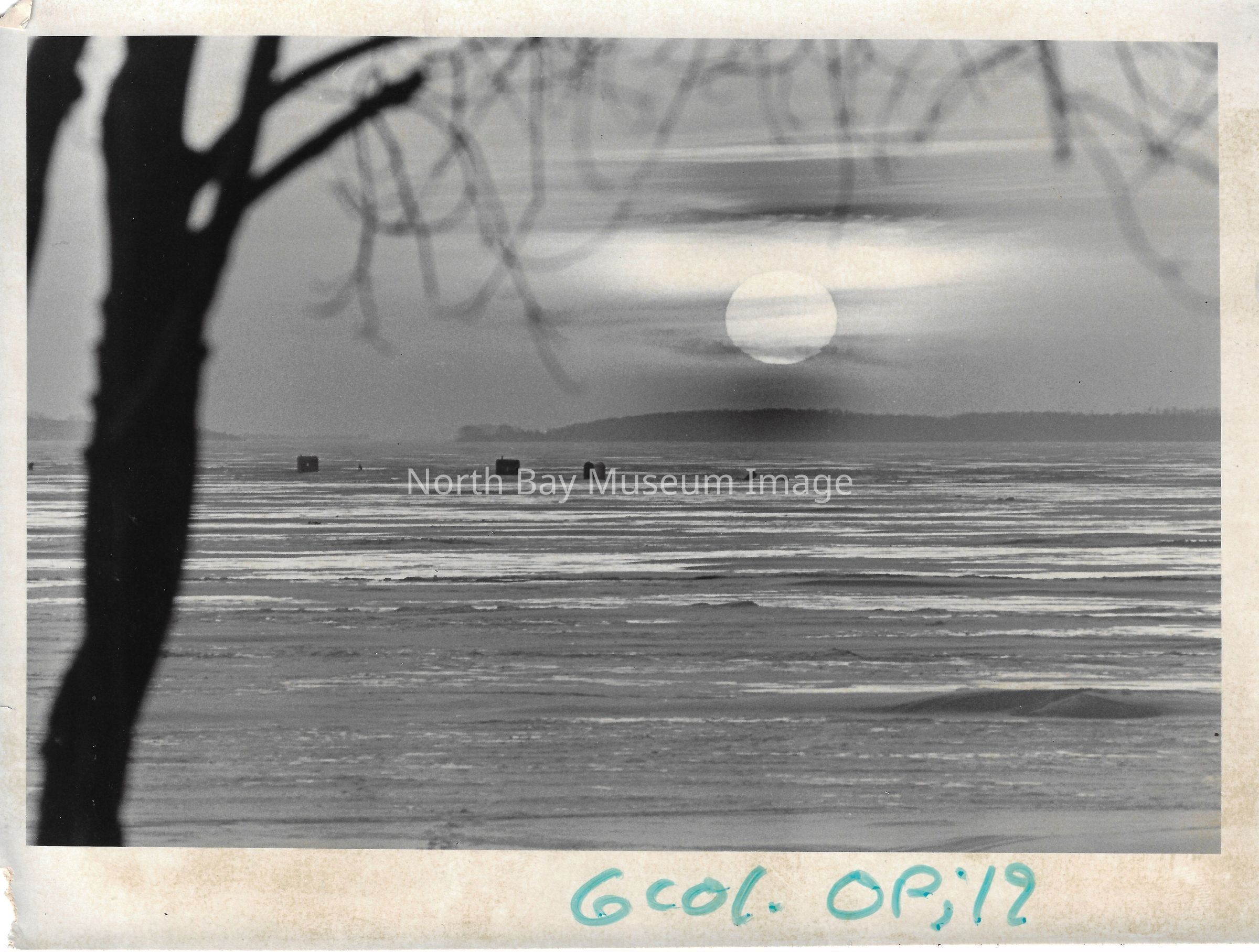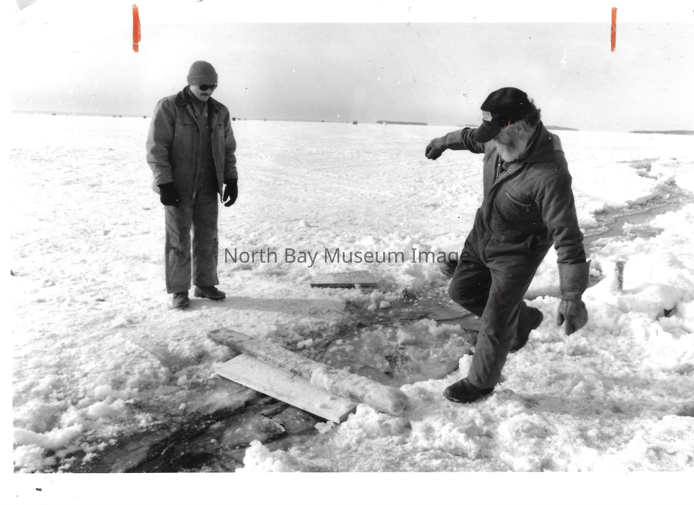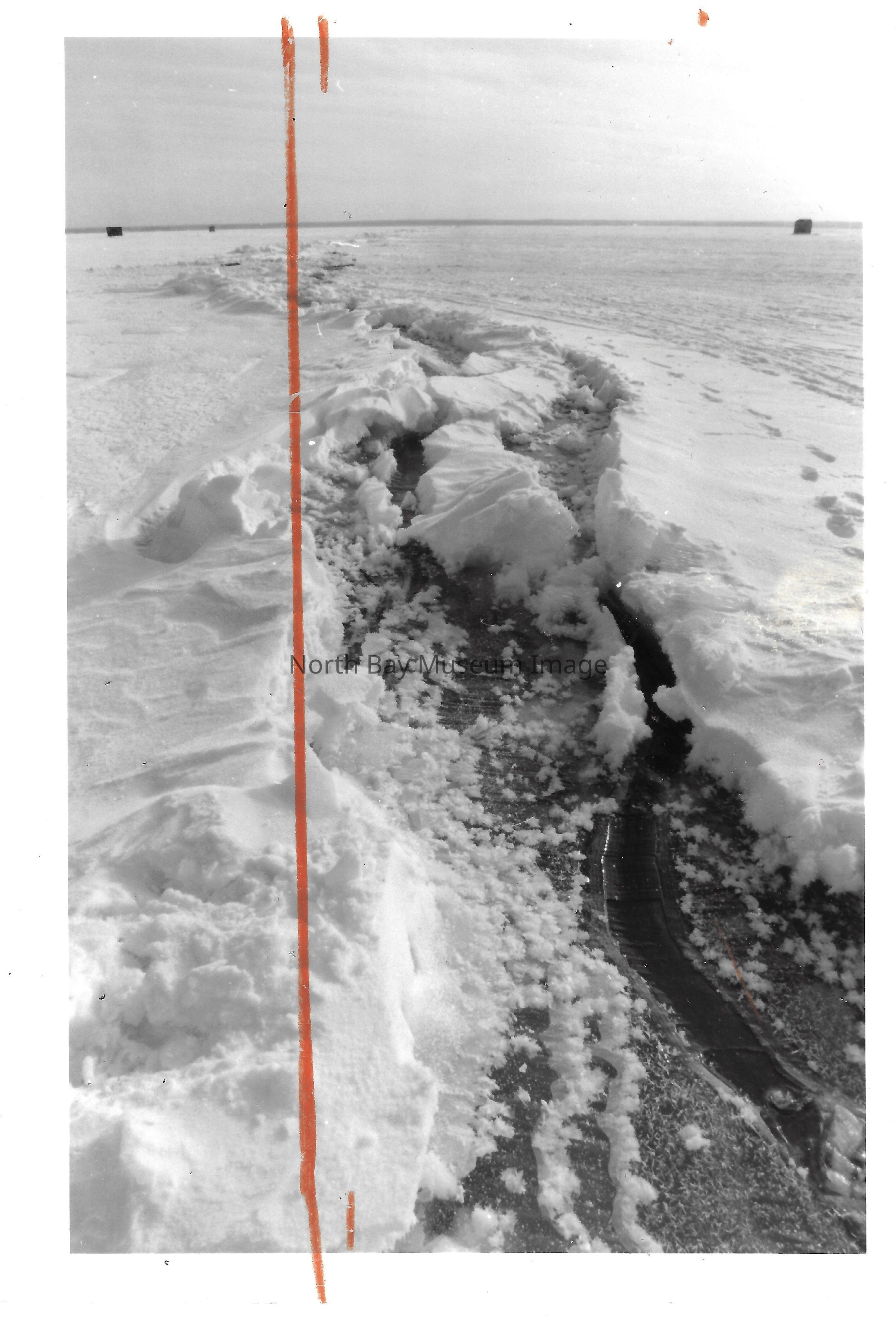 Photos of fishing huts on Lake Nipissing, an ice jam approaching government dock, and a plaque outlining its prehistoric geology.