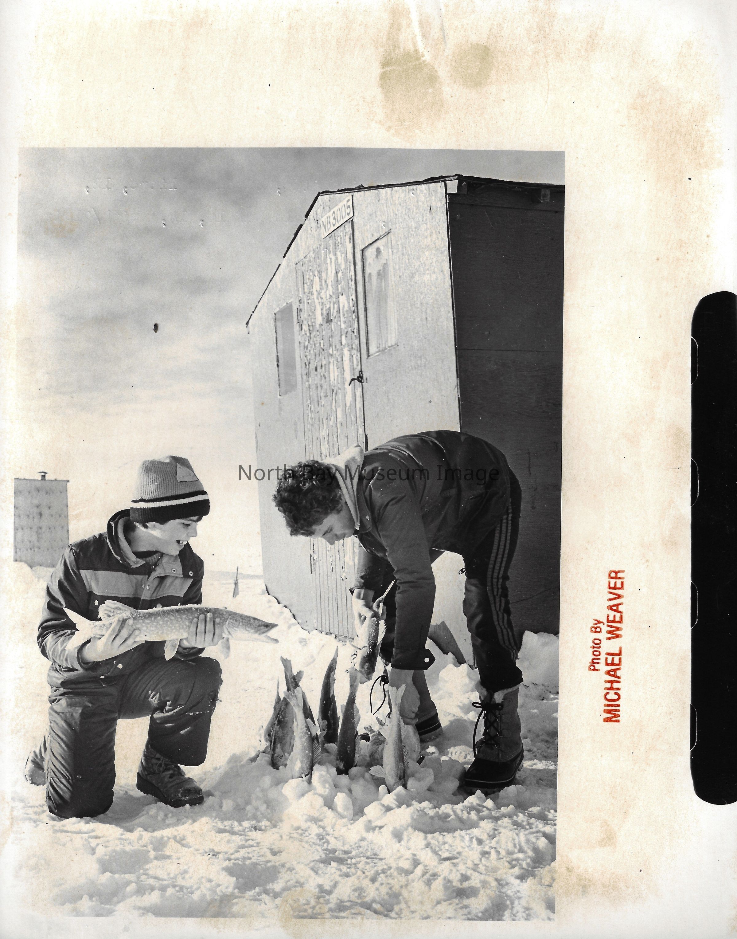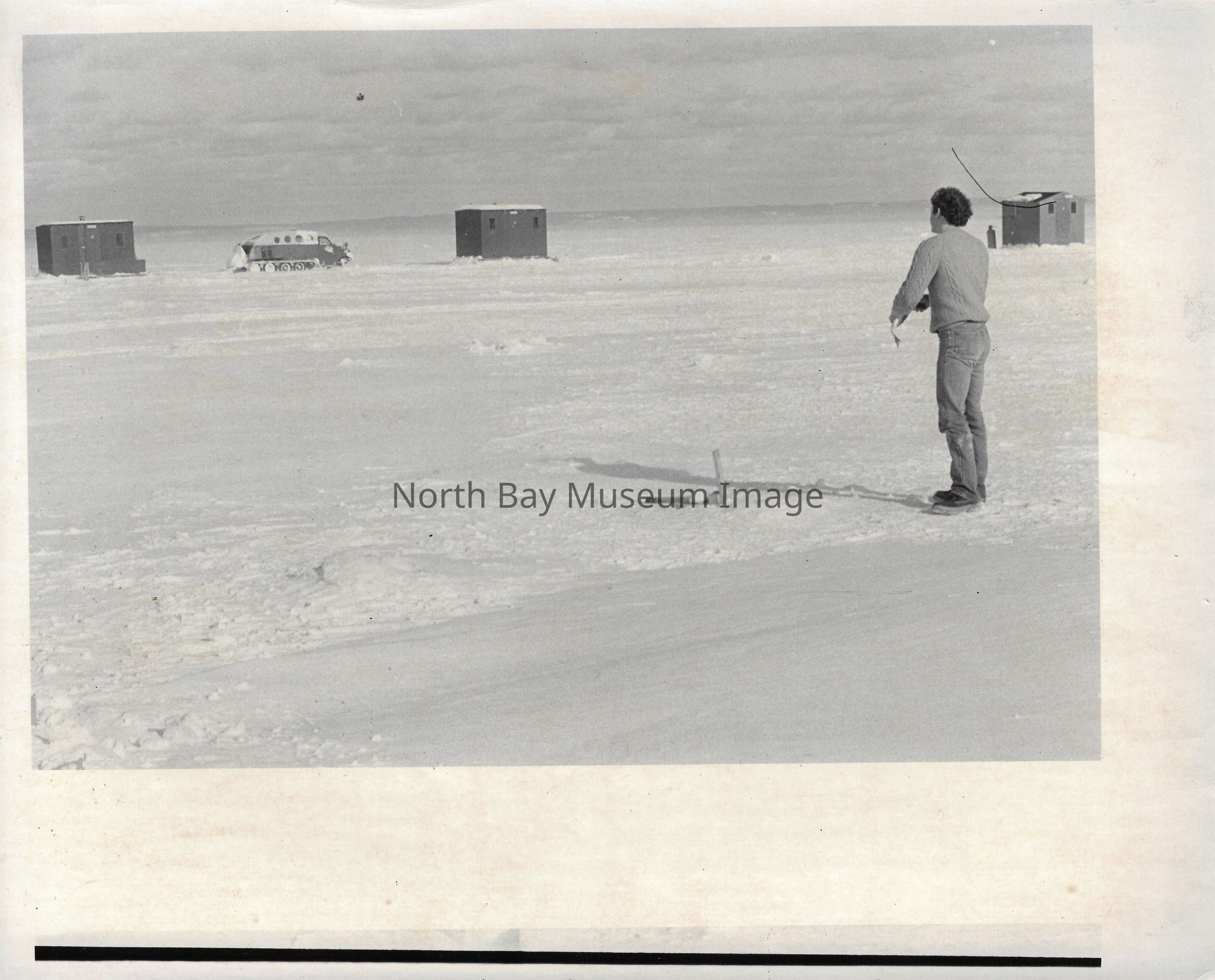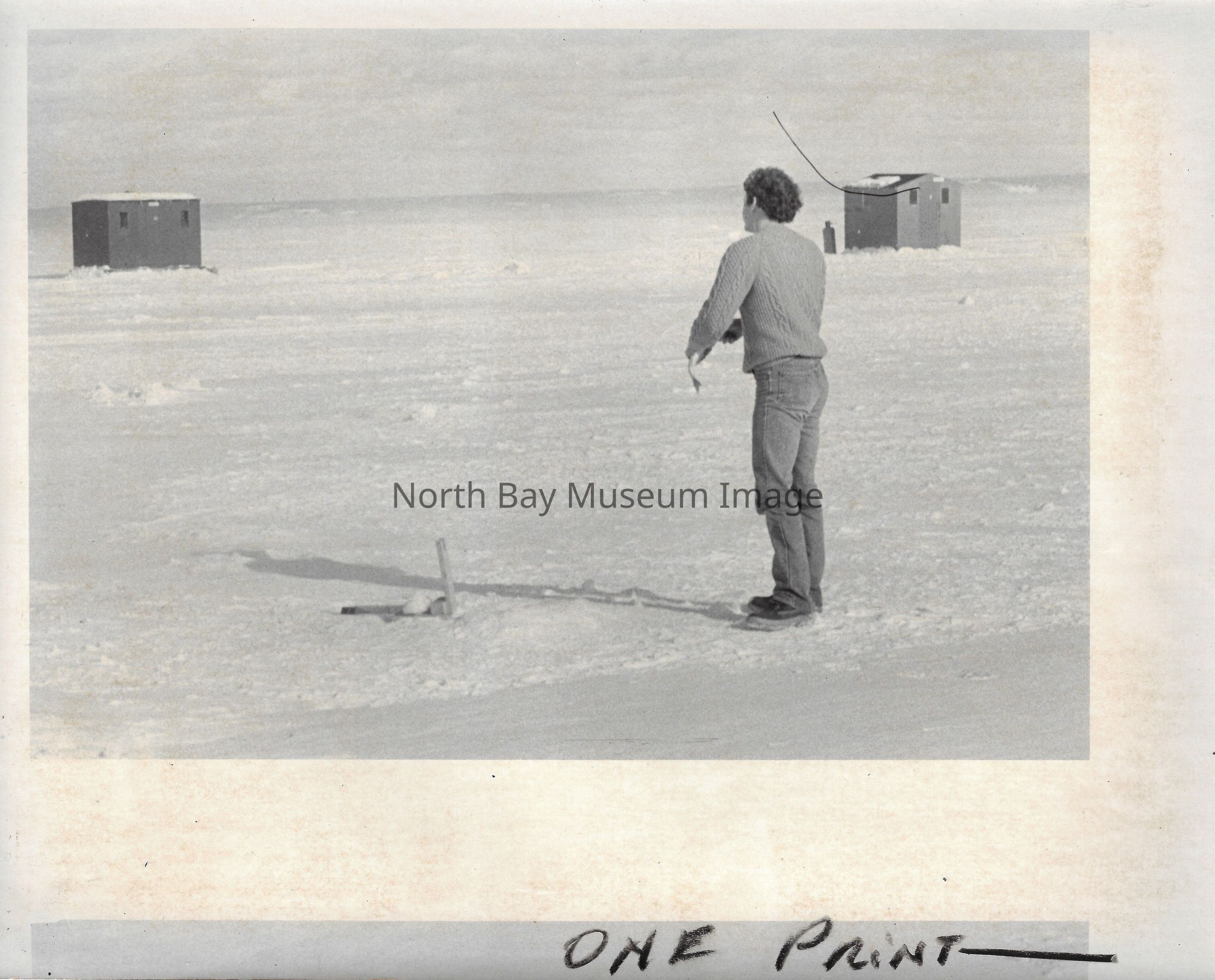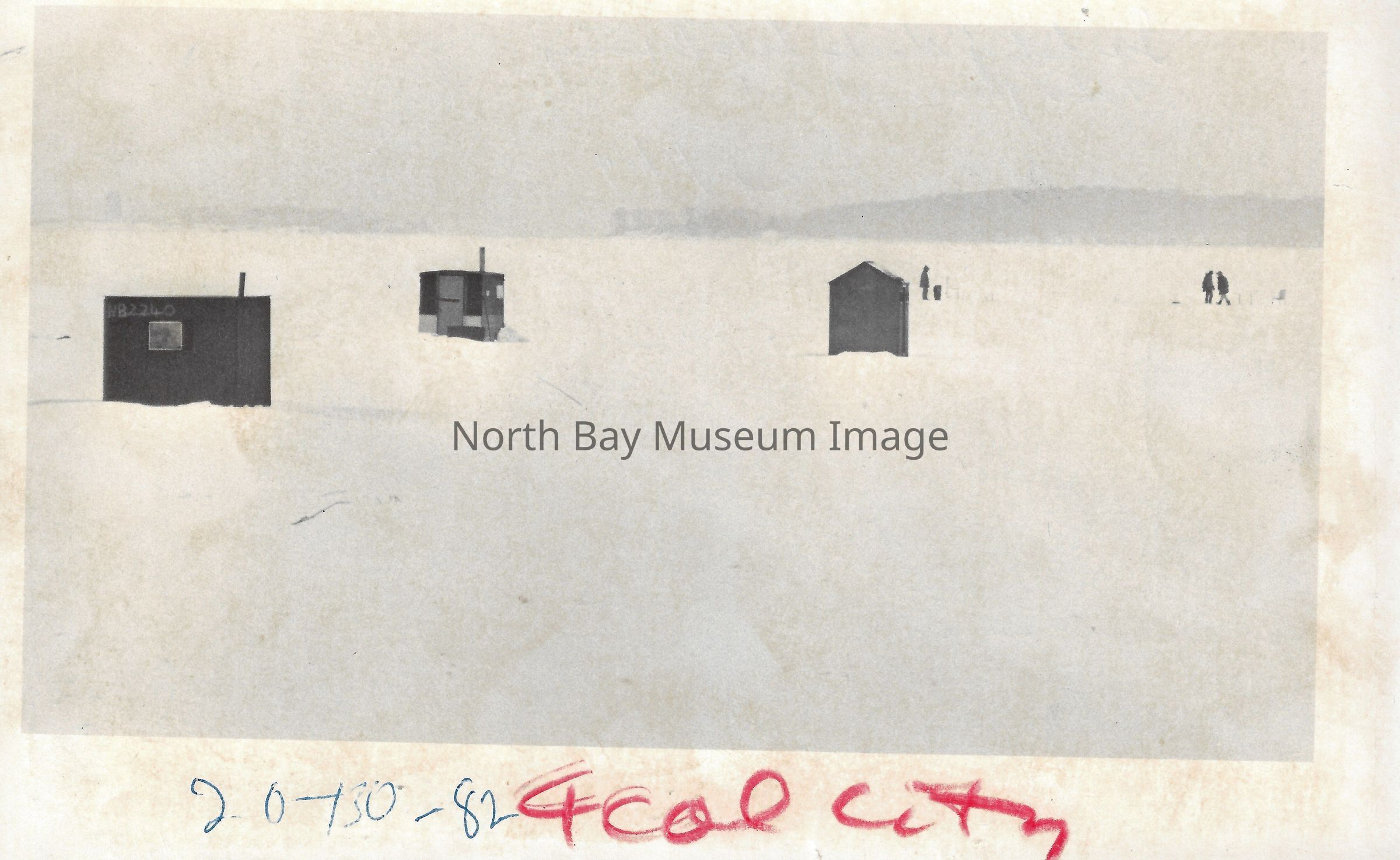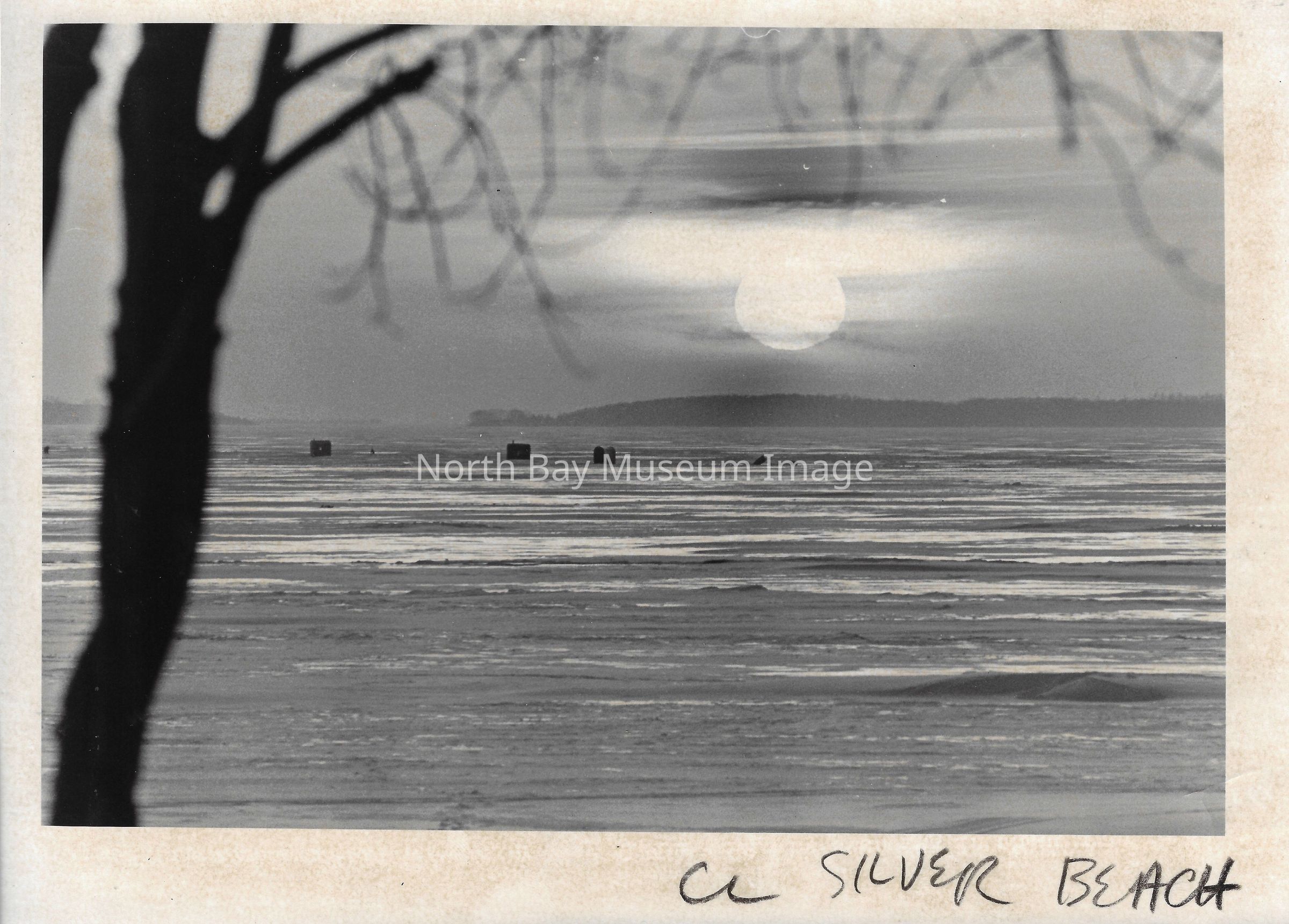 Photos of fishing huts on Lake Nipissing, an ice jam approaching government dock, and a plaque outlining its prehistoric geology.