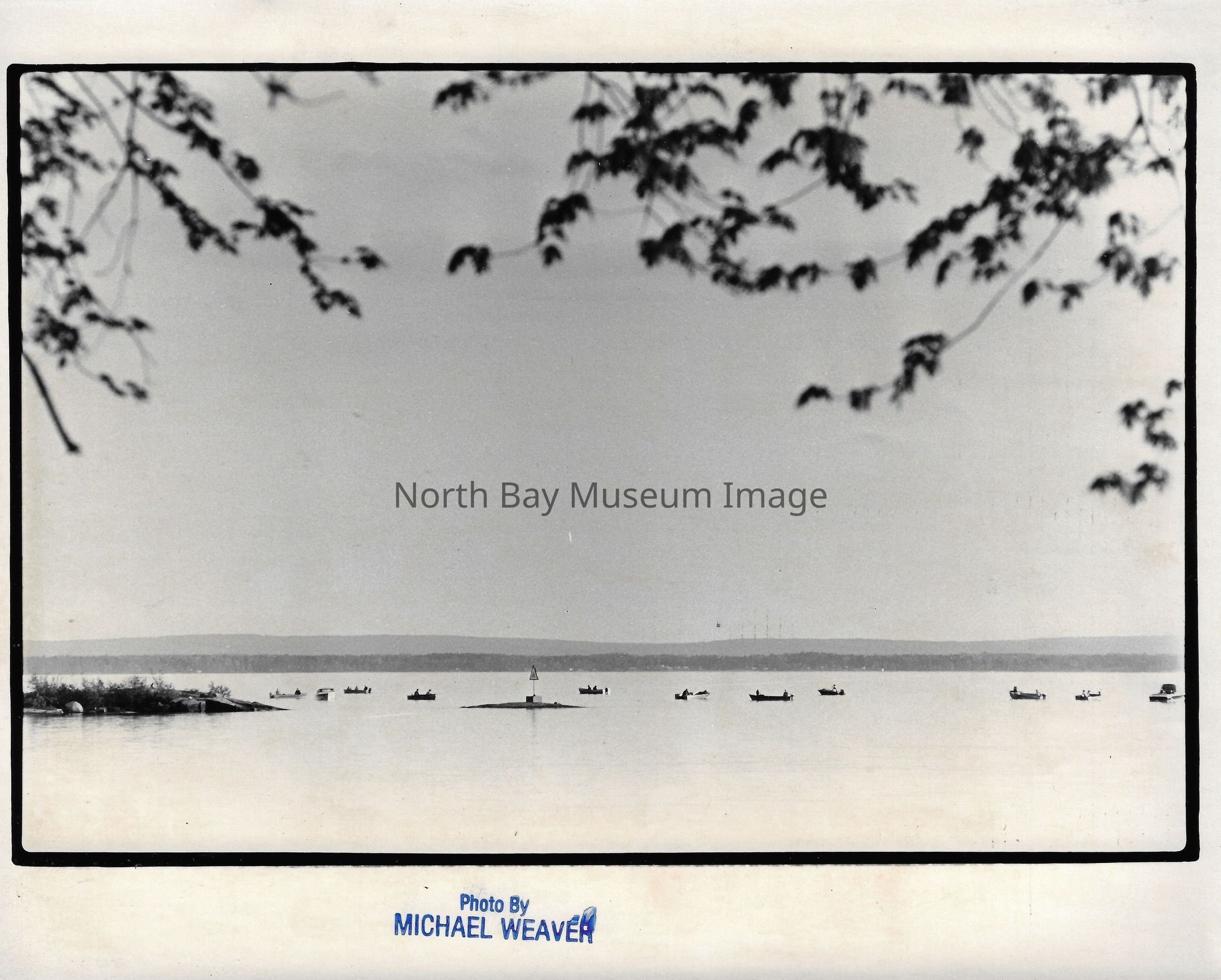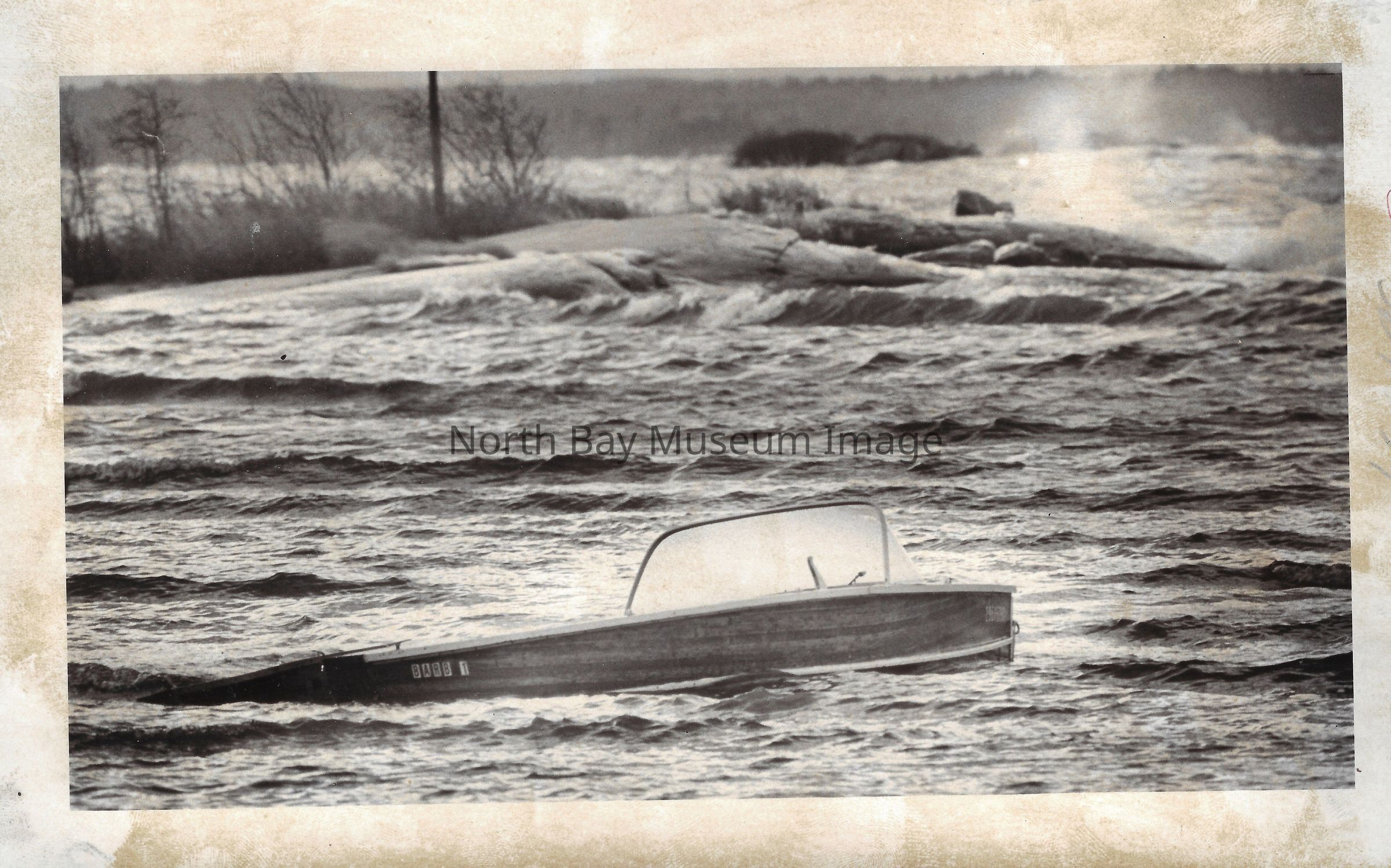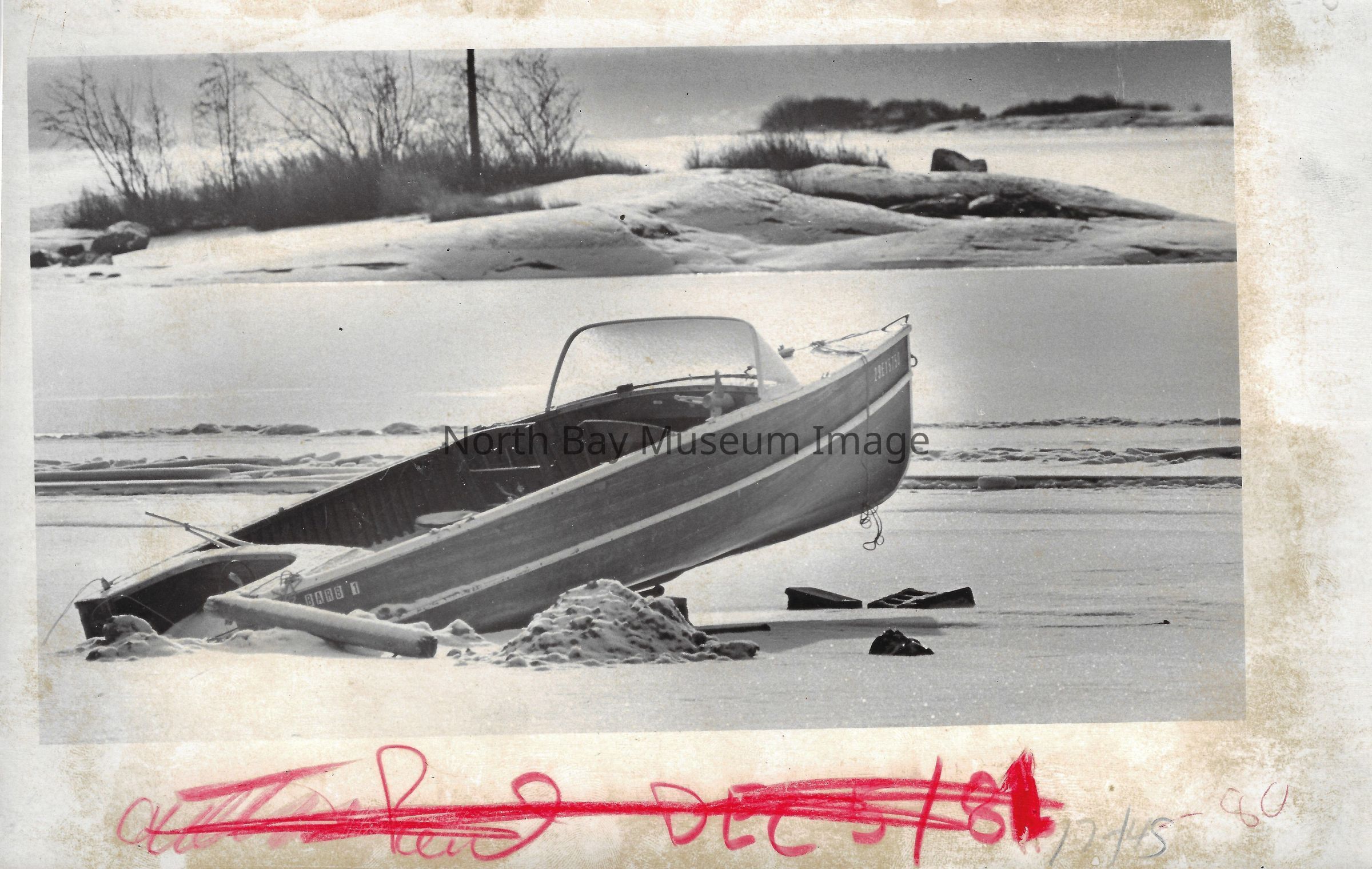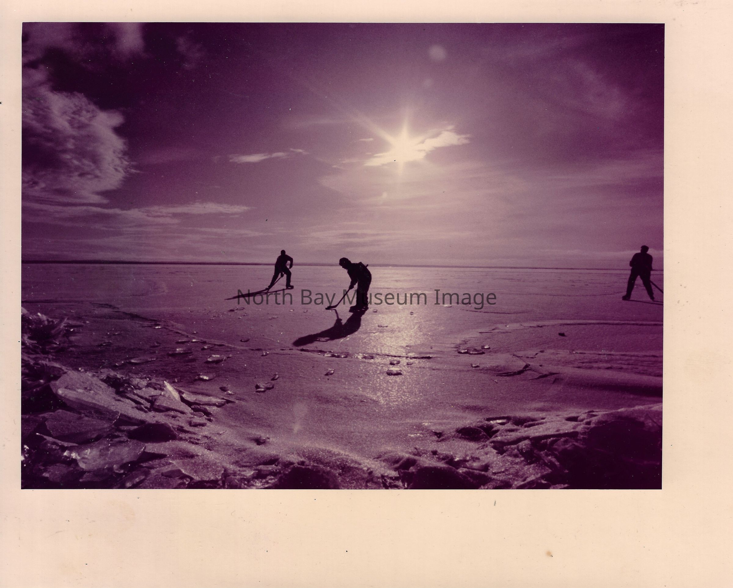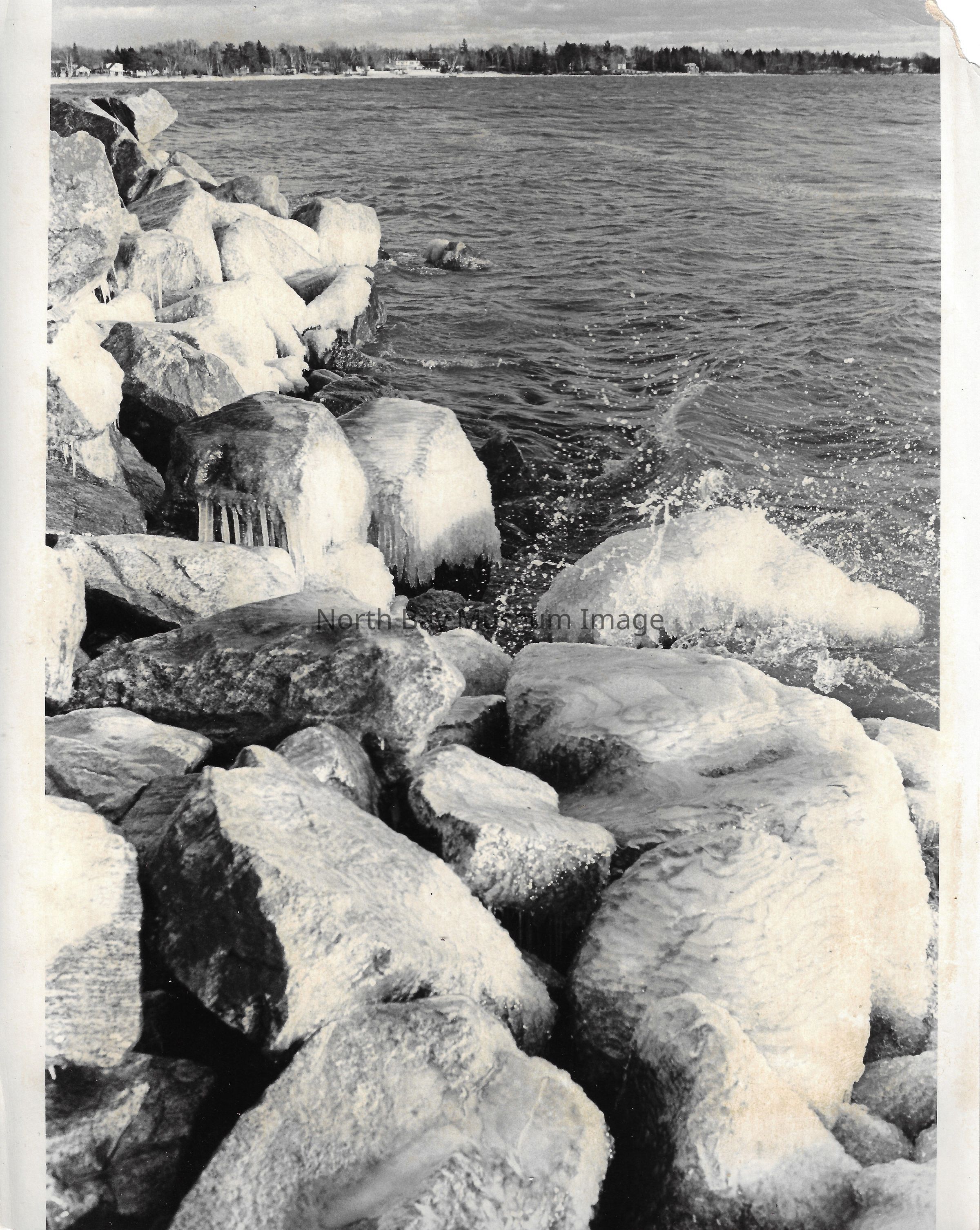 Photos of fishing huts on Lake Nipissing, an ice jam approaching government dock, and a plaque outlining its prehistoric geology.