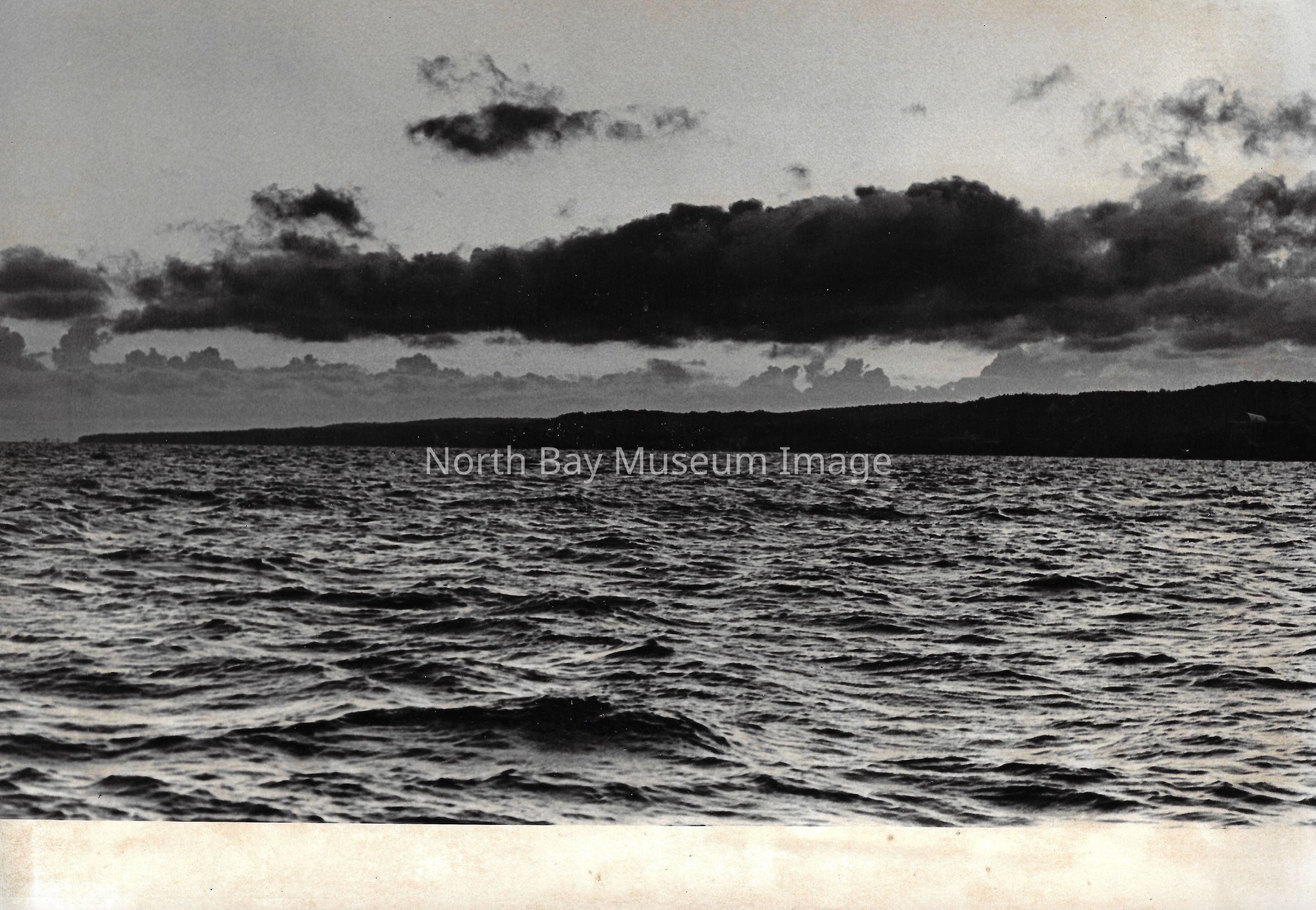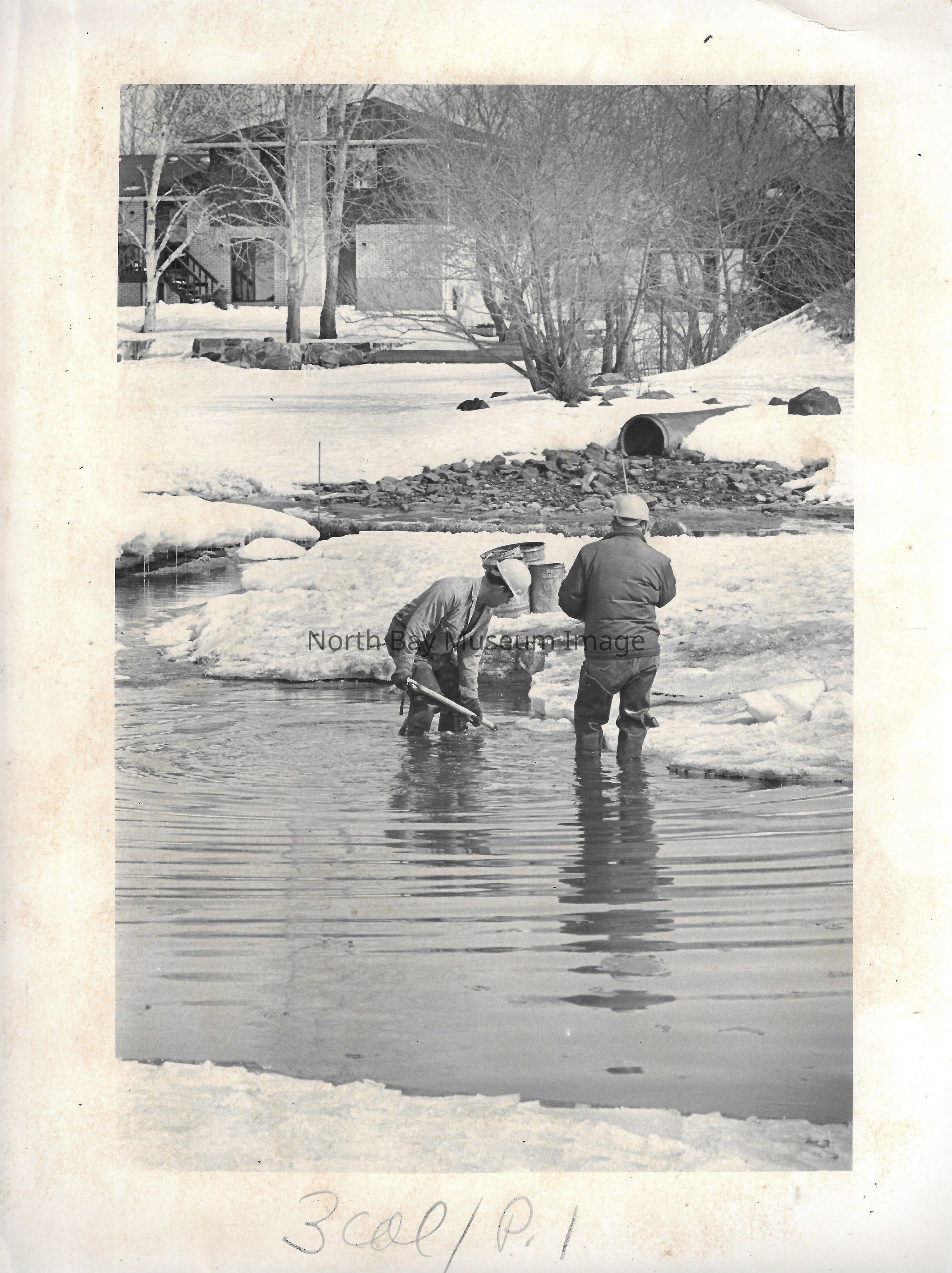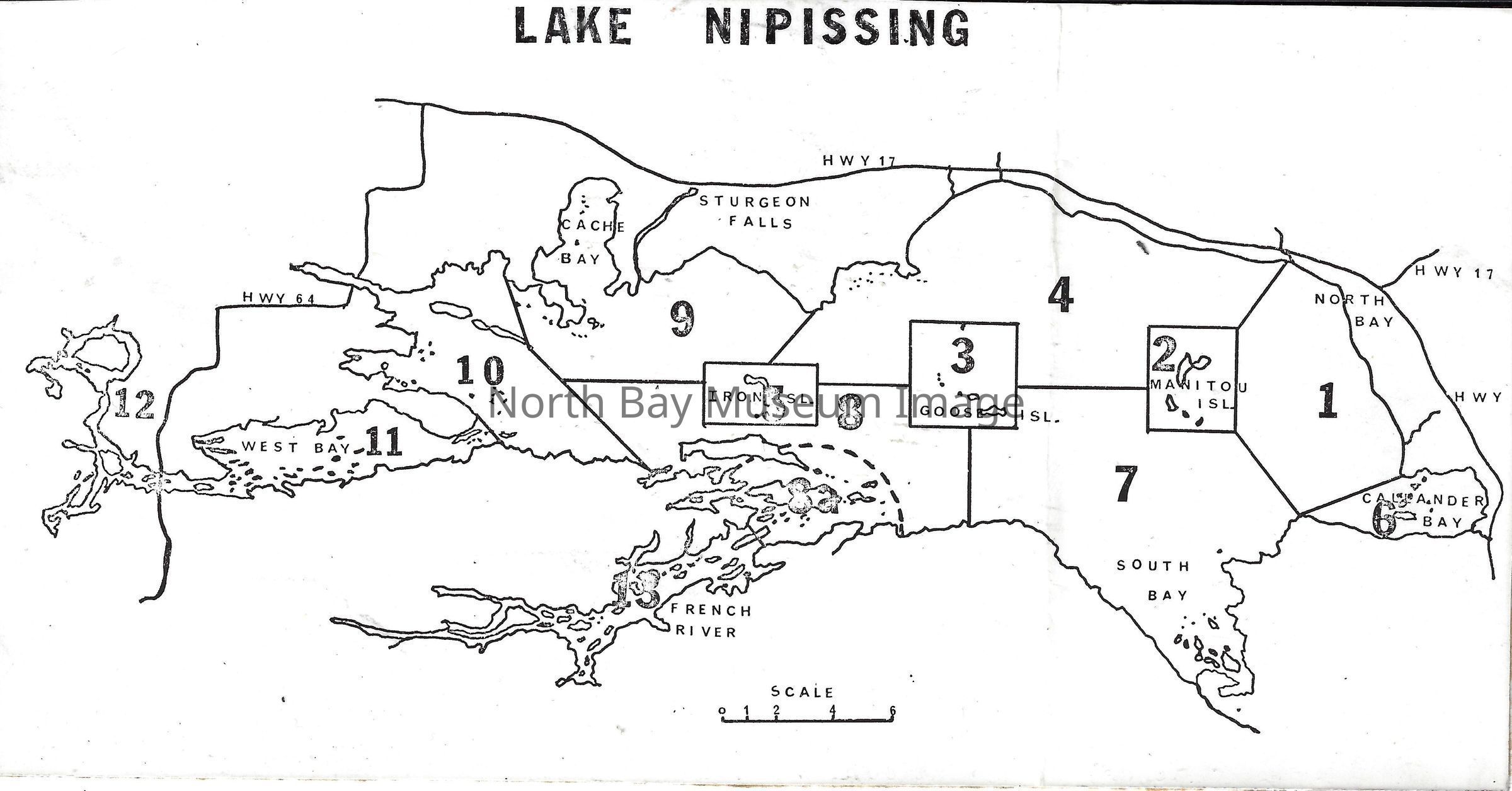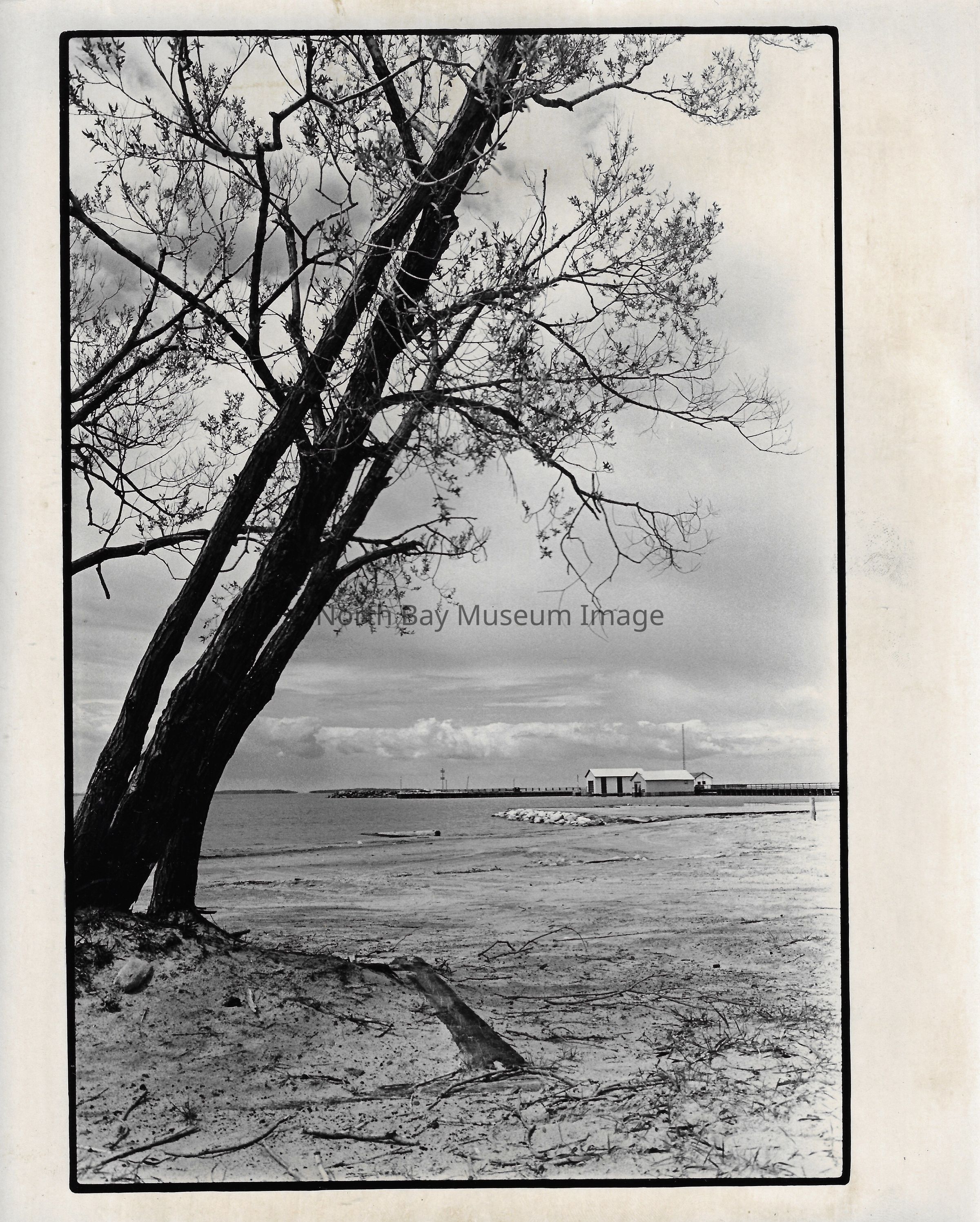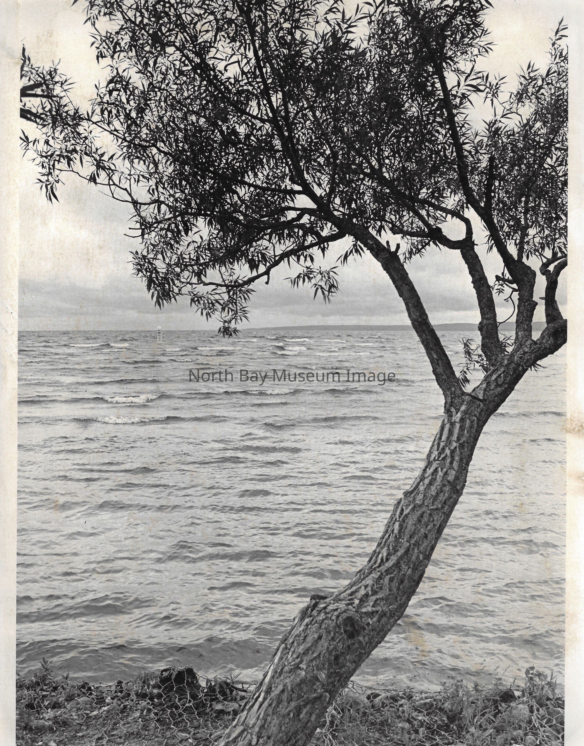 Photos of fishing huts on Lake Nipissing, an ice jam approaching government dock, and a plaque outlining its prehistoric geology.