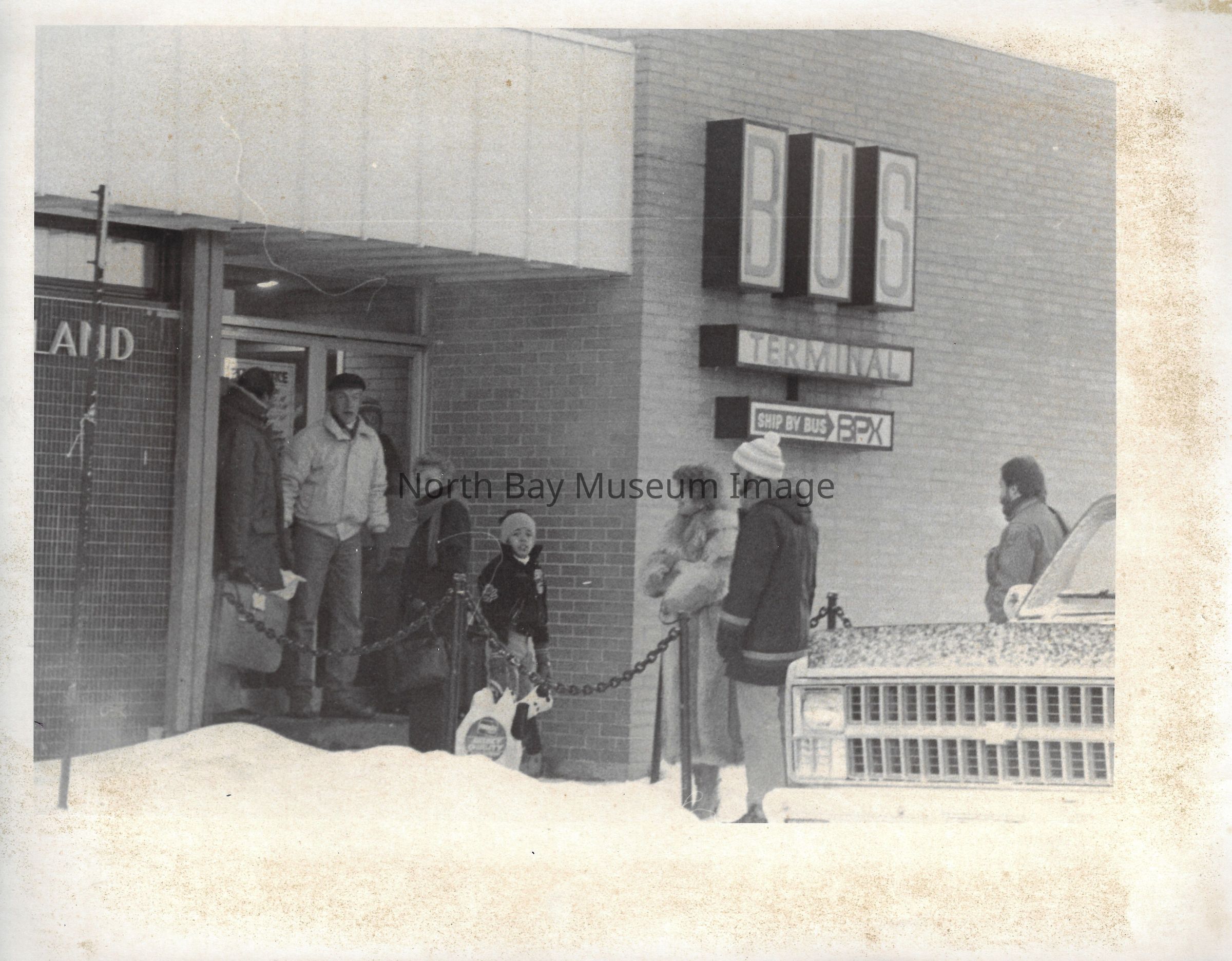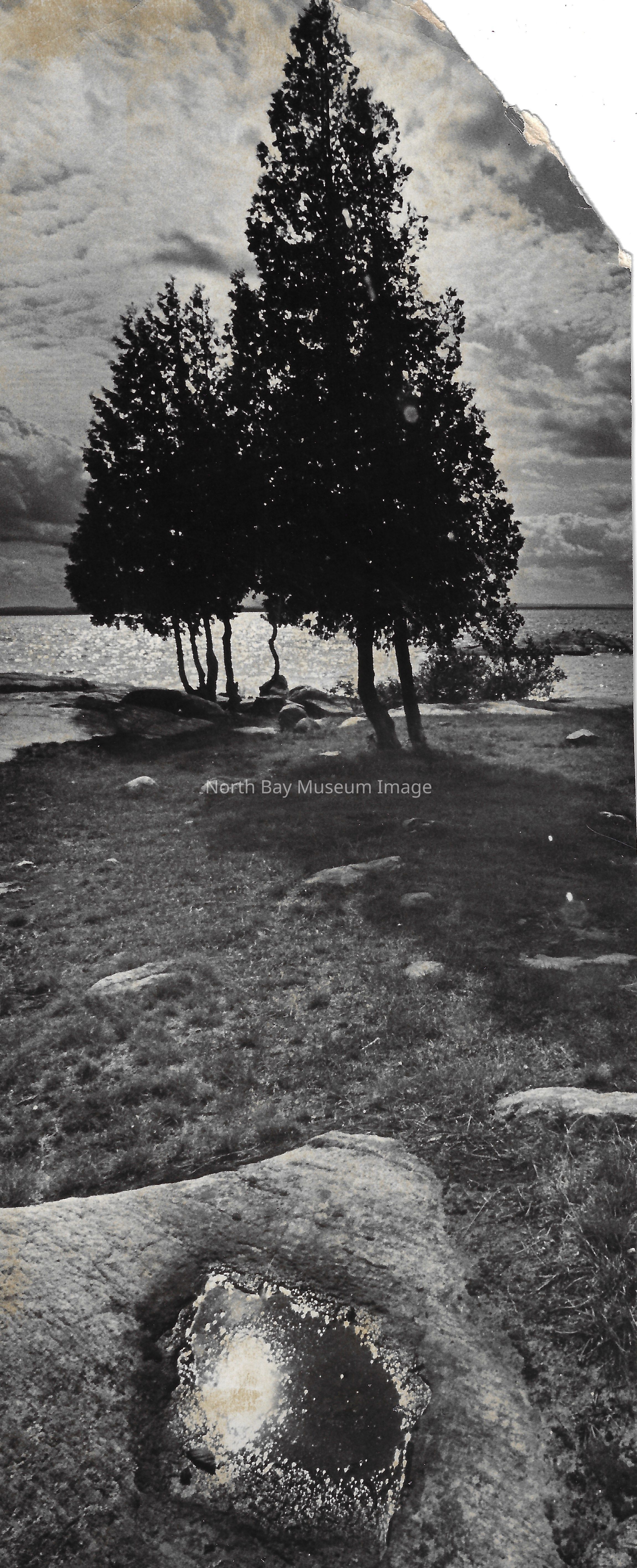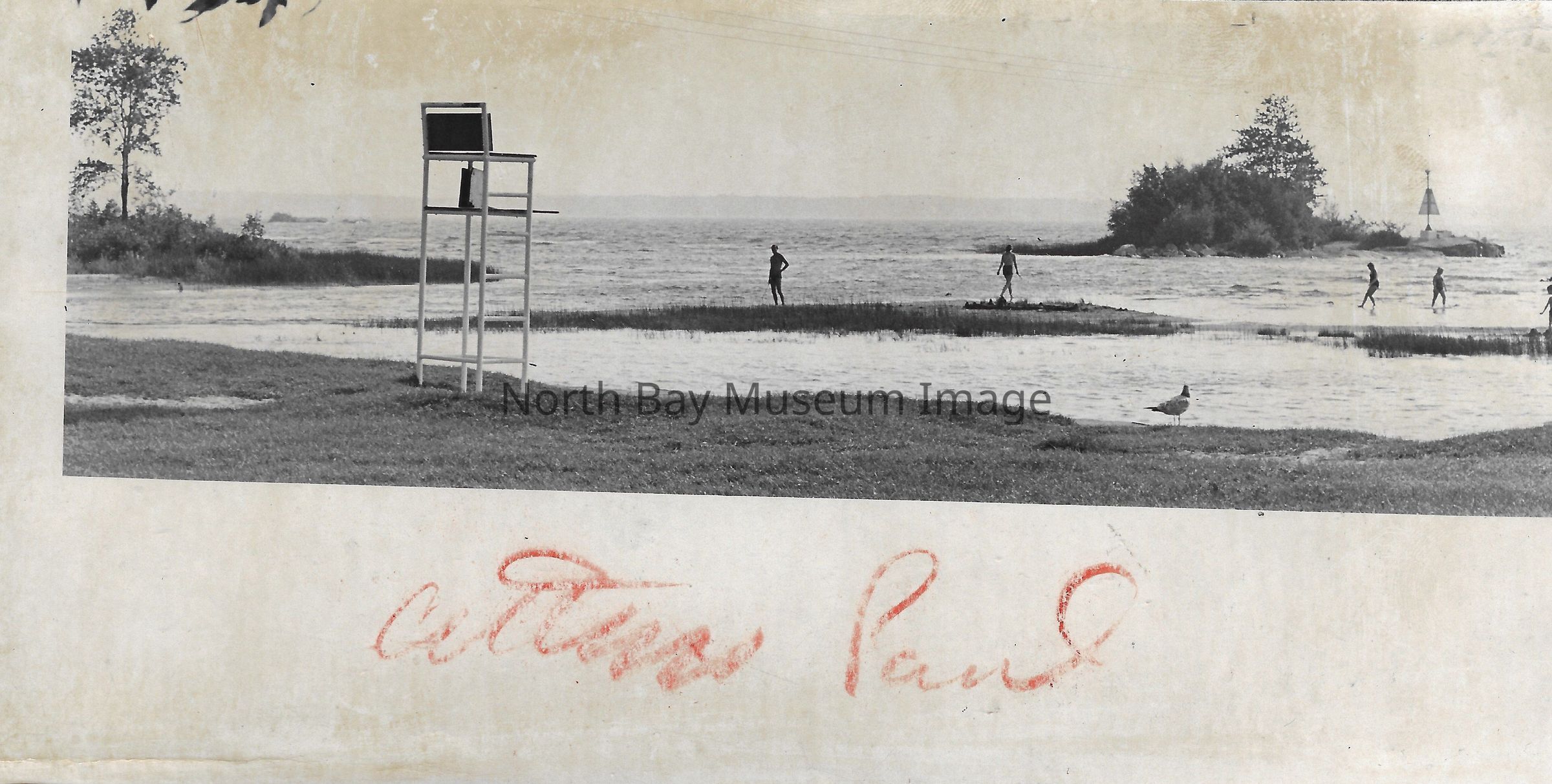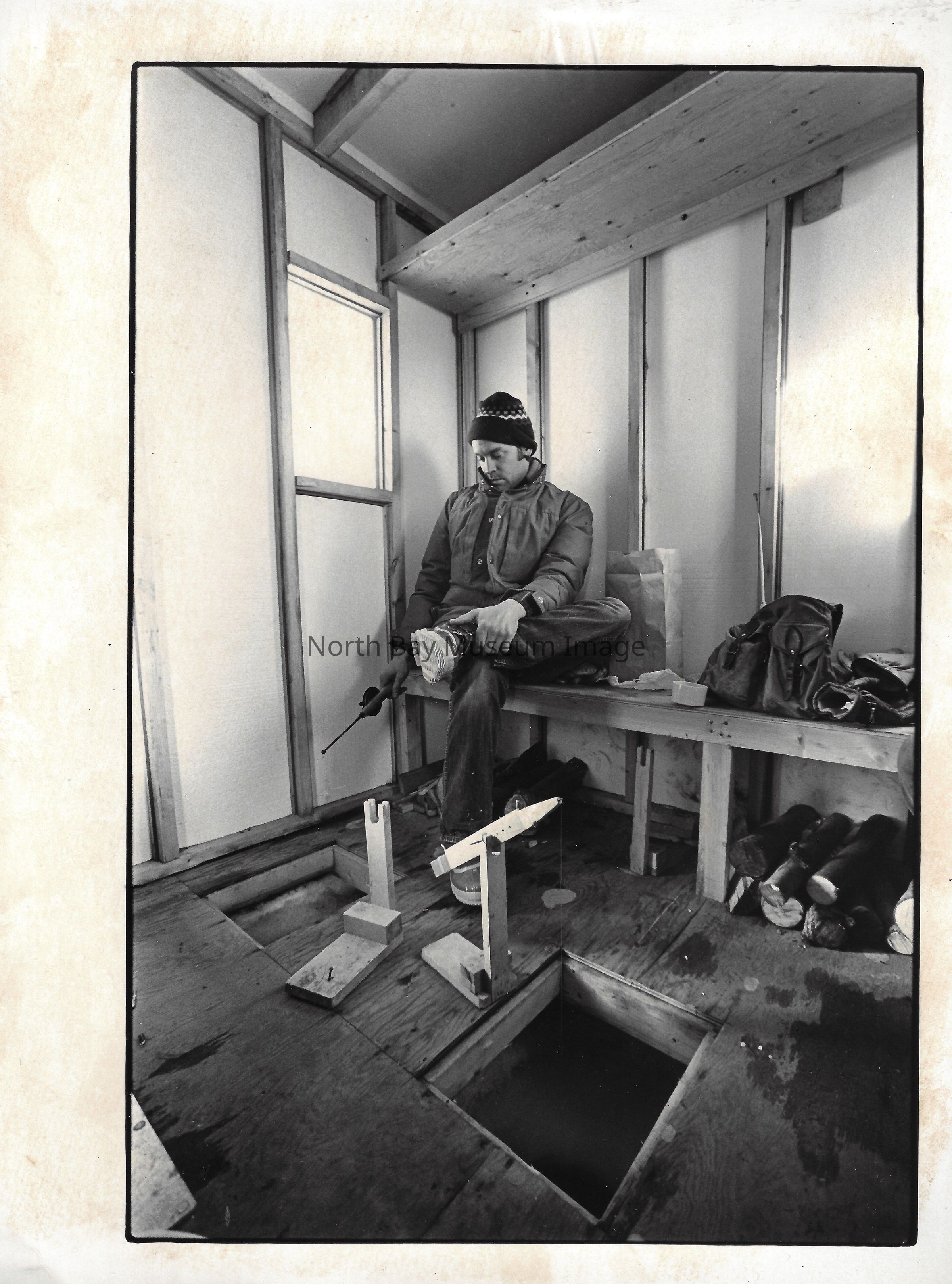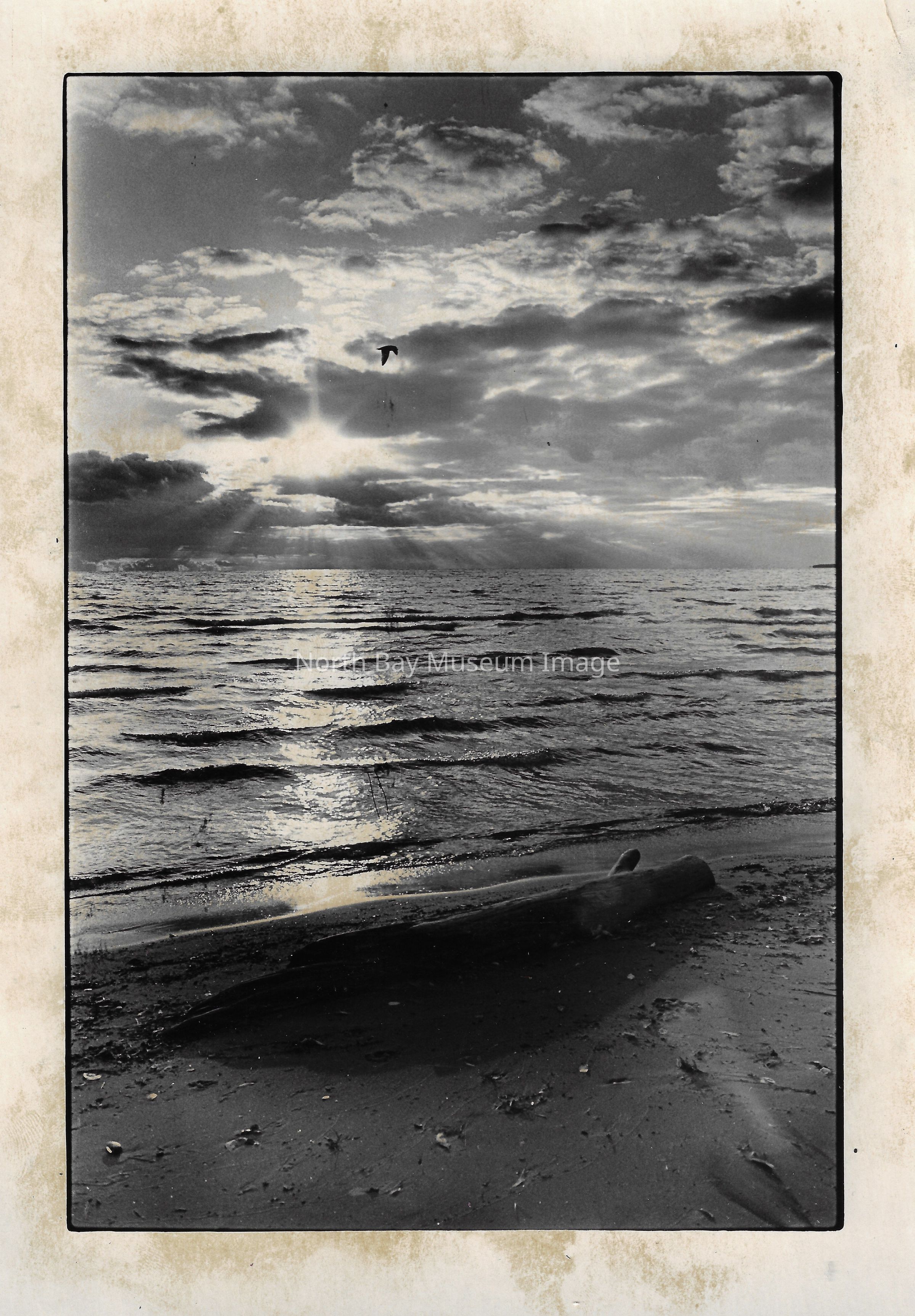 Photos of fishing huts on Lake Nipissing, an ice jam approaching government dock, and a plaque outlining its prehistoric geology.
