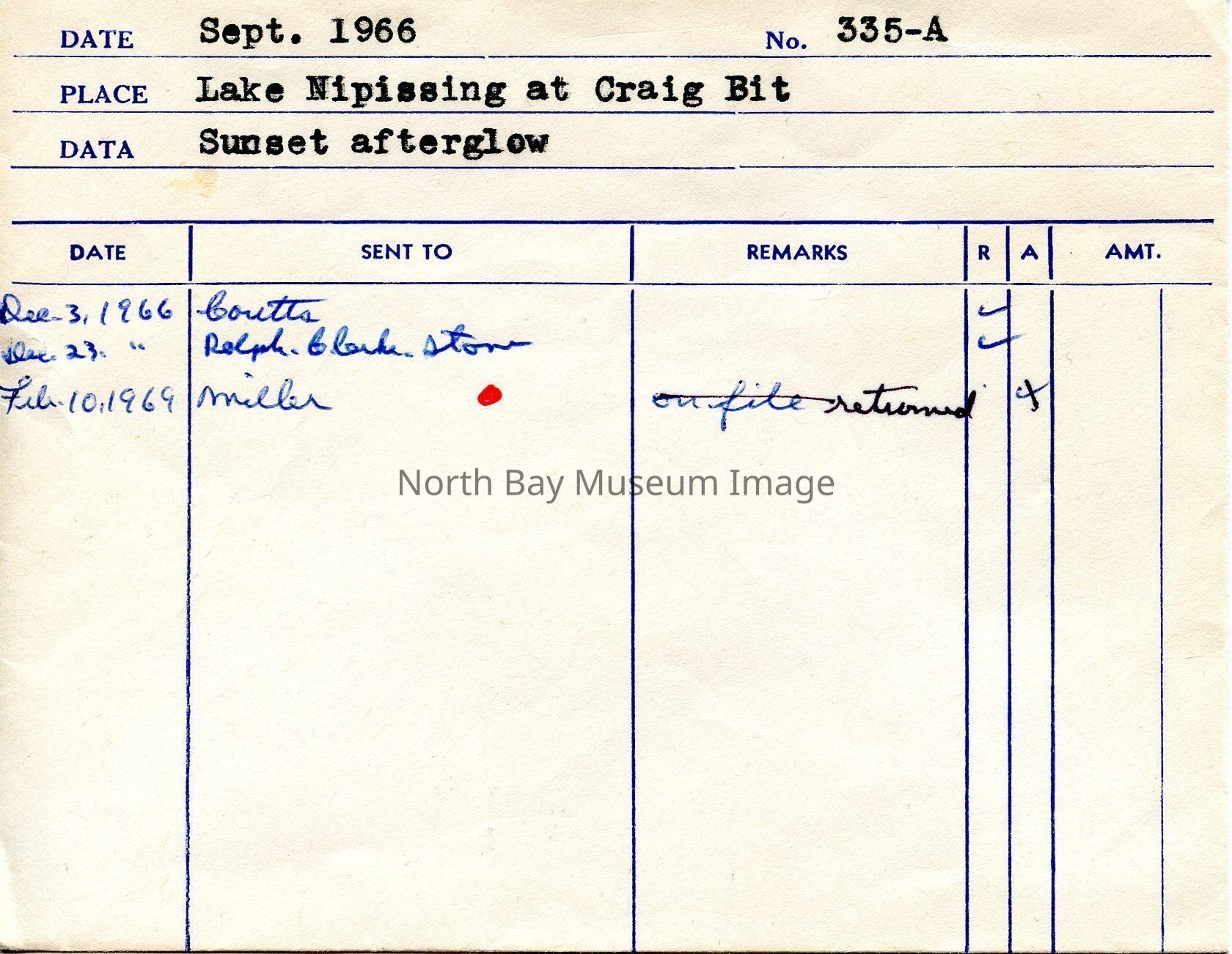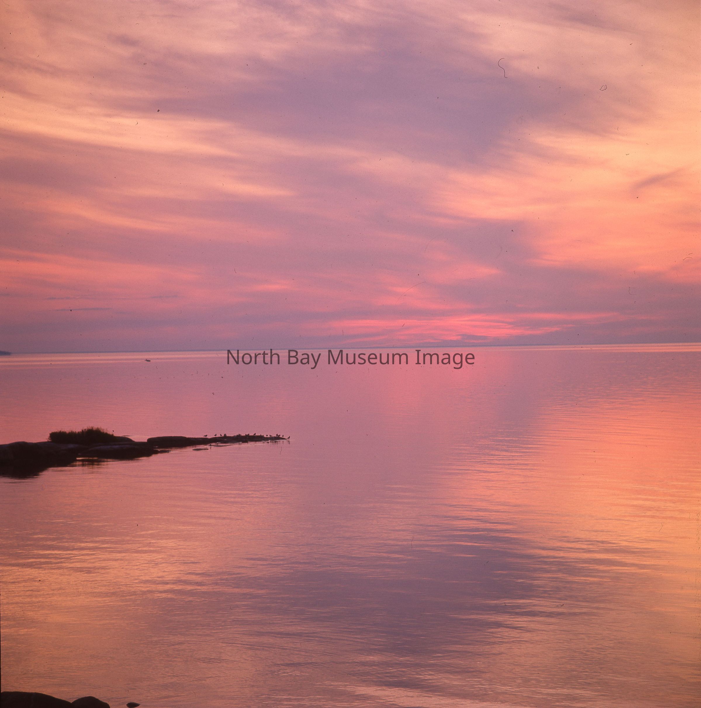 Envelope (a) containing negatives (b) of a Lake Nipissing at Craig Bit depiciting a sunset after glow. Photo consists of the after glow of a sunset on the water . A part of the Forder Collection. Publication dates on the envelope. Photographers original number of photographs was 335.Creator