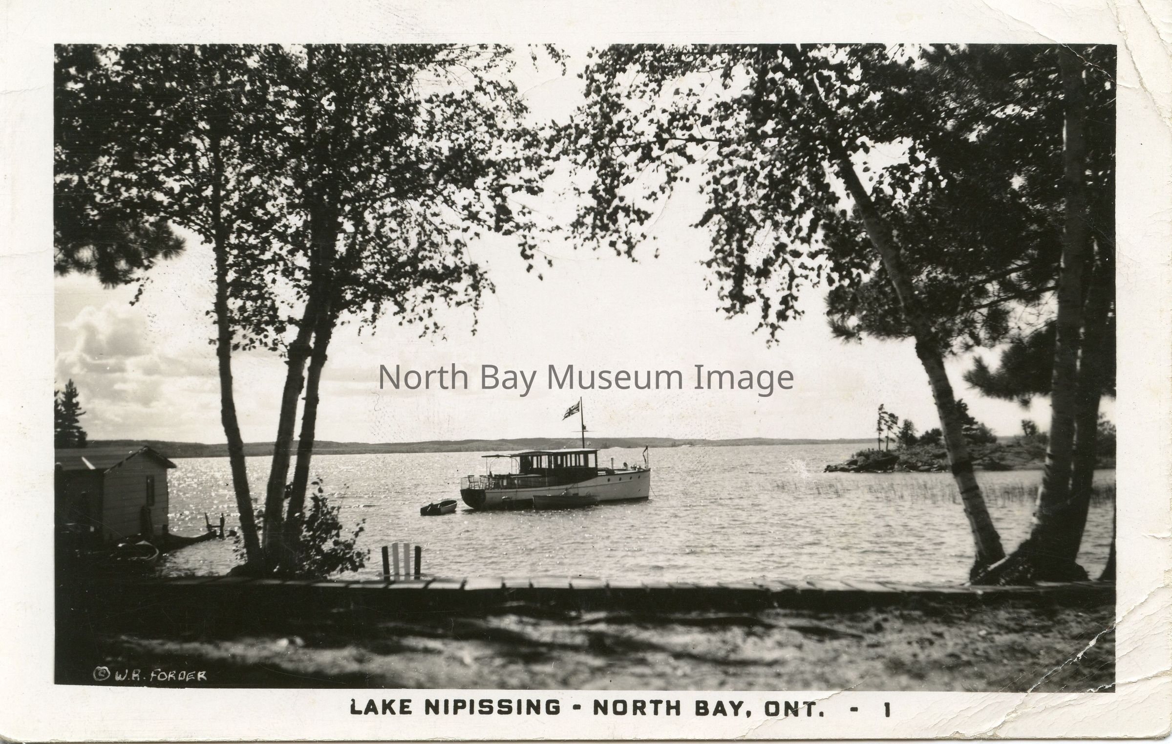 Postcard with B&W photo of Lake Nipissing. Boat in center of photo is flying Union Jack, towing a small rowboat with a 3rd boat alongside